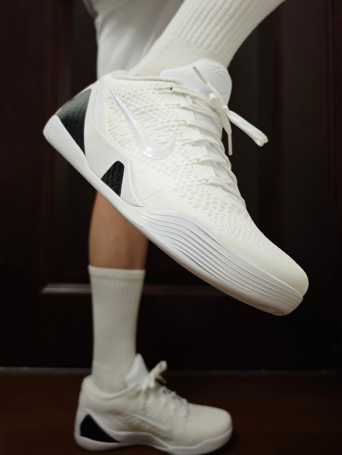 最新复刻的科比9代,这双是精英版,还有一双EM版(也入手了,过两天发出来)。相对而言,精英版在做工、材质会更好,编织鞋面+碳板支撑,初上脚的舒适度也会更高。当然相应的发售价也更高。 颜值上来看,我个人认为这双真的是天花板那一档了。