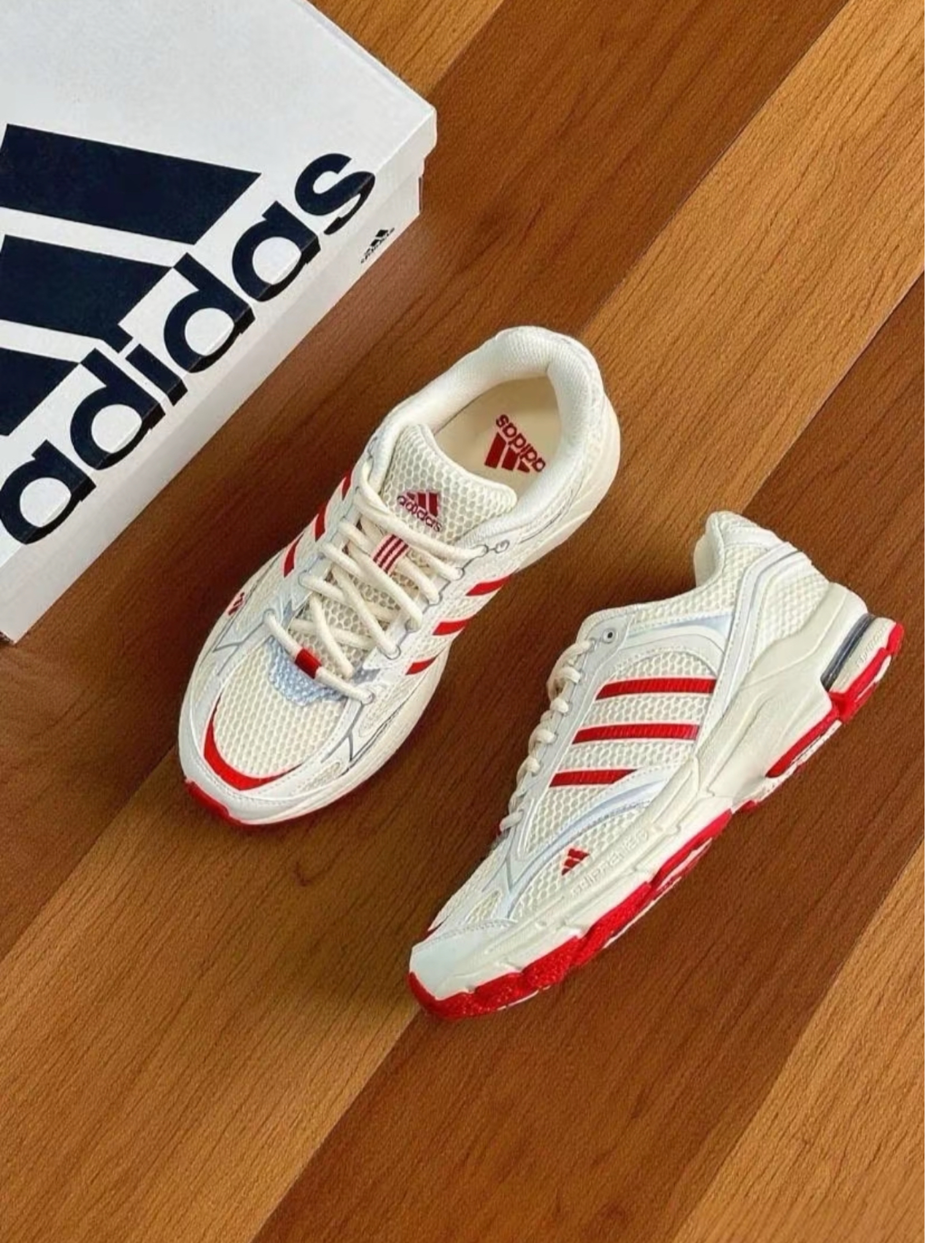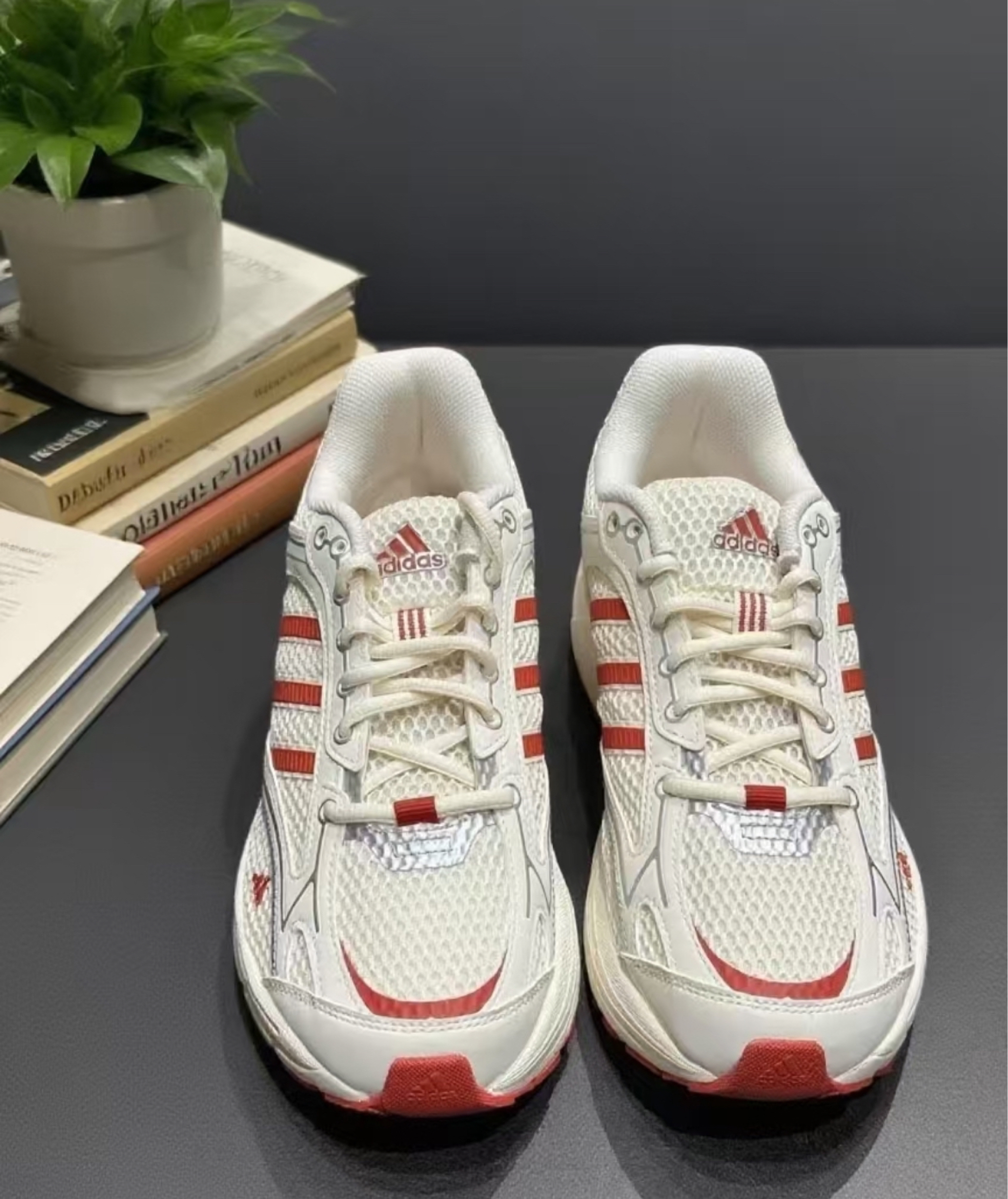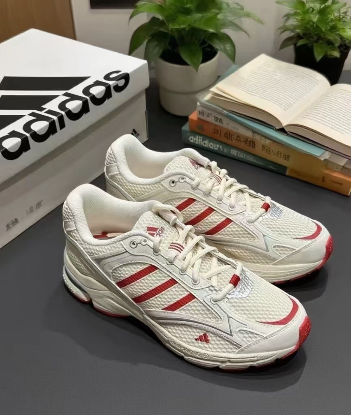 先说这颜值,白底色超干净,配上亮眼的红色撞色和银色细节,复古感里带着点活力,一点不单调。低帮设计利落清爽,夏天穿也不压脚腕,男女同款随便搭——运动裤、牛仔短裤、甚至配个简单的T恤裙,都有种随性又时髦的感觉,日常出街或轻运动都超可。 脚感更是惊喜!鞋面是PU织物加合成革的组合,透气不闷脚,还挺有质感。作为跑步鞋,它的减震效果很在线,踩上去软硬度刚好,不会塌塌的没支撑,走久了、跑几步都很稳。鞋底看着...