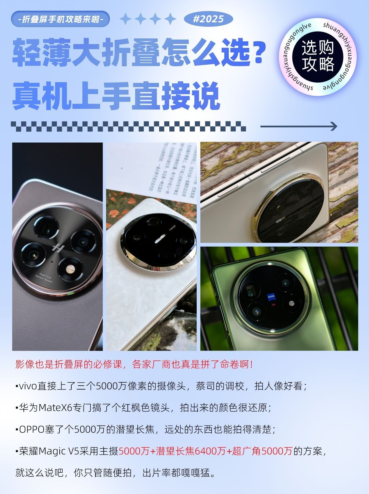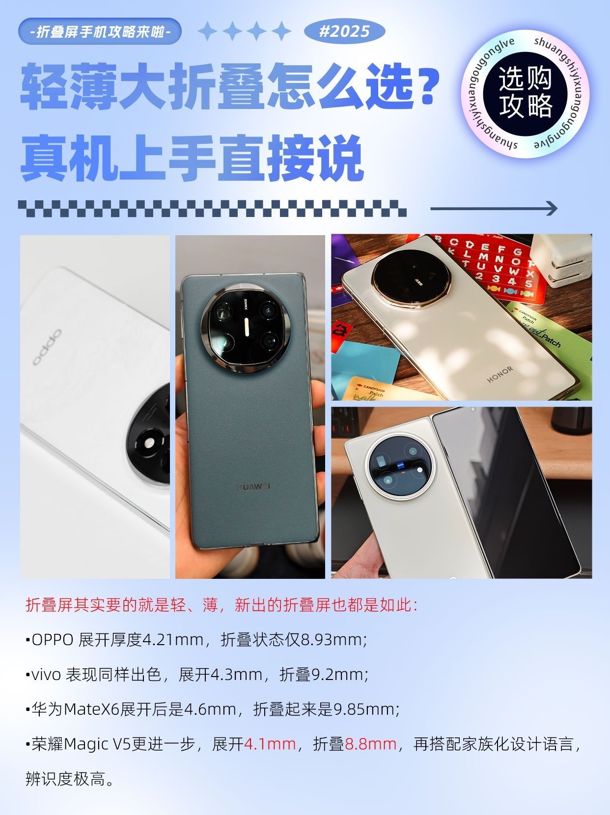 vivo X Fold5、OPPO Find N5、华为Mate X6荣耀Magic V5这四款折叠屏手机谁的配置谁最硬呢?今天从拍照、续航、性能等能几个方面,给大家好好对比一下。 折叠屏其实要的就是轻、薄,新出的折叠屏也都是如此: ·OPPO 展开厚度4.21mm,折叠状态仅8.93mm; ·vivo 表现同样出色,展开4.3mm,折叠9.2mm; ·华为MateX6展开后是4.6mm,折叠起...