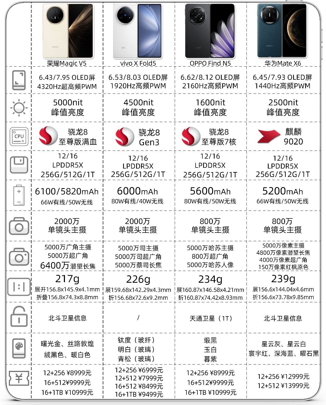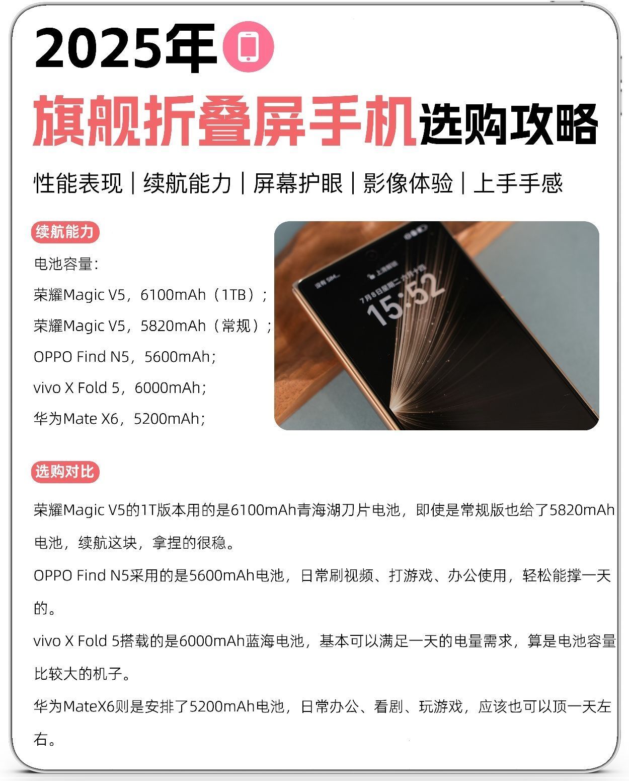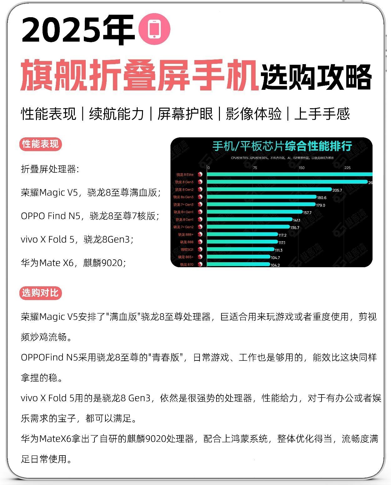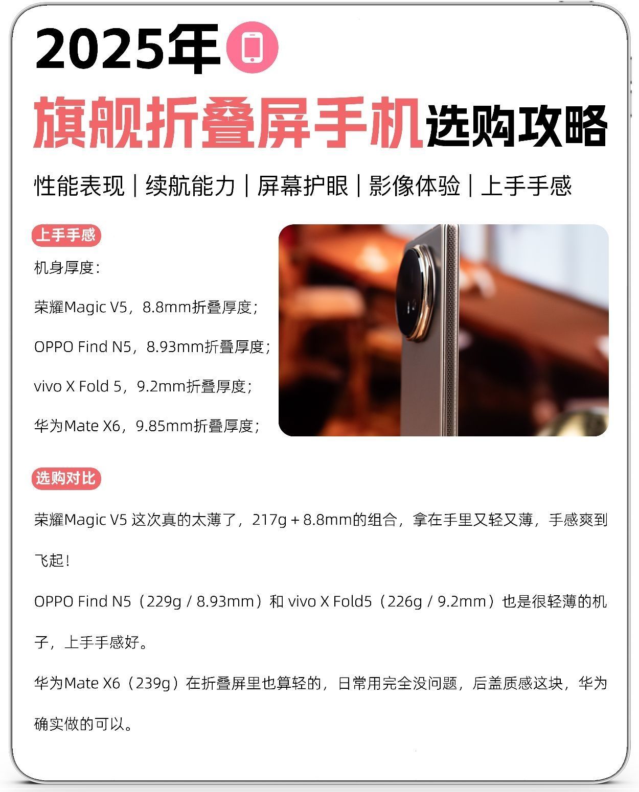 趁着周末有空,做一个保姆级旗舰折叠屏选购攻略,都是目前的热门机型,荣耀Magic V5、vivo X Fold5、OPPO Find N5 、华为MateX6,希望可以帮到正在犹豫不决的小伙伴们! #性能表现 荣耀Magic V5安排了"满血版"骁龙8至尊处理器,巨适合用来玩游戏或者重度使用,剪视 频炒鸡流畅。OPPOFind N5采用骁龙8至尊的"青春版",日常游戏、工作也是够用的,能效比这块...