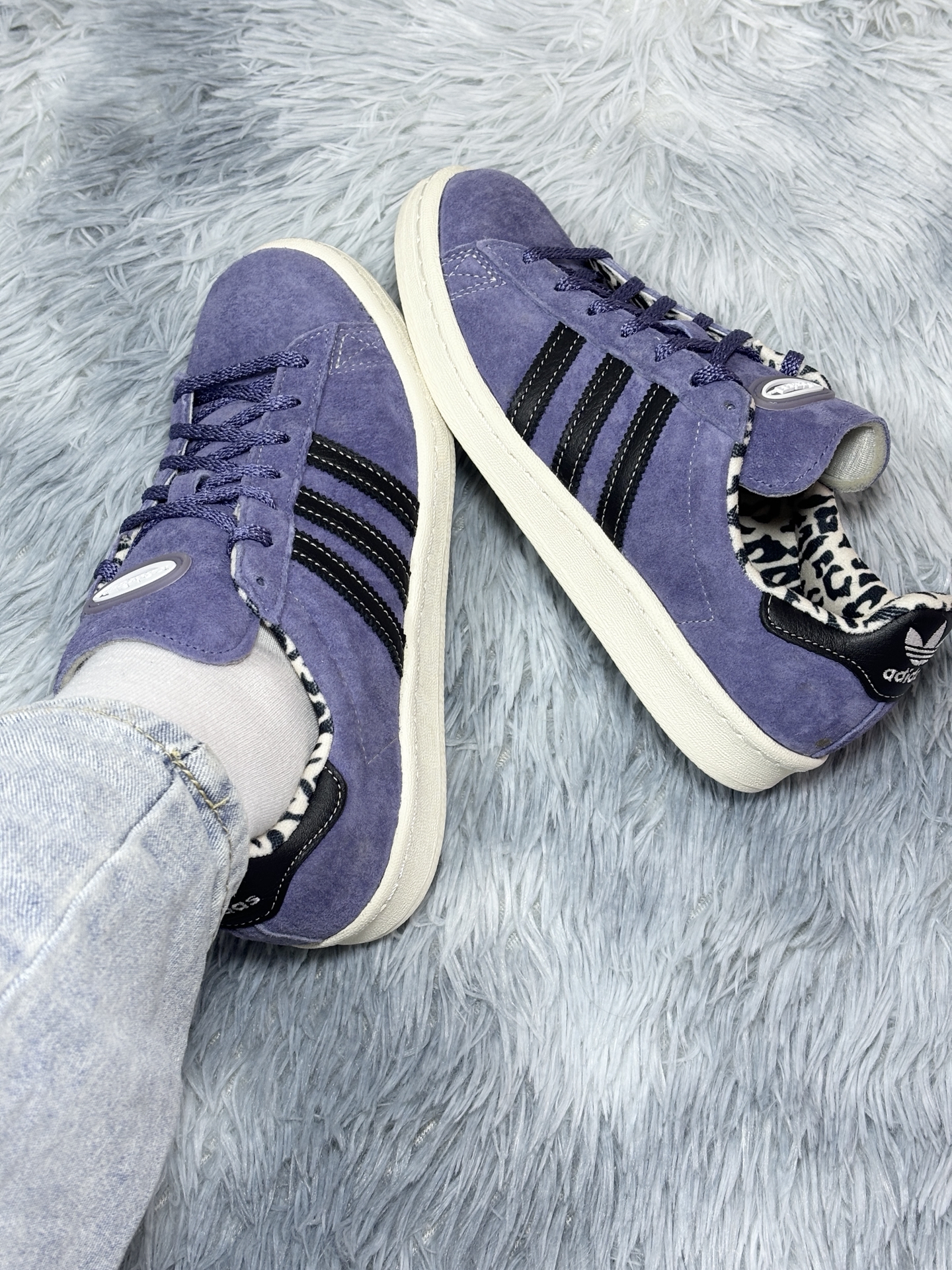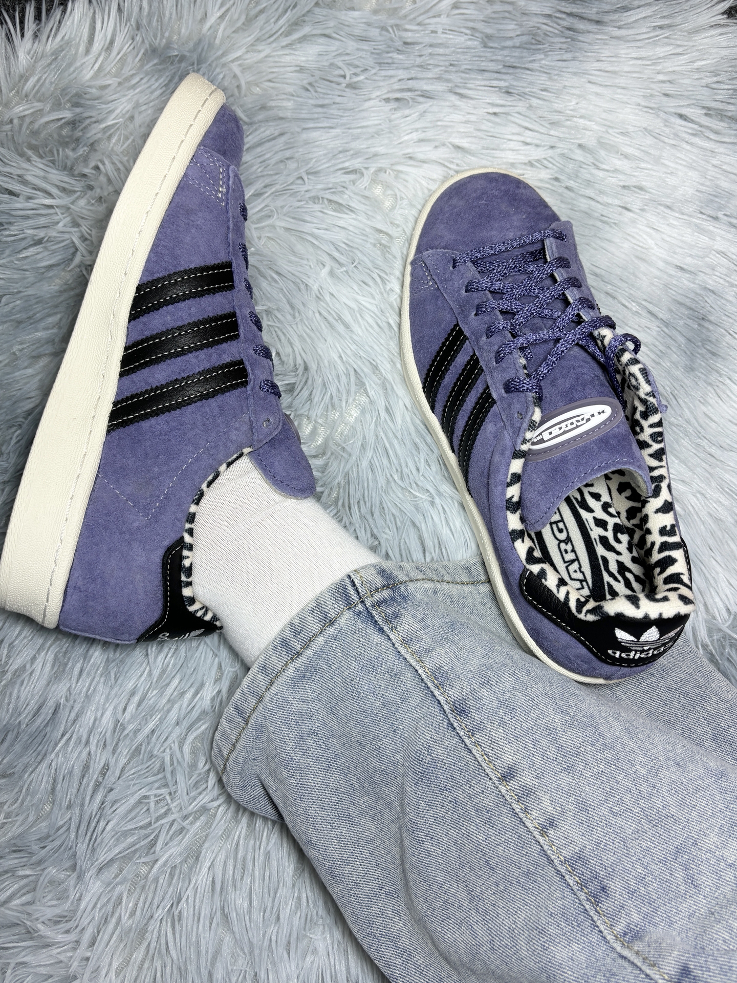 挖到双有点特别的阿迪鞋👟 紫色翻毛皮很有复古感,鞋里的豹纹衬里,乍一看挺吸睛,和浅色牛仔裤搭还挺和谐~ 说点真实感受,翻毛皮是好看,但打理起来真费神,沾点灰或者不小心泼到水,得小心伺候着清洁,懒人劝退⚠️ 鞋码我穿着略偏大,建议选小半码。舒适度嘛,日常走路还行,长时间逛展会有点累脚🦶 优点就是设计独特,不容易撞款,追求小众风格的朋友可以直接冲,缺点也明摆着,护理麻烦。