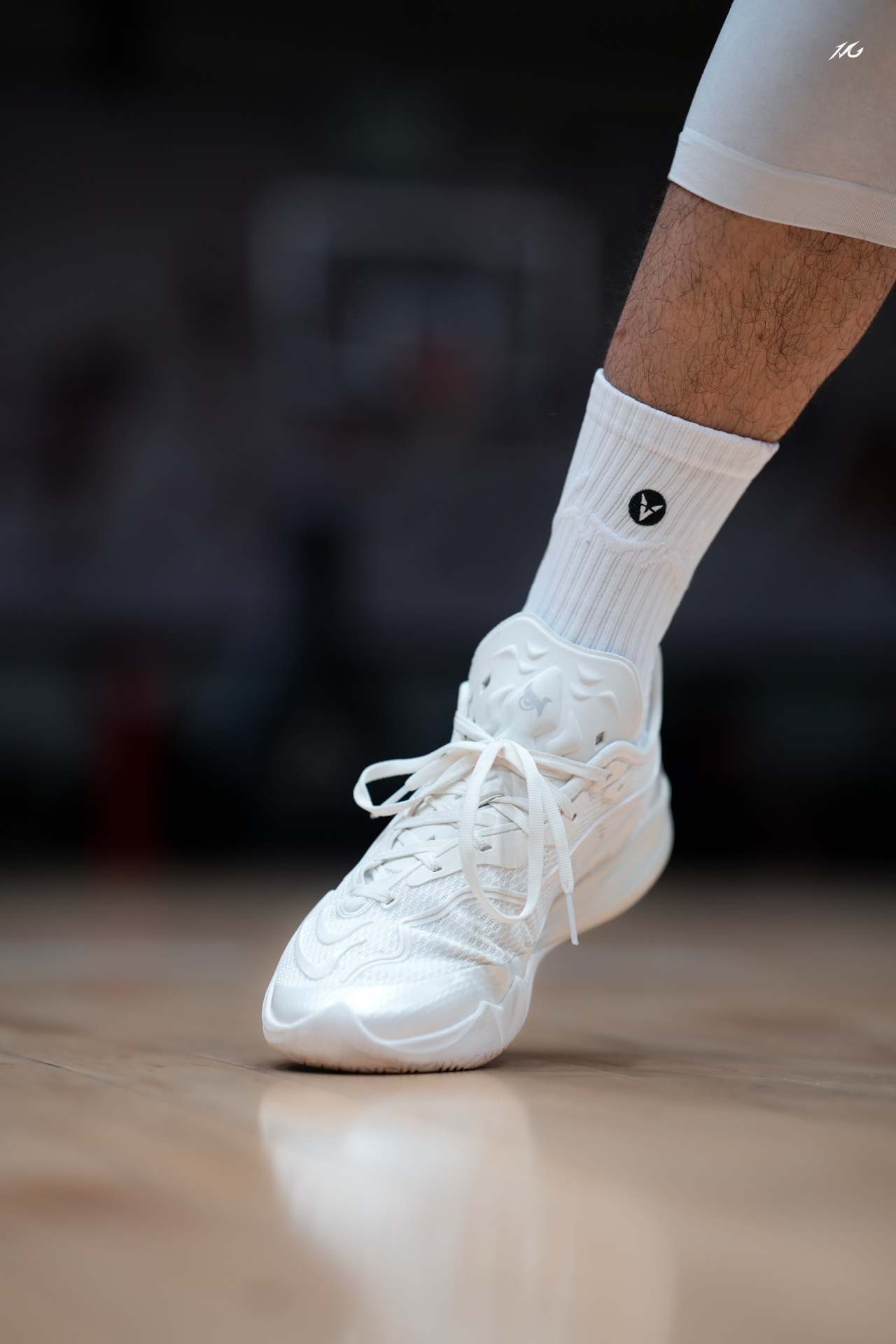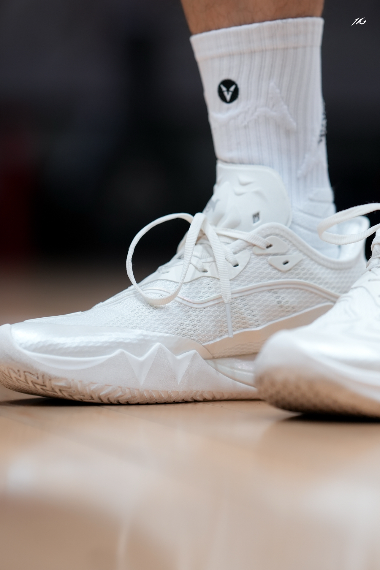 外底的微弧度设计在做变向和后撤步动作相当丝滑,鞋底宽度也比较适中能保持稳定,最后一个细节就是鞋头内侧有非常明显的一个脚趾大小的橡胶上包,第一是能保护到大脚趾区域,第二个重点的是突破蹬伸状态下的发力区域有所延长,鞋头在做转向的时候会感觉更加灵活,这个挺有特点的,你们如果入手可以着重体验下!