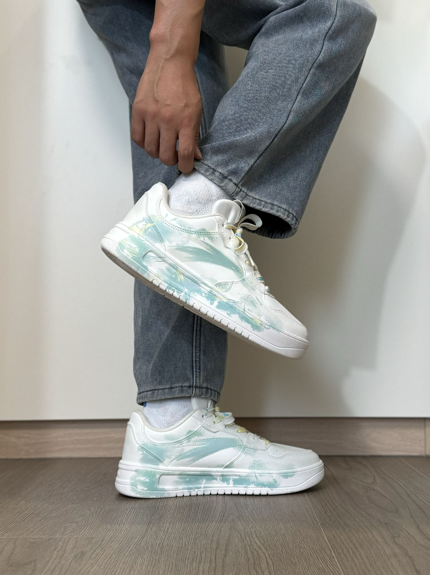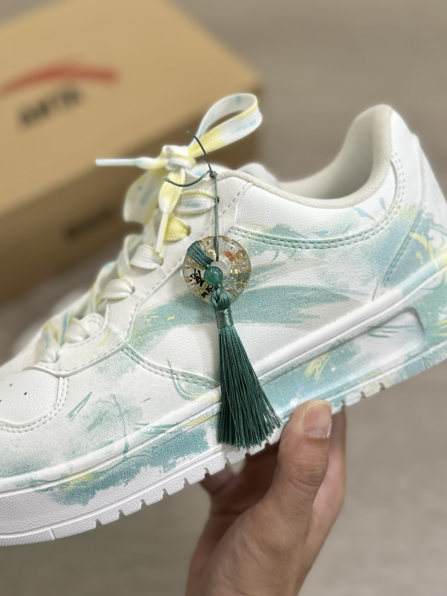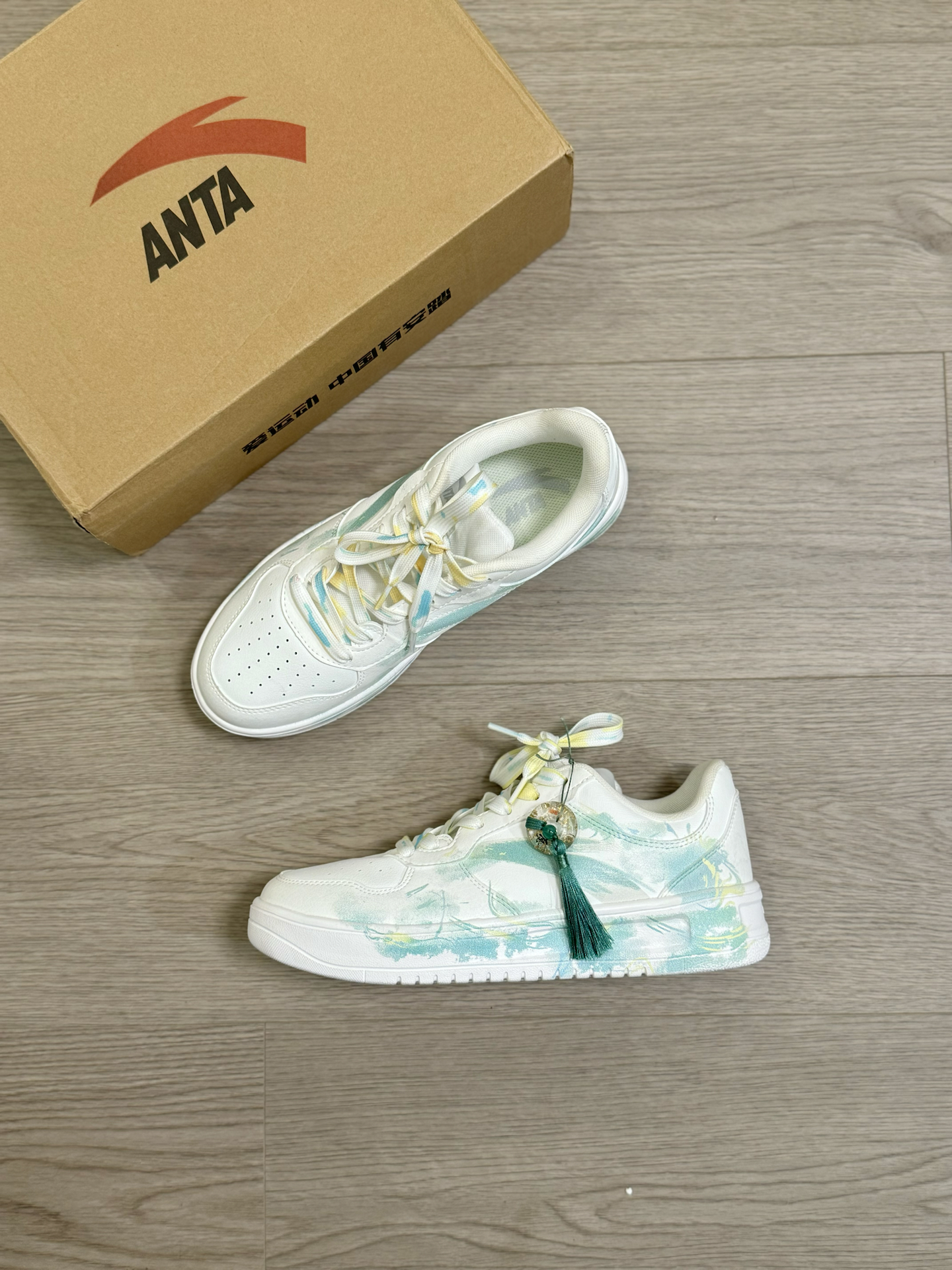 给大家分享一双 我最近很喜欢的一双 特殊DIY的小众安踏板鞋~ 鞋面是简约的白绿配色 加上新中式风的 水墨和晕染设计 侧面还有一个小挂坠 层次感蛮丰富的 上脚我觉得穿一些浅色系的牛仔裤 就特别好看 而且穿起来蛮舒服的 脚感软软韧韧的 很适合平常通勤、或者出街旅游穿 #长期主义鞋子 #给度假计划配双鞋 #这双没有班味 #城市徒步多巴胺 #LTDZ