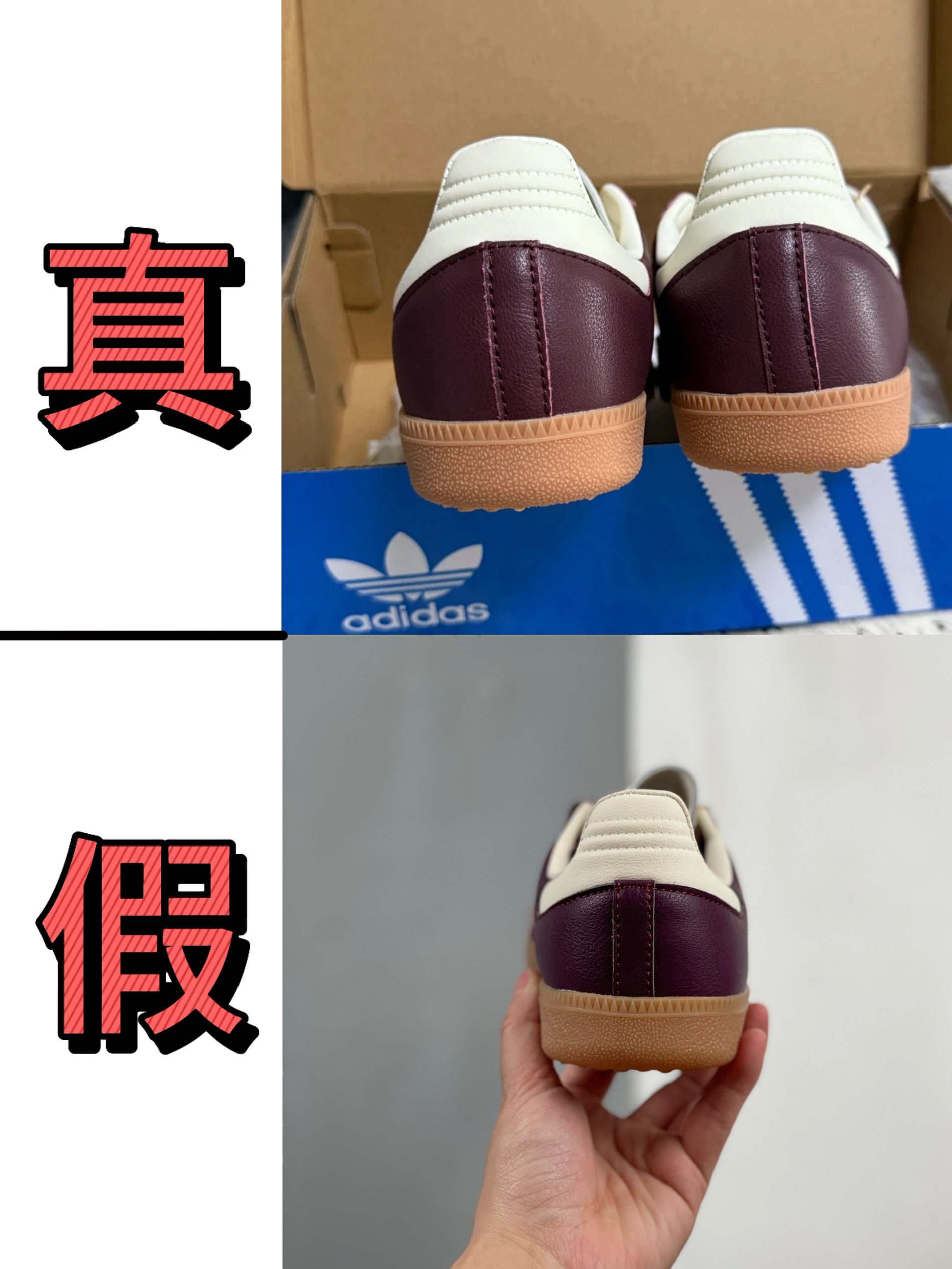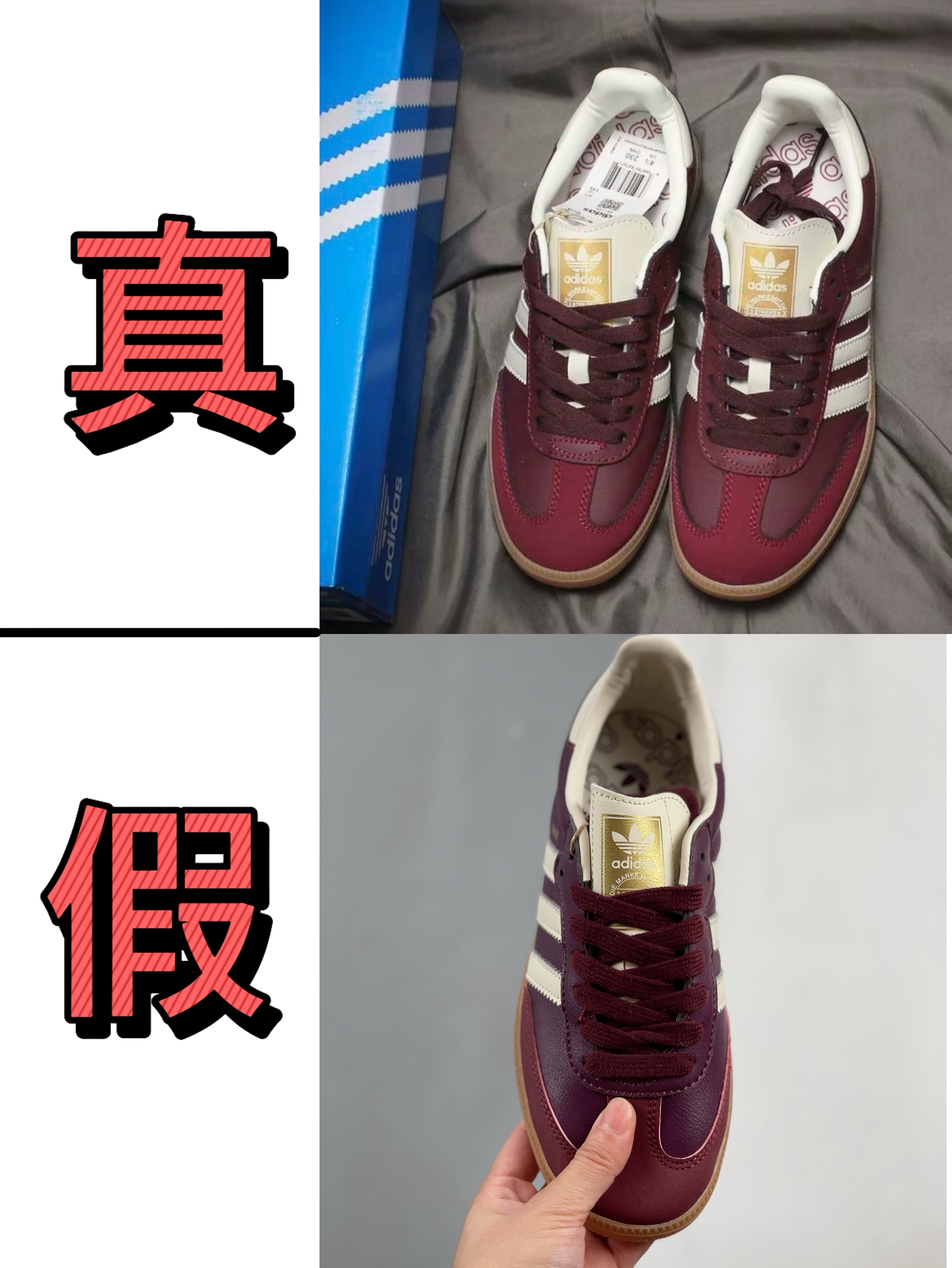 家人们,Adidas Samba德训鞋真假细节大起底🔥 看完再也不怕买到莆田货! 🔍 先看鞋身配色 ✅真鞋:酒红色鞋面正到不行,白条纹清晰锐利,复古感拉满;鞋底生胶色自然,和鞋面搭得恰到好处~ ❌假鞋:酒红发暗发灰,像褪色老古董;白条纹模糊还泛黄,生胶底颜色也不对,廉价感爆炸💥 🔍 再瞅细节标识 ✅真鞋:鞋侧“SAMBA”烫金标精致,字体清晰、光泽自然;鞋内三叶草标规整,质感在线✔️ ❌...