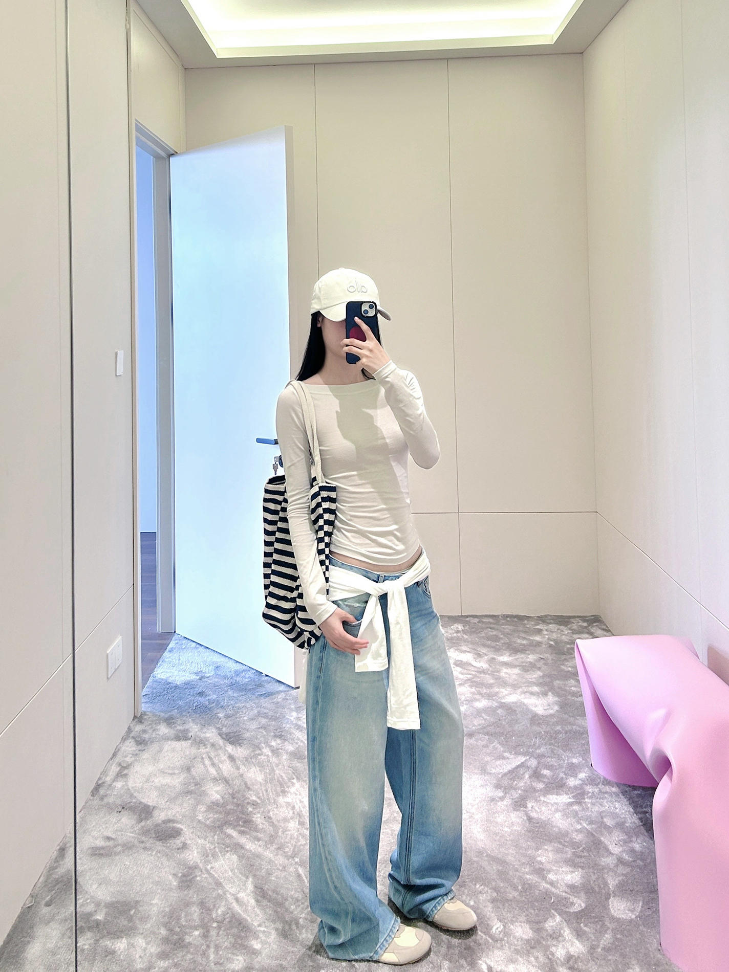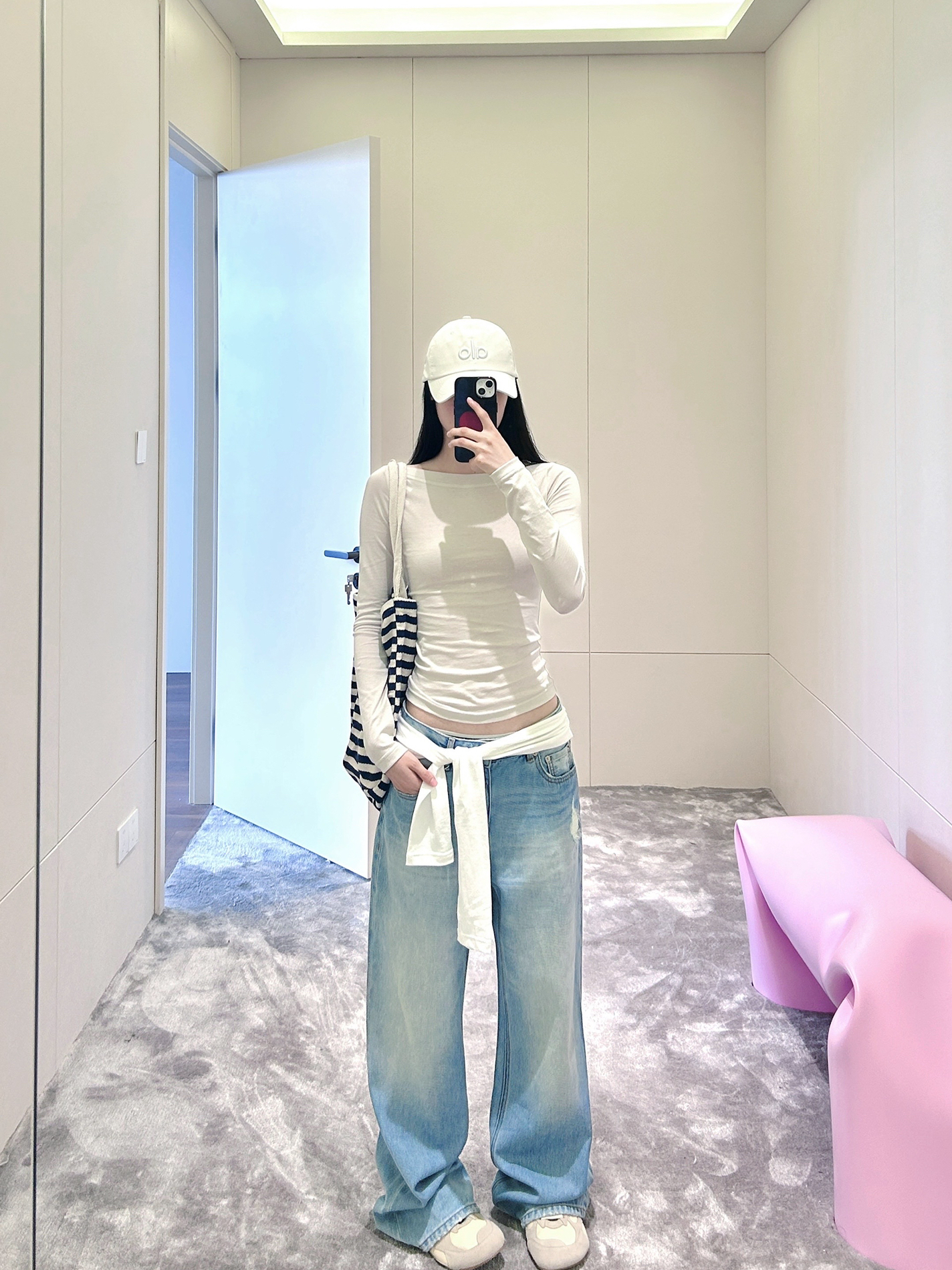 奶白长袖打底,简约勾勒线条 腰系白衫+阔腿牛仔,慵懒又随性 背上条纹大包,踩双休闲鞋 再戴顶白色棒球帽🎩 松弛氛围直接拉满,日常出街超chill~