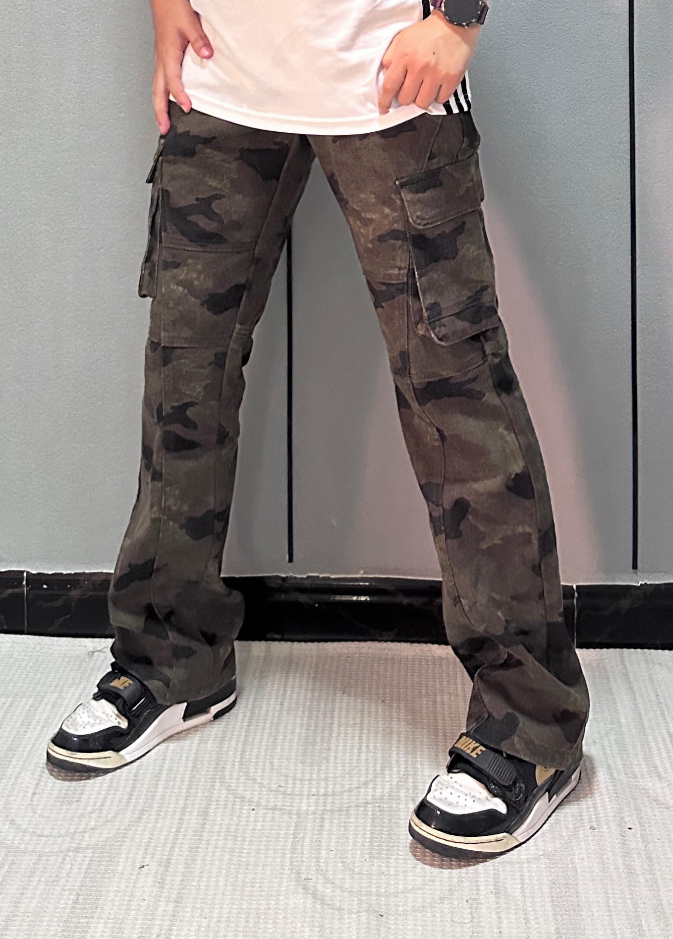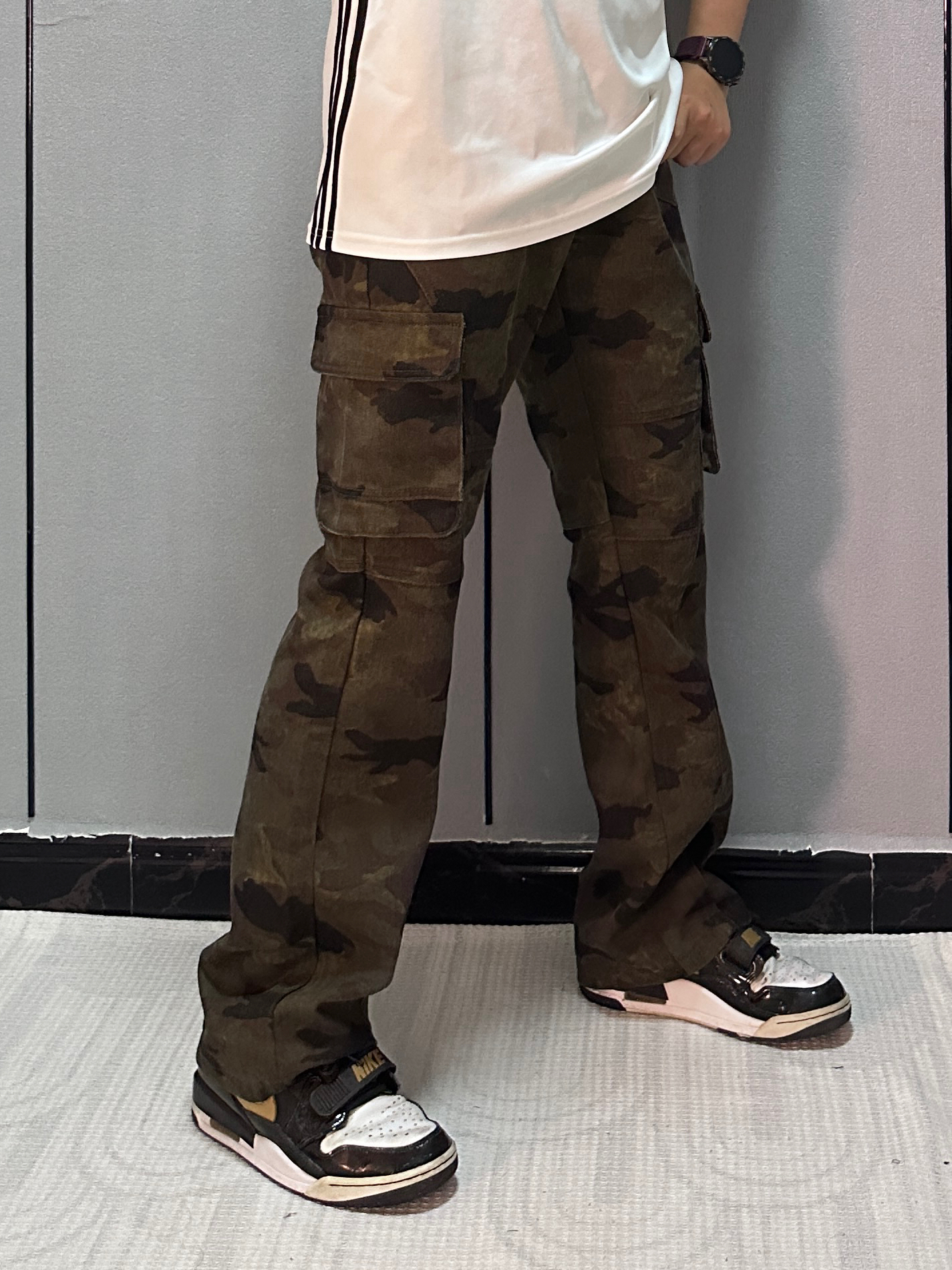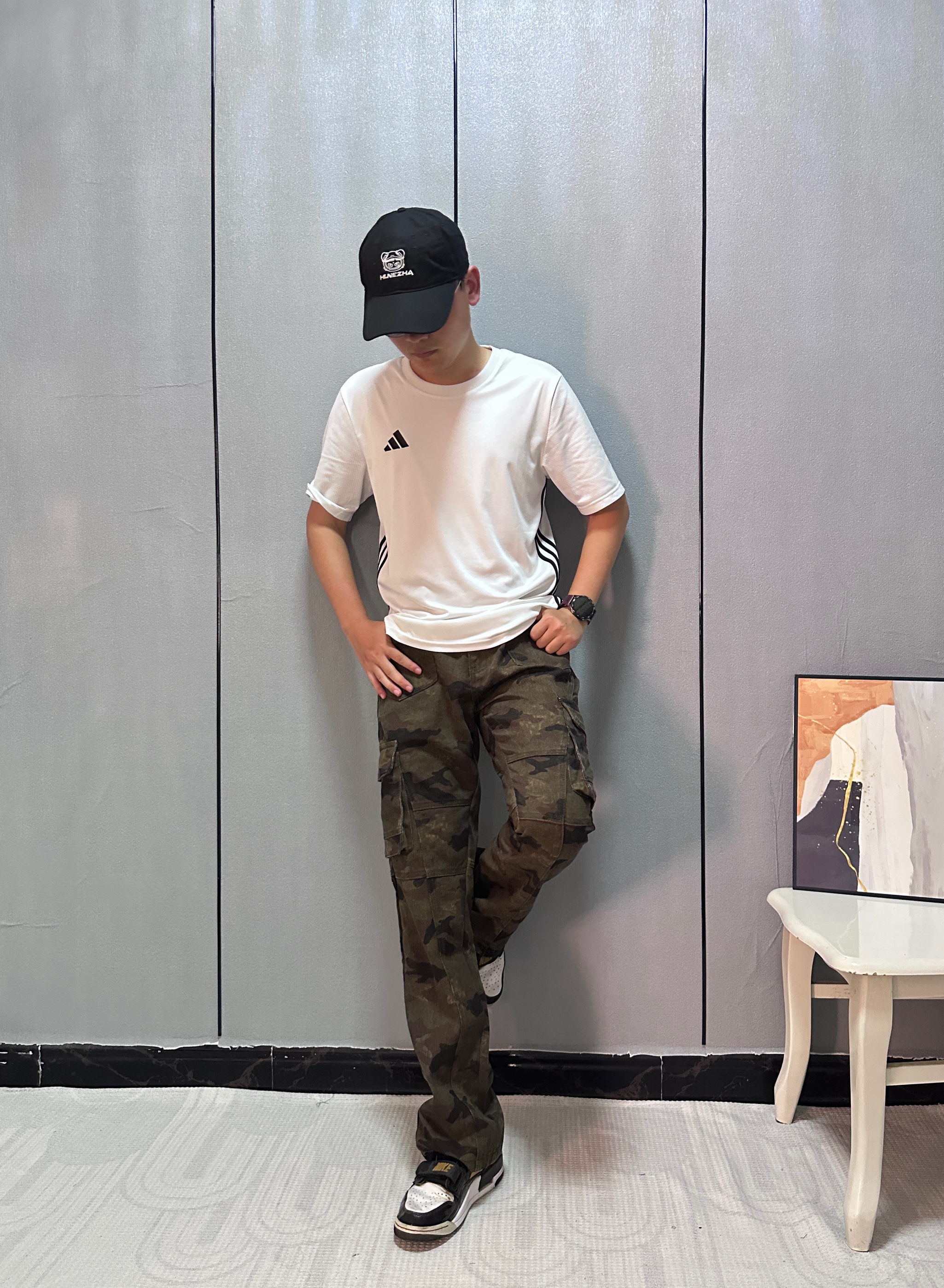 把迷彩伐木裤穿出高街感 秘诀在「松紧对冲」 选微阔版型遮胯显瘦, 裤脚卷两圈露出脚踝更利落。 上搭短款白T平衡厚重感, 不用堆太多配饰, 手上带块手表就够了 让迷彩成为视觉焦点, 随性中藏着小心思。