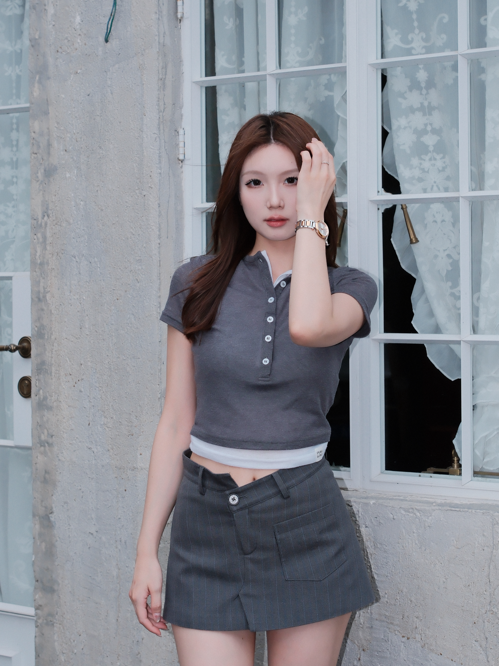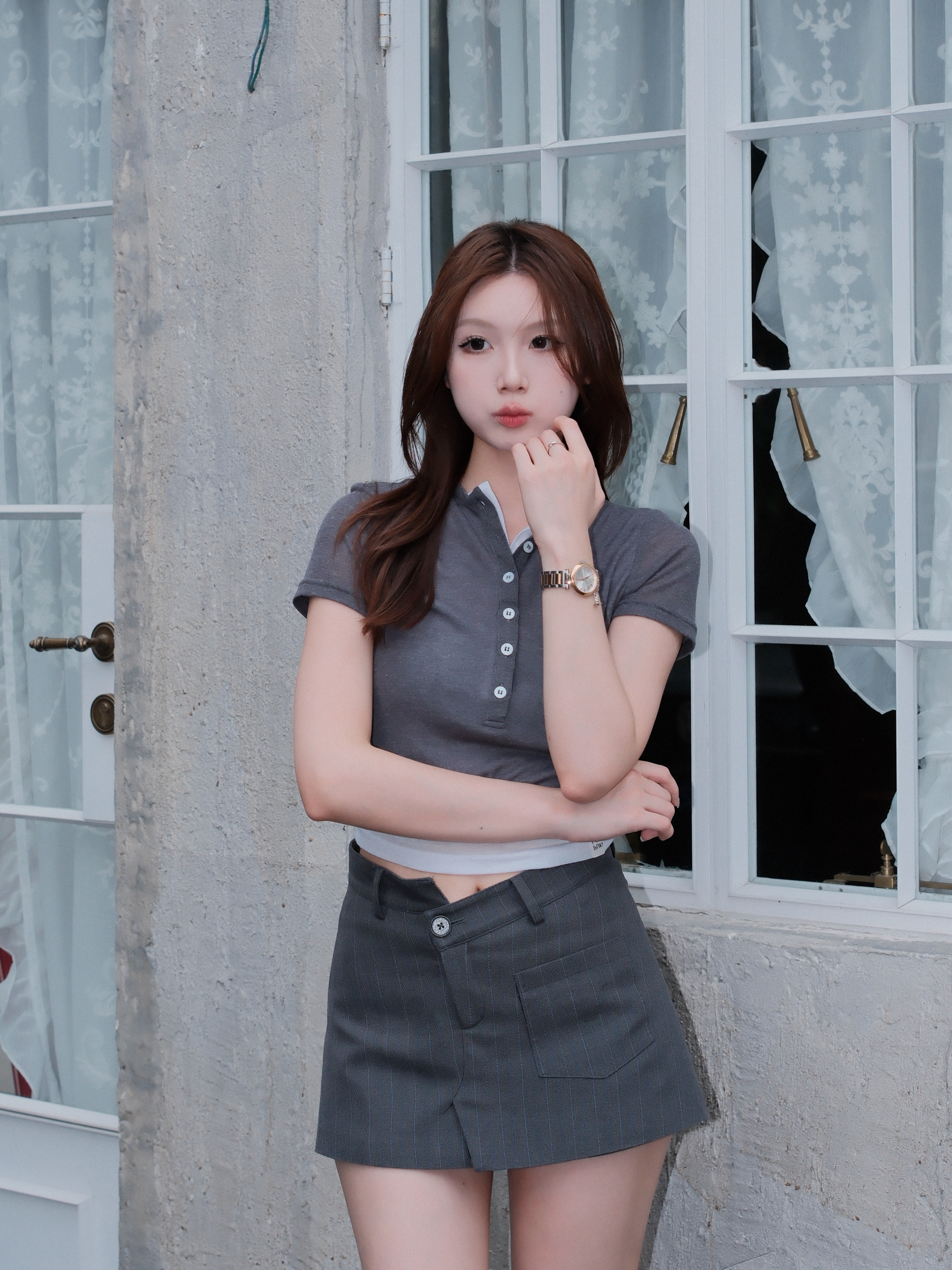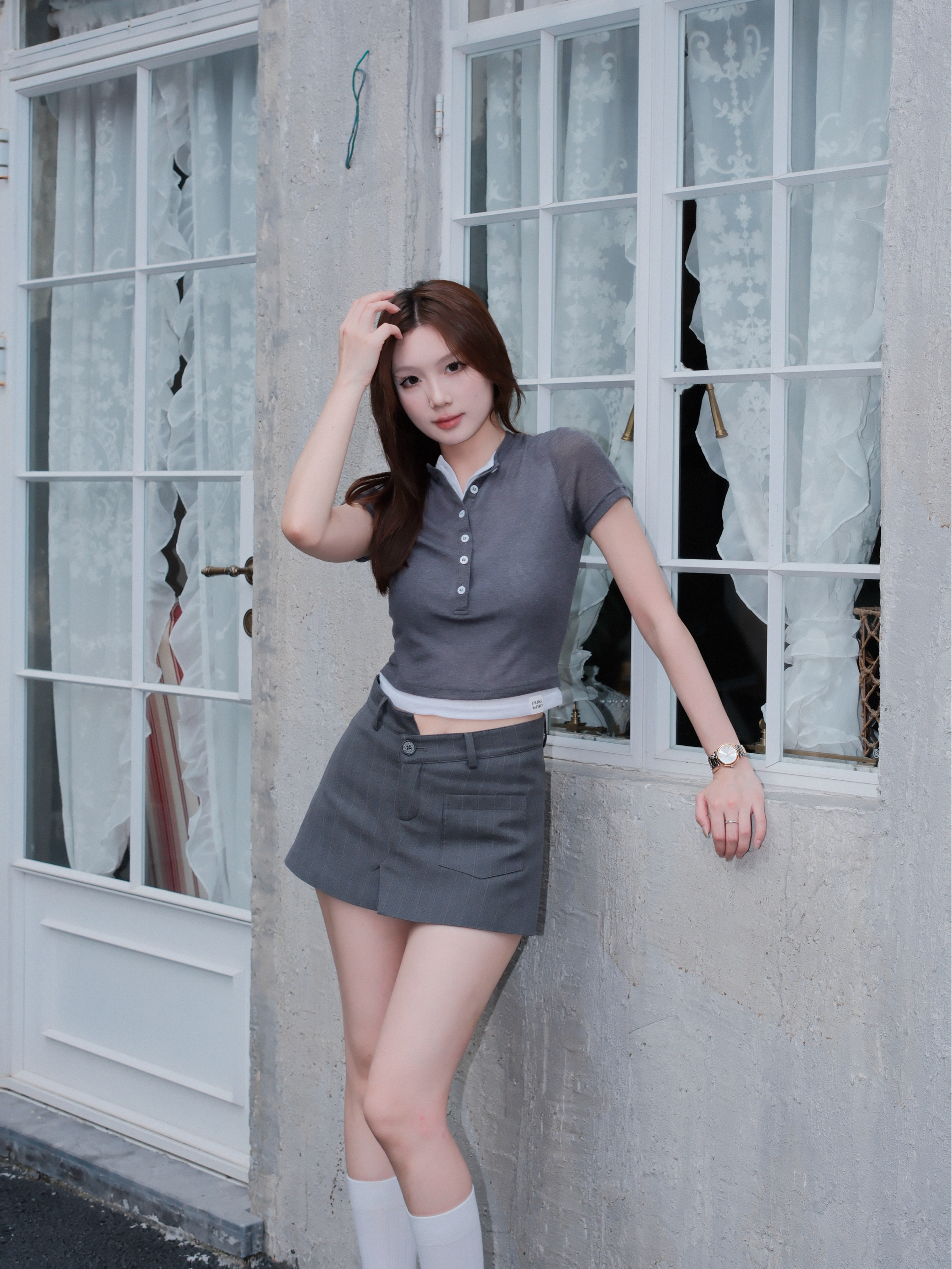 灰色假两件短袖超适合懒人星人 搭配同色系的条纹包臀西装裤🍊 比普通的短袖多了一份精致感 白色的中筒袜搭配漆面小皮鞋👞 学院分十足 看起来高级感满分💯 就算是没有经验的职场新人✨ 看起来也像是工作能力特强的员工