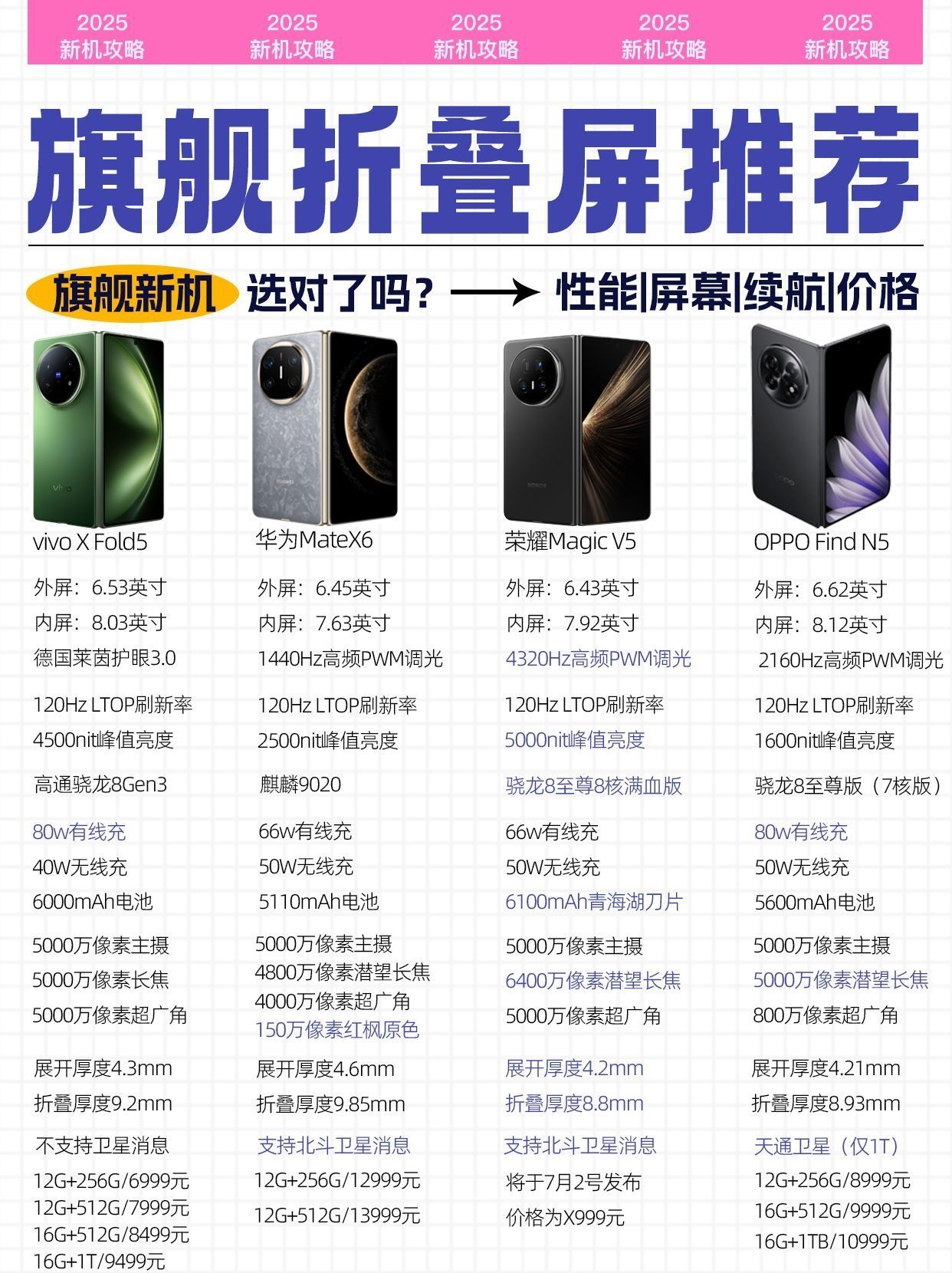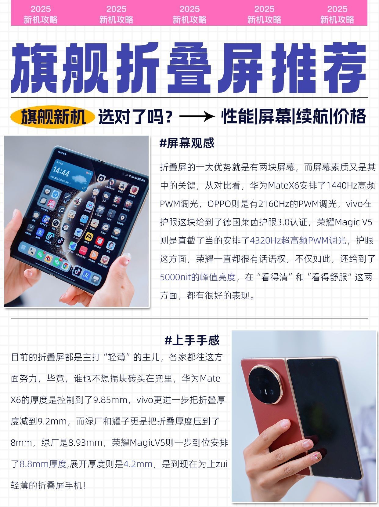 就在今年,华为、vivo、OPPO、荣耀等手机厂商,都发布或者即将发布自己的旗舰折叠屏手机,主要更新点在于SOC、屏幕、设计、续航等方面。 今天,就把值得入手的几个机型都拿出来讲讲,对比一下,看哪款更适合你! #屏幕观感 折叠屏的一大优势就是有两块屏幕,而屏幕素质又是其中的关键,从对比看,华为MateX6安排了1440Hz高频PWM调光,OPPO则是有2160Hz的PWM调光,vivo在护眼这块...