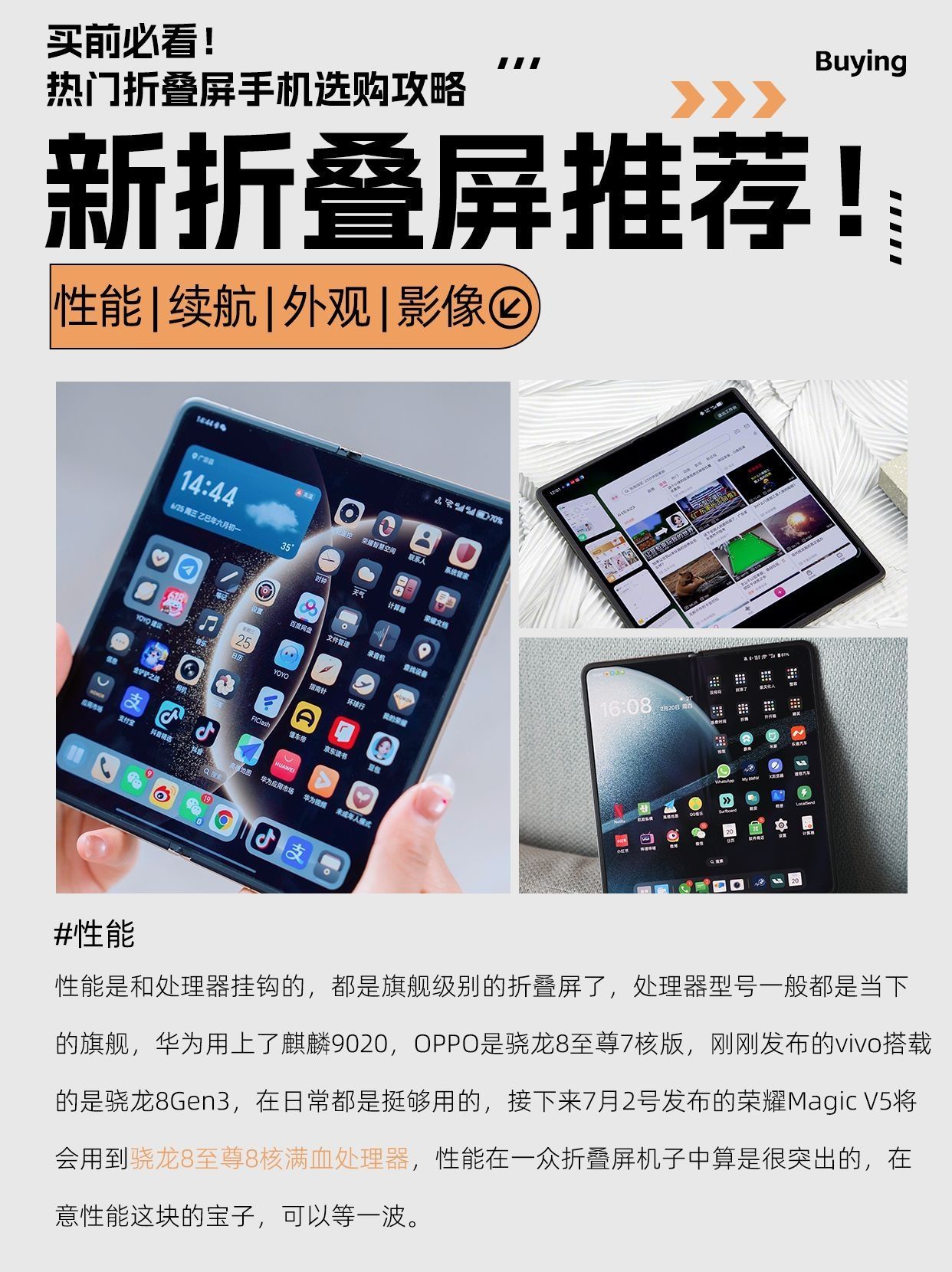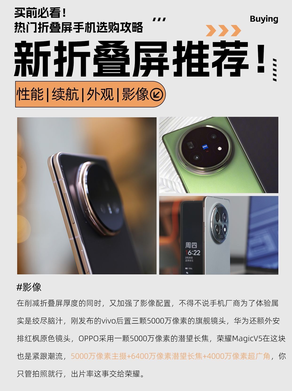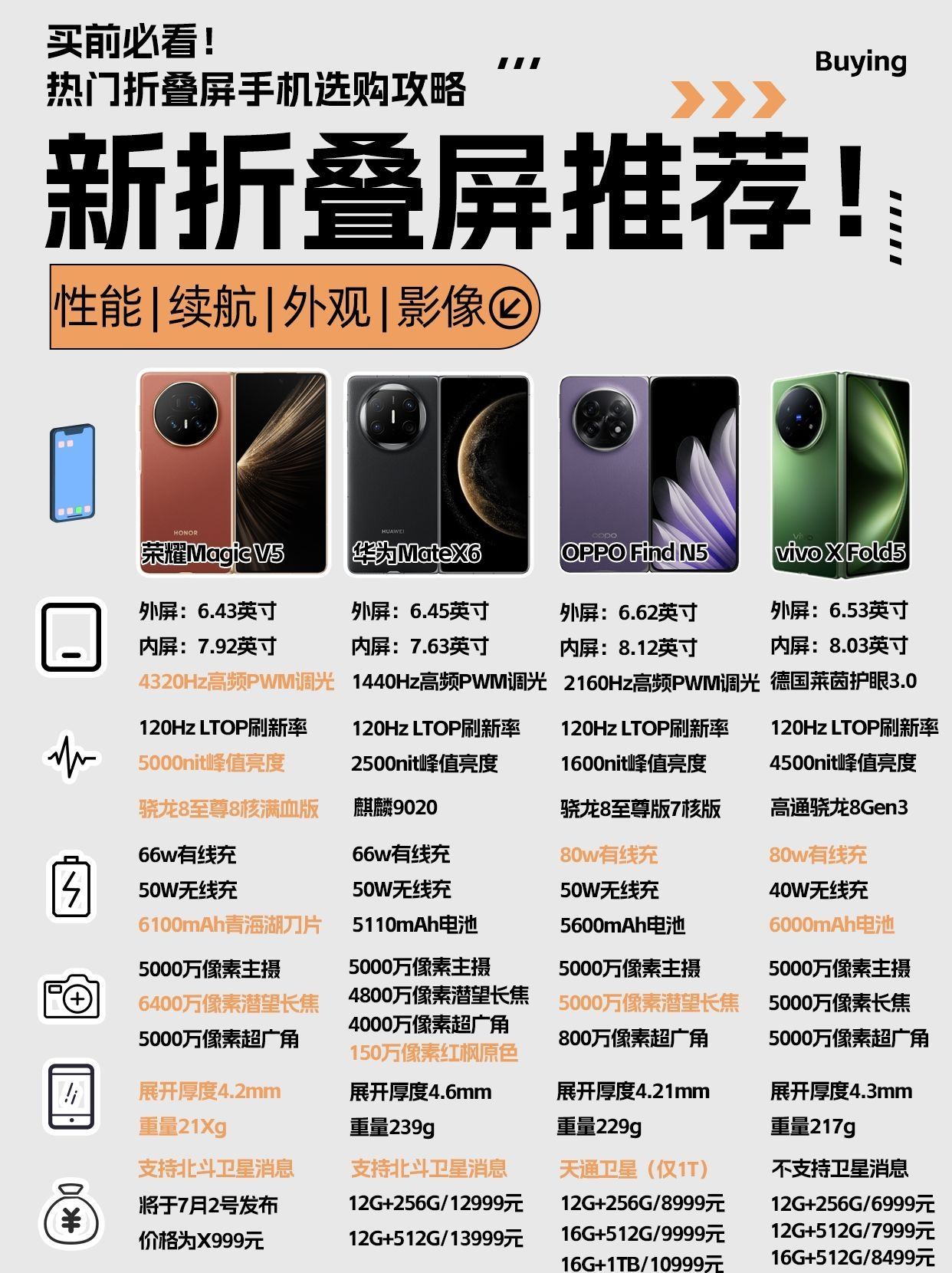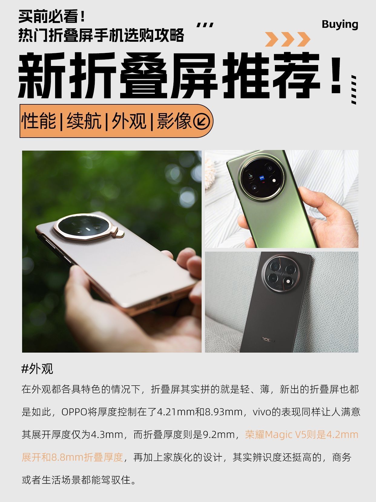 貌似又是被被折叠屏霸榜的一年,华为MateX6、vivo X Fold5、OPPO Find N5,还有即将发布的荣耀MagicV6,目前的折叠屏市场可选择的机型确实是丰富,今天给小伙伴们整理下现在热门的折叠屏机型,然后进行一波对比,先看后买不吃亏,大家可以按照自己的需求来入手! #外观 在外观都各具特色的情况下,折叠屏其实拼的就是轻、薄,新出的折叠屏也都是如此,OPPO将厚度控制在了4.21m...