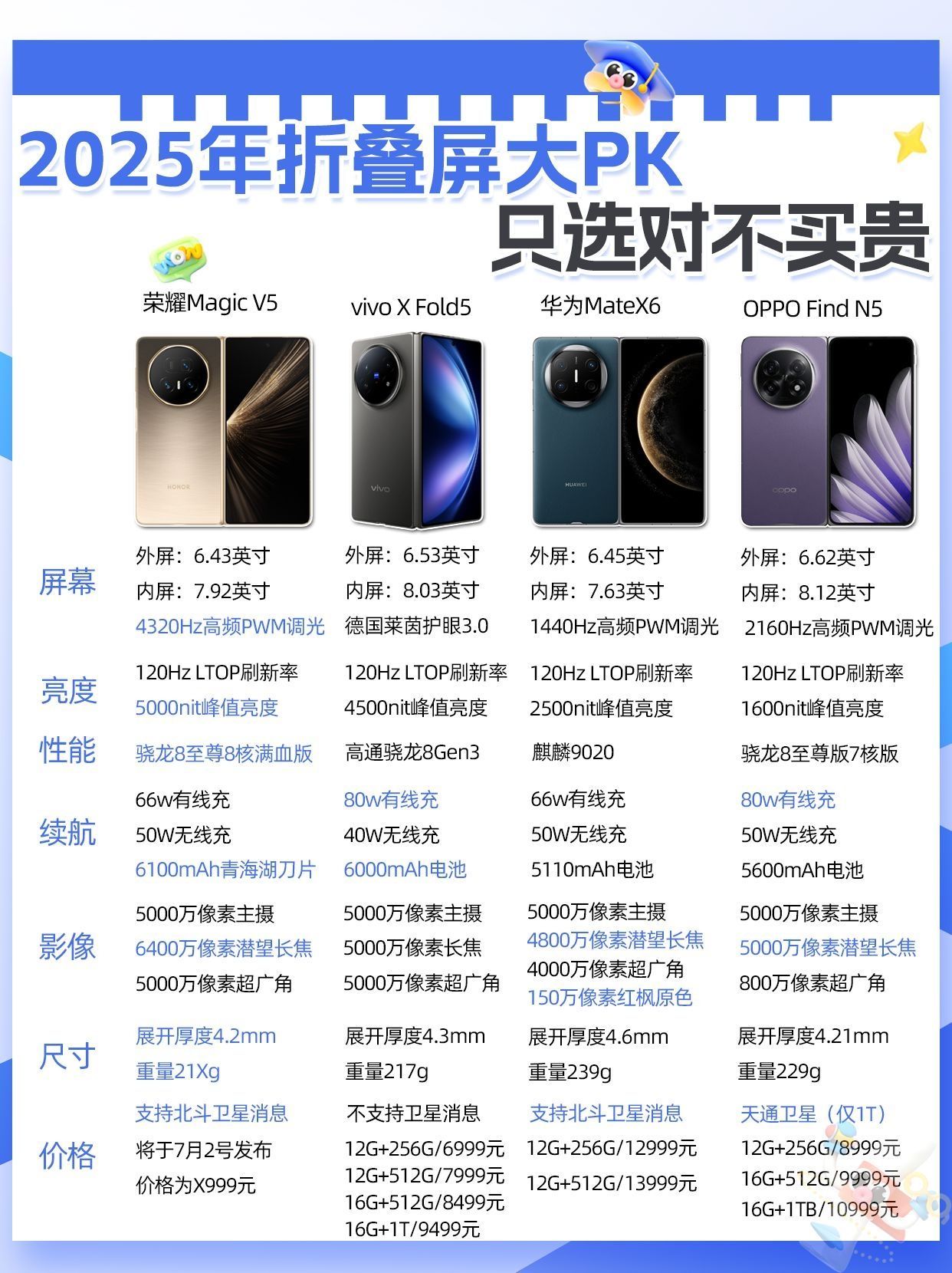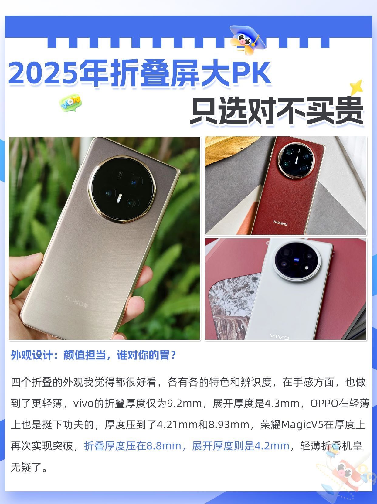 折叠屏手机市场的“分子”是越来越多了,而作为“分母”的手机厂商也越发重视折叠屏这个形态,目前热门的选项主要有OPPO Find N5、华为MateX6、vivo X Fold5、荣耀MagicV5。 外观设计:颜值担当,谁对你的胃? 四个折叠的外观我觉得都很好看,各有各的特色和辨识度,在手感方面,也做到了更轻薄,vivo的折叠厚度仅为9.2mm,展开厚度是4.3mm,OPPO在轻薄上也是挺下功夫...