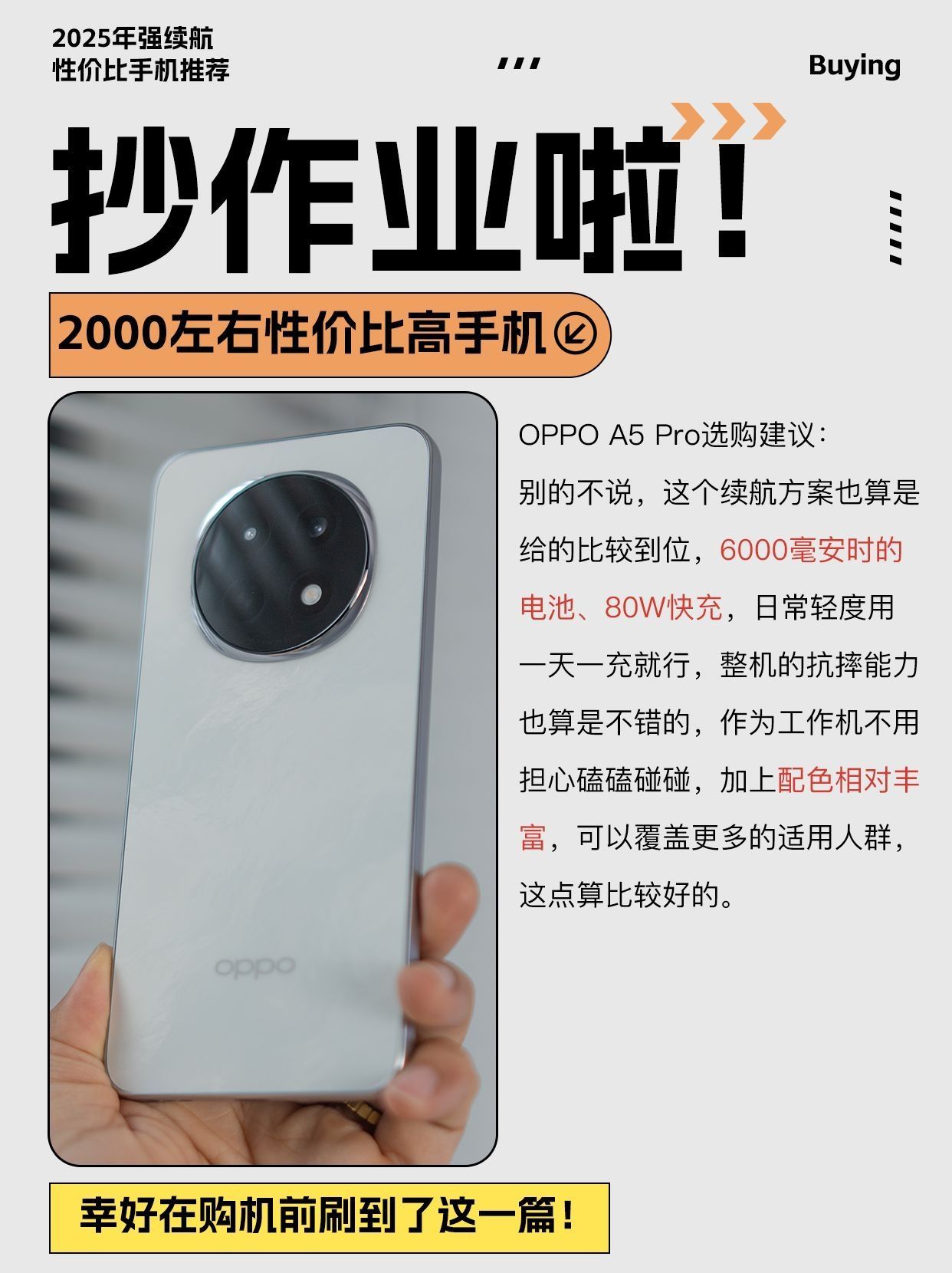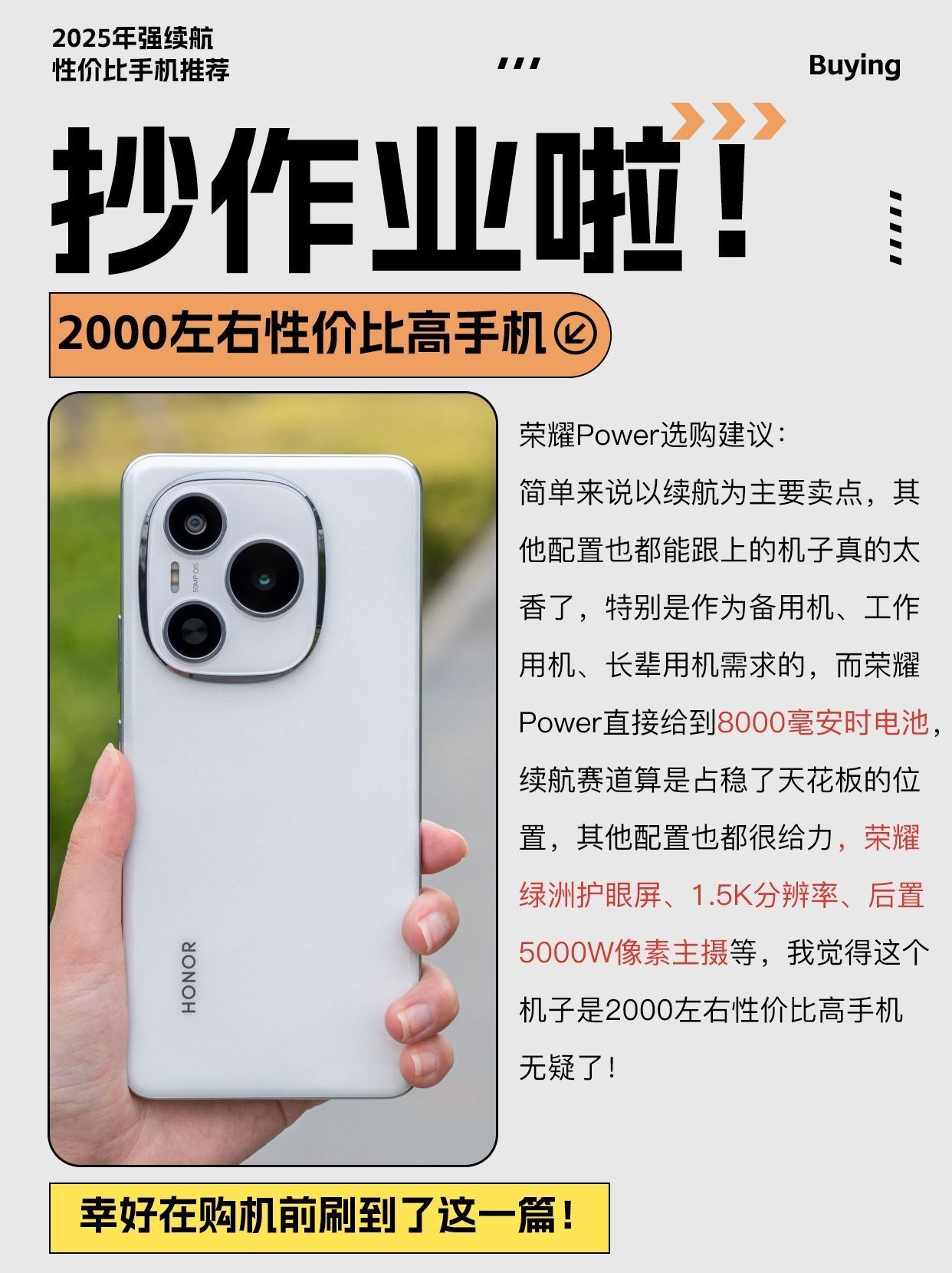 以续航为主要卖点、其他配置也都能跟上的机子真的太香了,特别是作为备用机、工作用机、长辈用机需求的,今天,就给小伙伴们推荐几款续航体验为主的2000左右性价比高手机! 荣耀Power,直接给到8000毫安时电池,续航赛道算是占稳了天花板的位置,其他配置也都很给力,荣耀绿洲护眼屏、1.5K分辨率、后置5000W像素主摄等,我觉得这个机子是2000左右性价比高手机无疑了! OPPO A5 Pro,别...