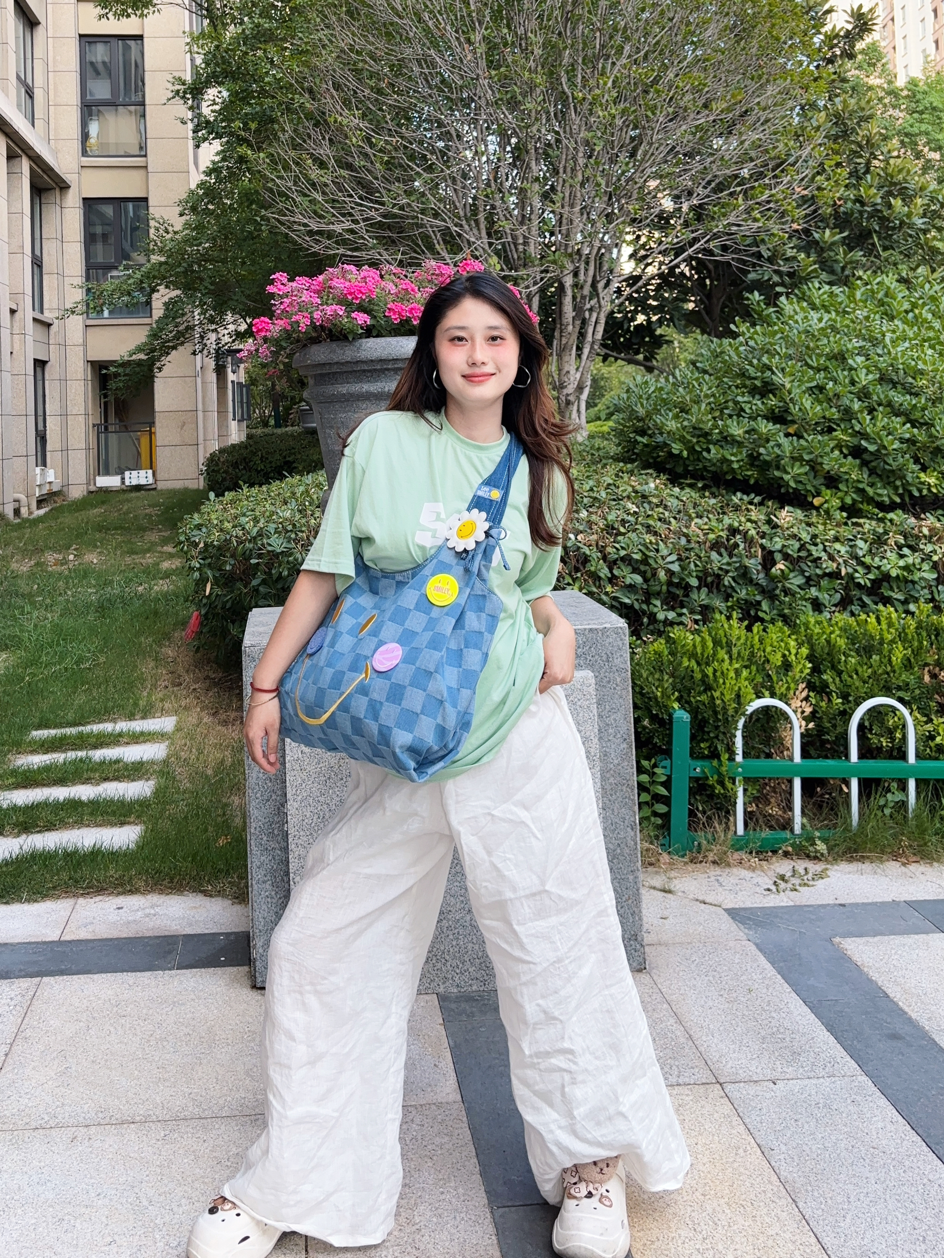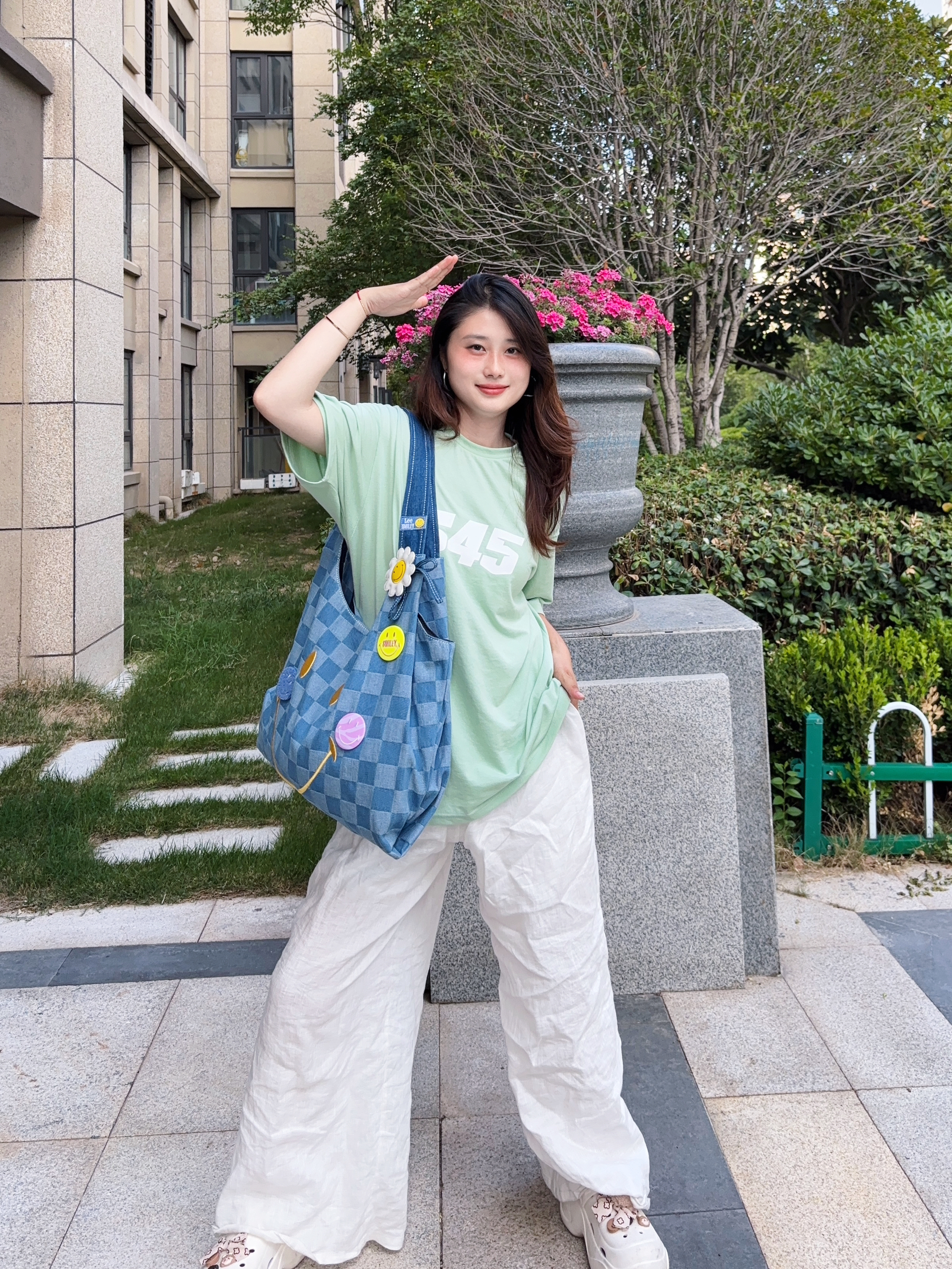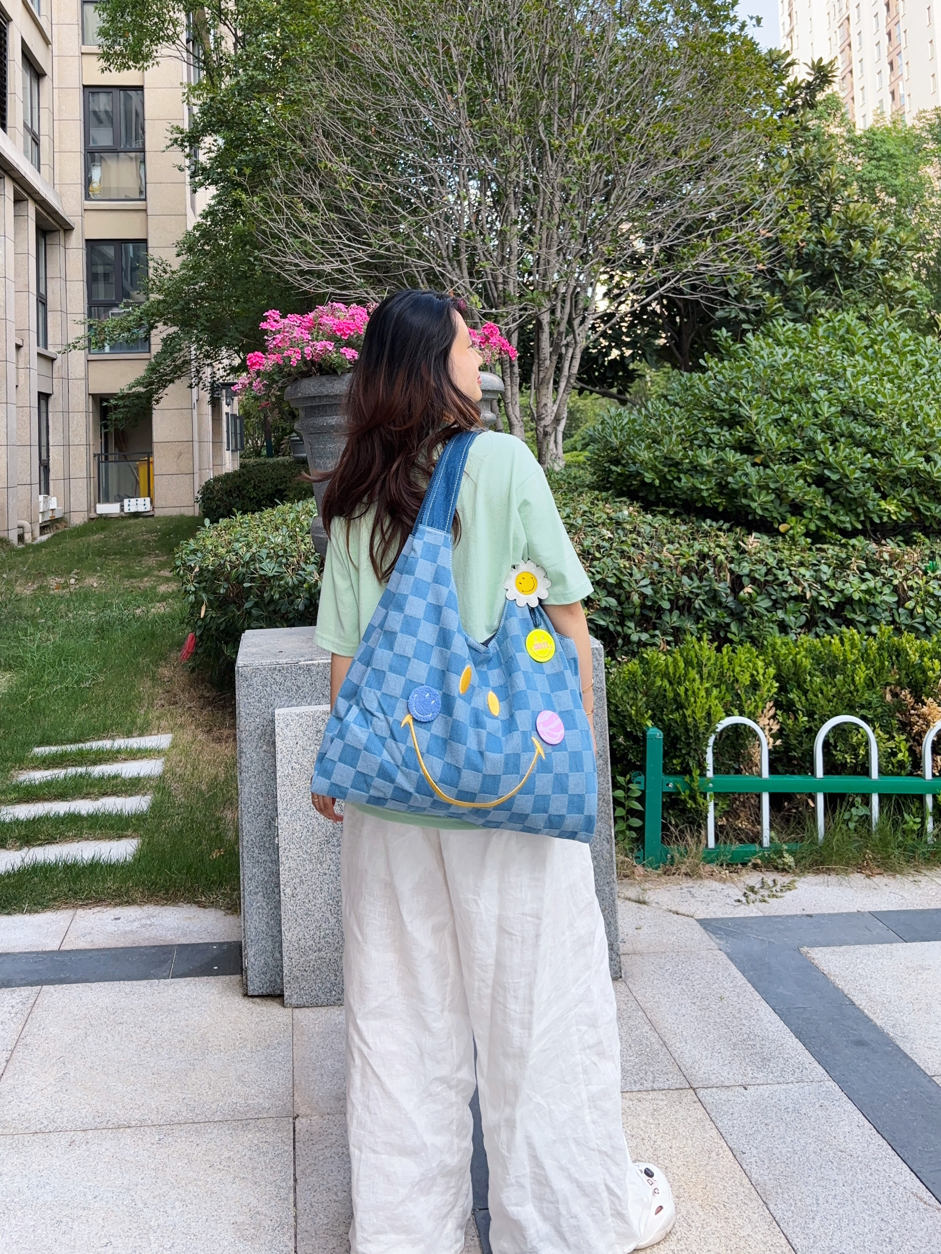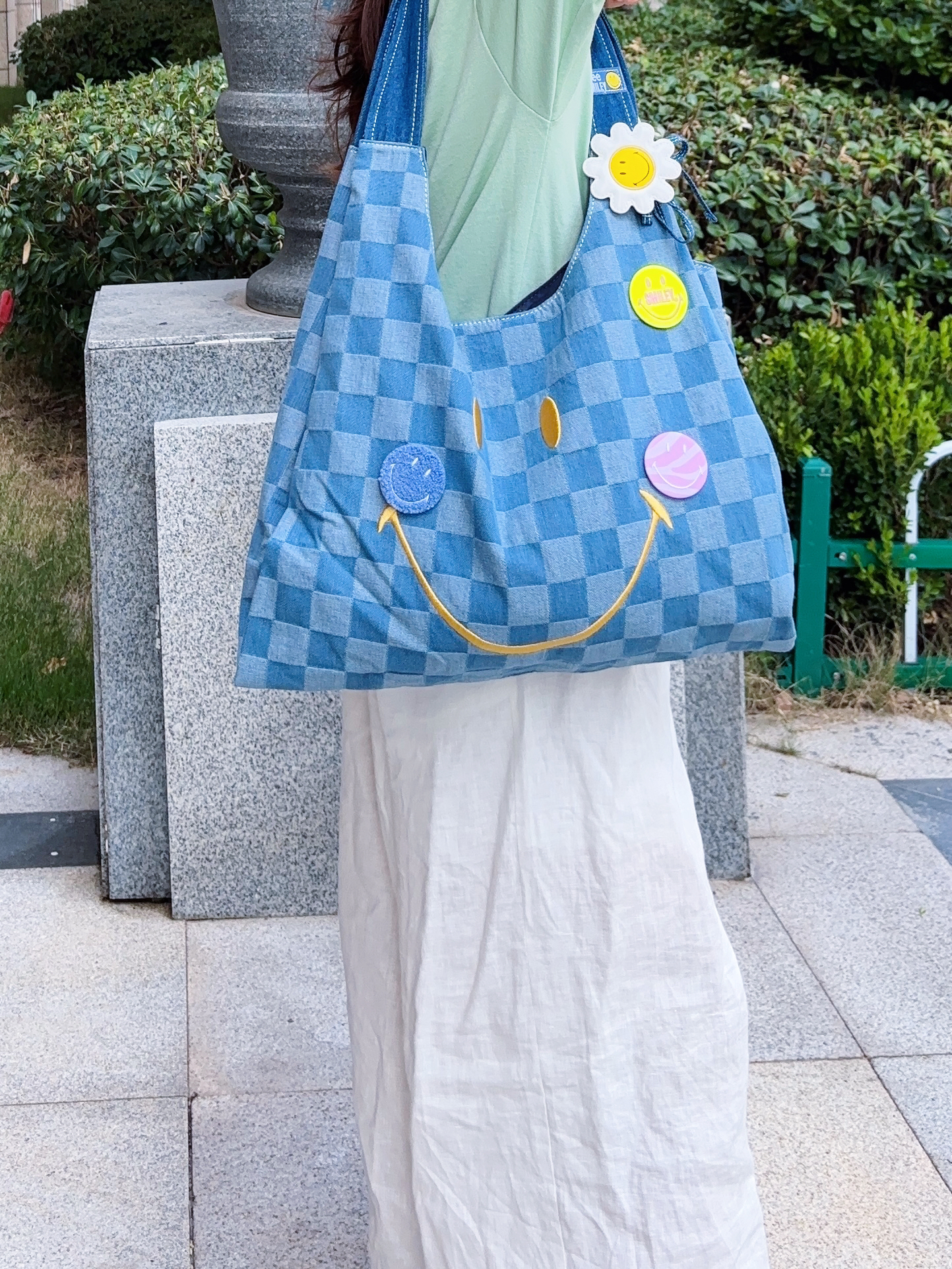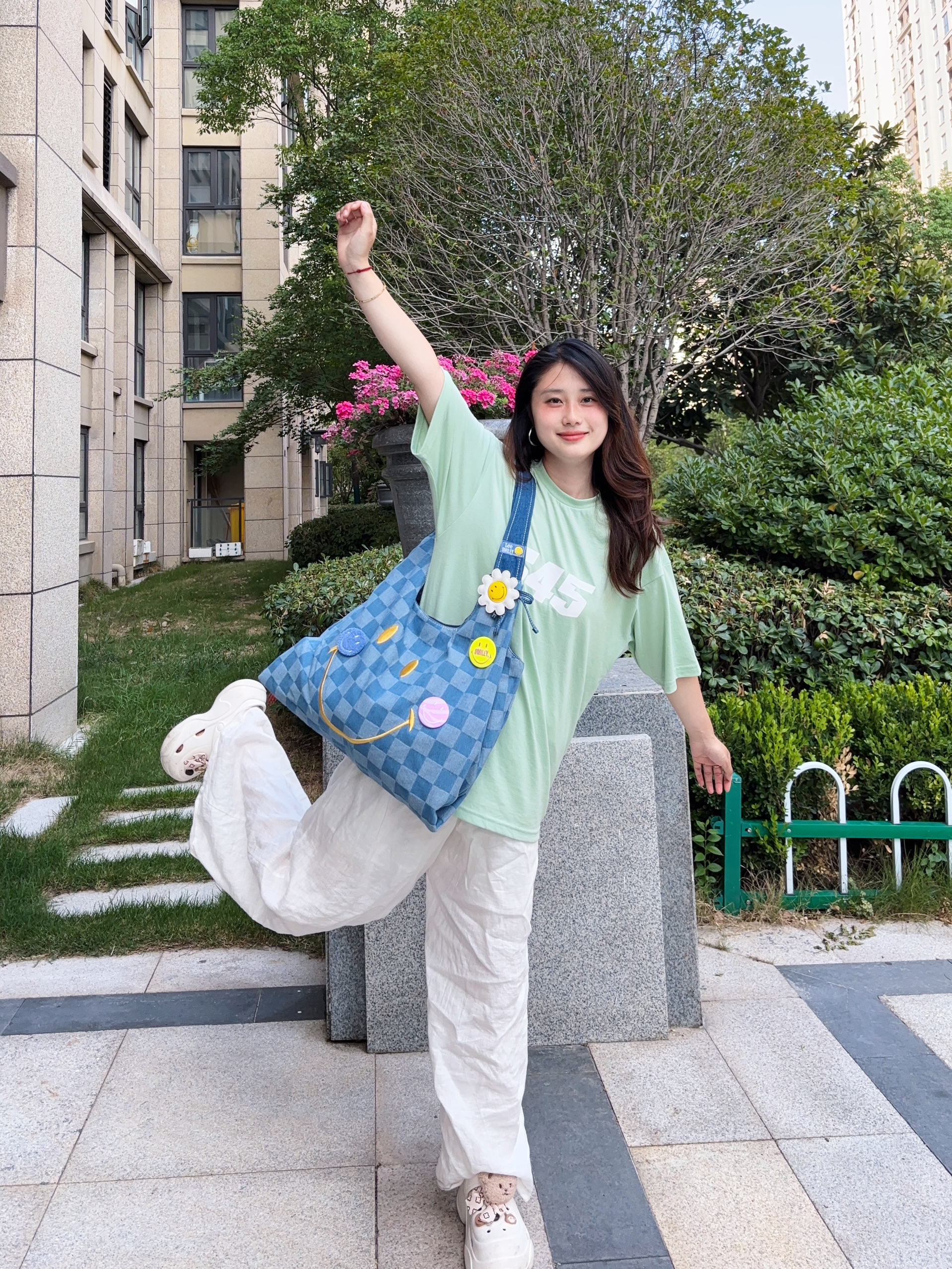 lee家包包设计在我心坎上啊 这款是和Smiley联名款,真的是出门回头率贼高! 帆布面料的,很有调性哦 加上棋盘格的点缀时尚感太强了 我感觉随手一拎都很好看的 点肩背也不会感觉到勒 容量也很大啊,电脑都没问题的 蓝色夏天也很明媚,背上很活力满满啊 今天搭配的是绿色宽松短袖T恤➕宽松长裤 一整个元气少女感耶 包包很百搭的,日常出行必备哦~