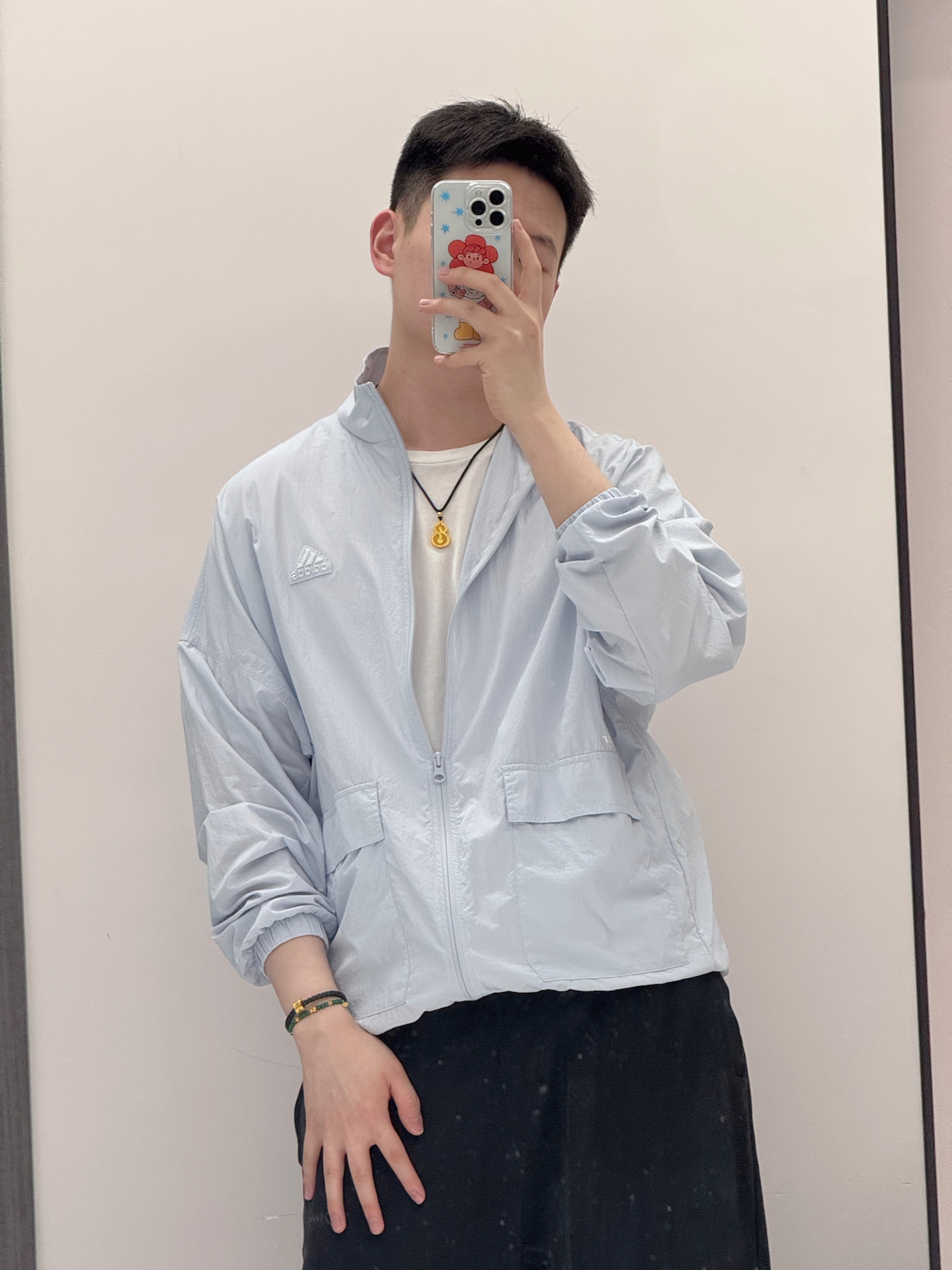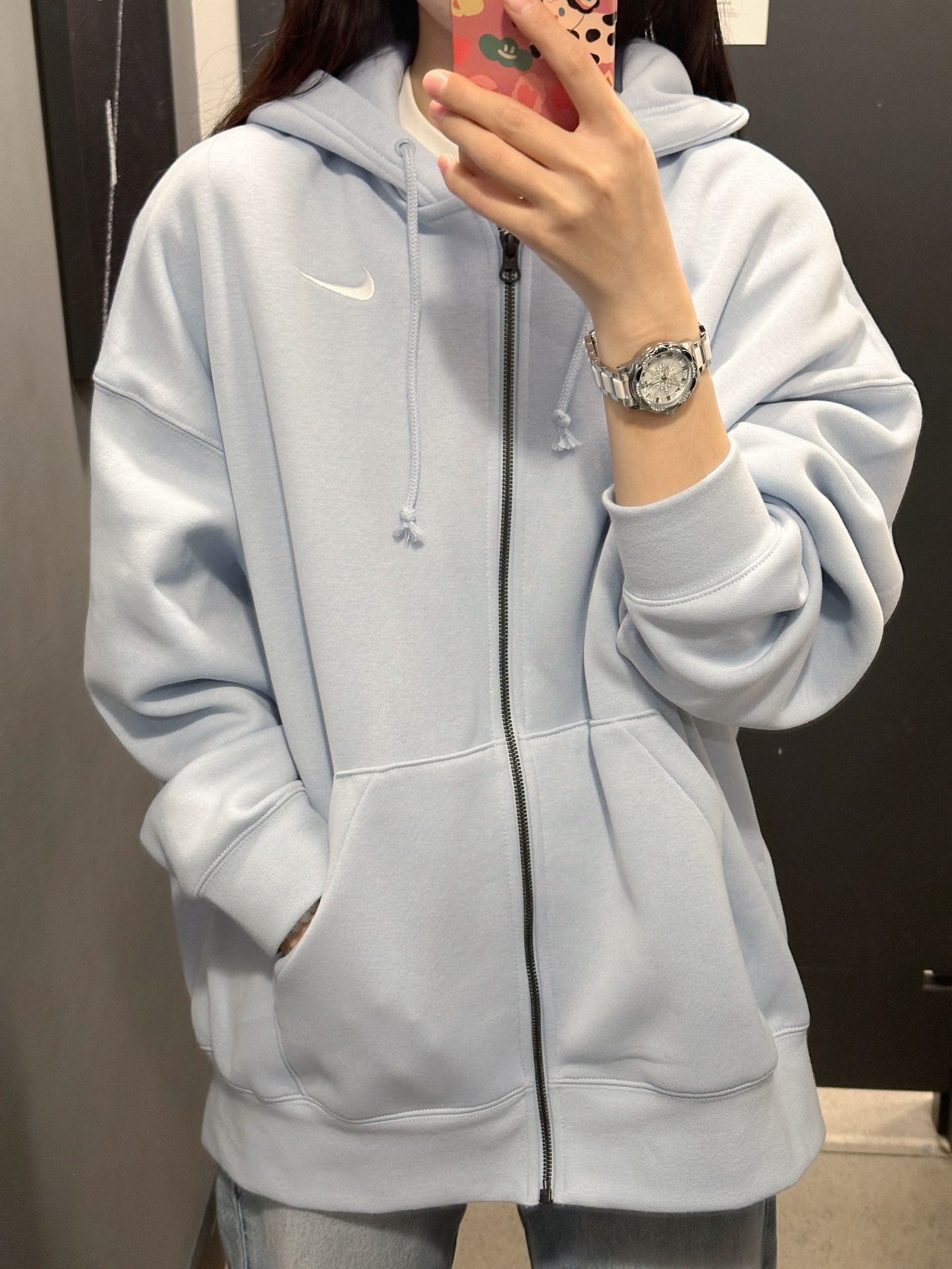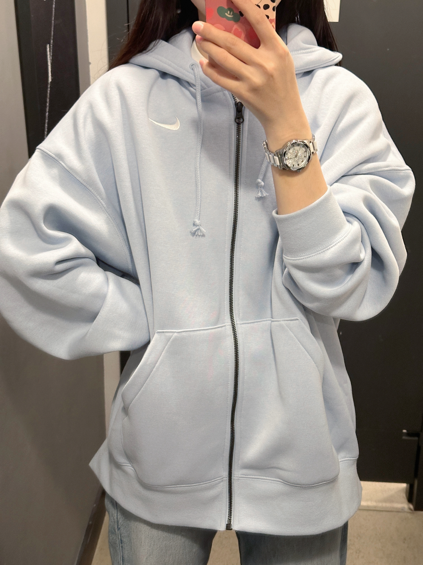 家人们谁懂啊!最近入手的这件连帽开衫,颜色太绝啦,baby蓝超温柔~ 款式宽松超自在,落肩设计还很显肩窄。加绒的穿着暖呼呼,日常搭配牛仔裤就很出挑。 不过呢,它的拉链质感一般般,拉起来没那么顺滑😔。配上镶钻小手表,整个氛围感狠狠拿捏住啦~铁子们觉得好看嘛?