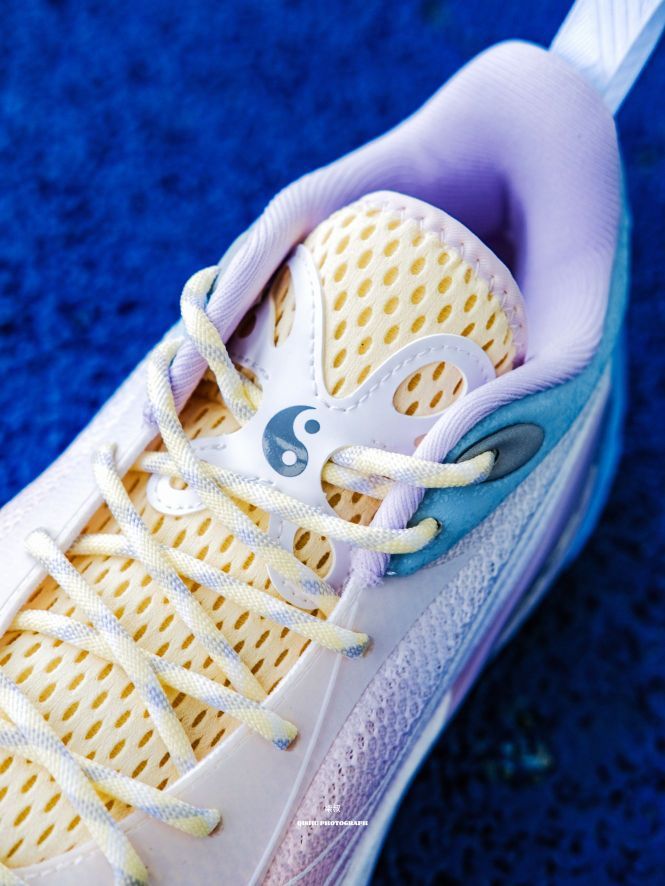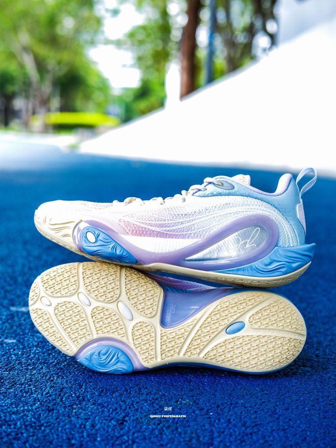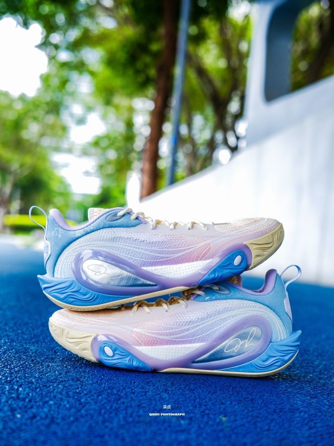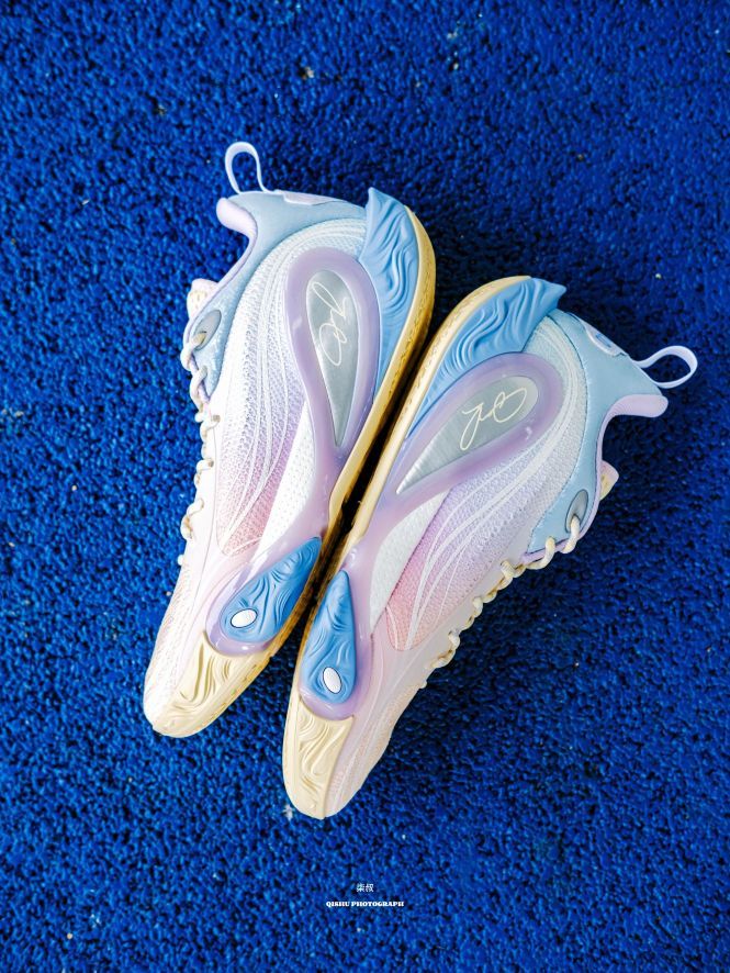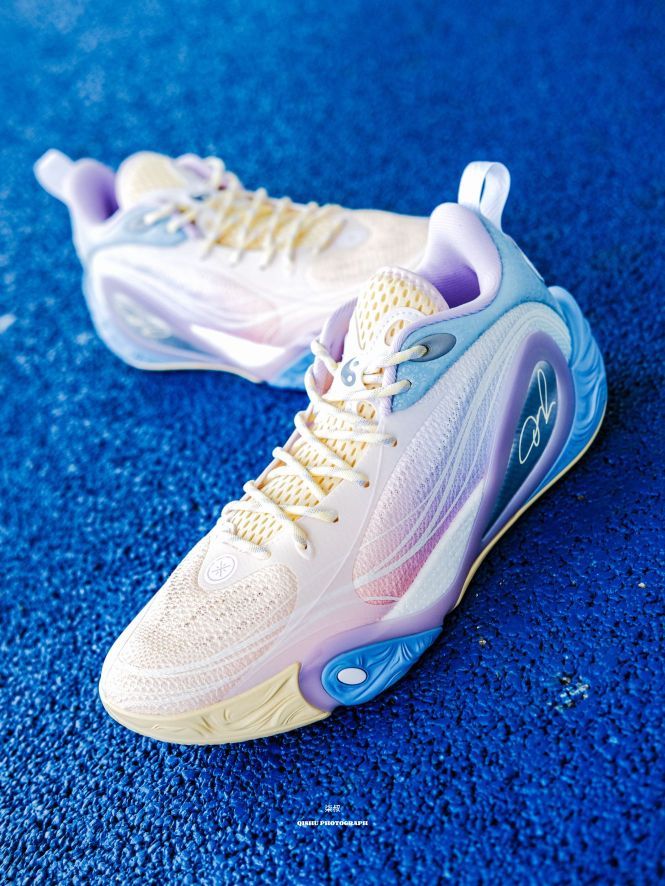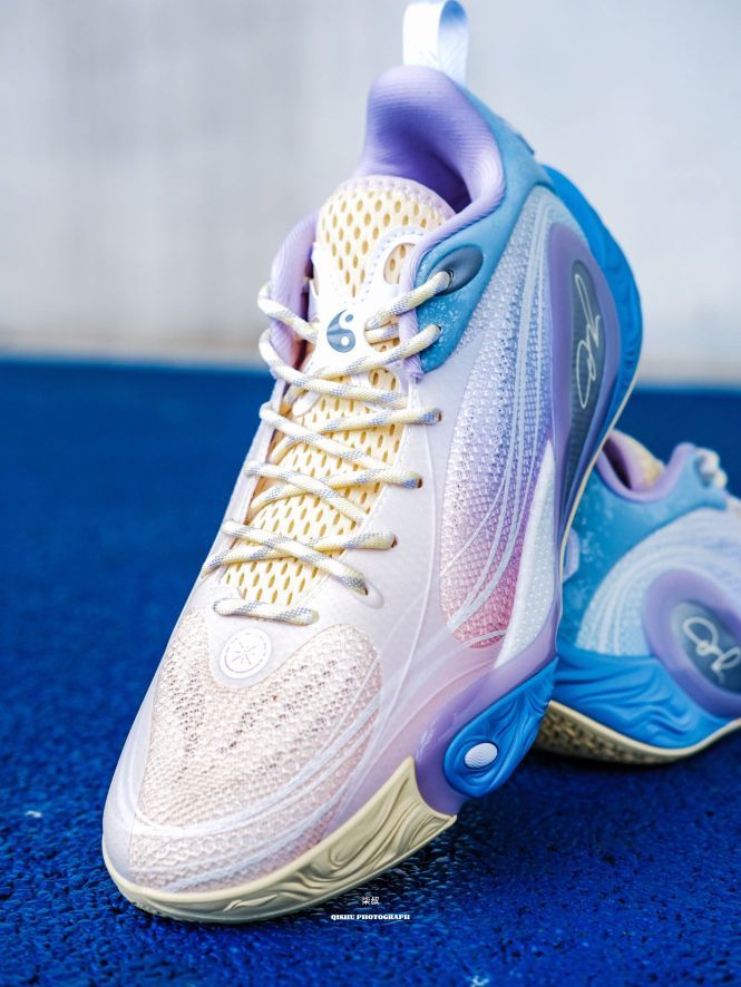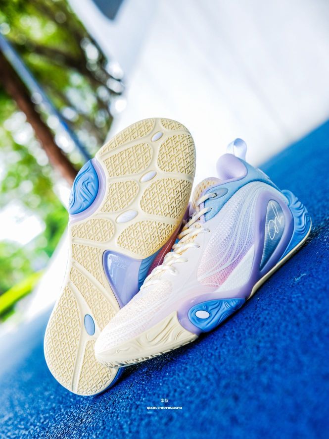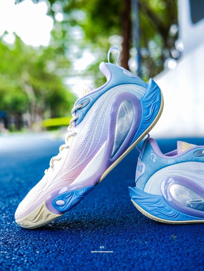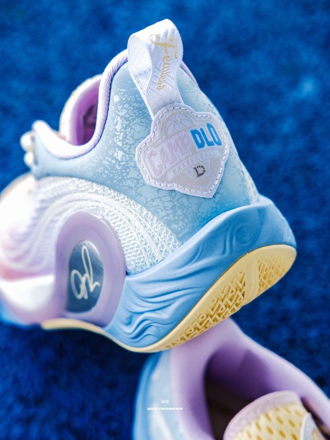 李宁DLO1此前出的配色真的每款都挺惊艳的,这次这双训练营配色更是颜值刺客!粉紫蓝渐变像把棉花糖踩在脚上,低饱和甜酷风直接戳中审美,夏天上脚就给到一种很清爽炸场的感觉。 鞋侧蝴蝶造型大TPU设计真的挺吸睛的,实在起来灵动又能打,侧向移动很稳,大幅度的变向完全可以兜住。后跟拉塞尔签名刺绣+鞋舌太极图案,球星的个人元素还是挺强的,质感直接拉满。 全掌䨻科技+后掌lightfoam ultra的中底组合...