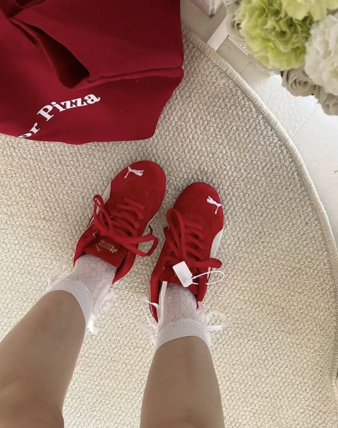 上脚朴彩英同款彪马小红鞋真的美到尖叫!正红色超显白,鞋型利落不笨重,脚感软fufu的超舒服~搭牛仔裤、短裙都巨出片,走路带风回头率爆表!皮质细腻有质感,细节做工在线,日常通勤或约会穿都很可,穿上就不想脱下来啦!