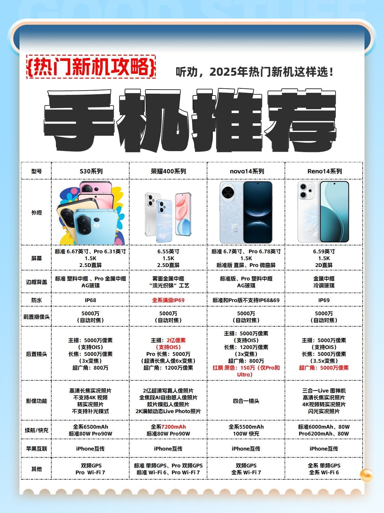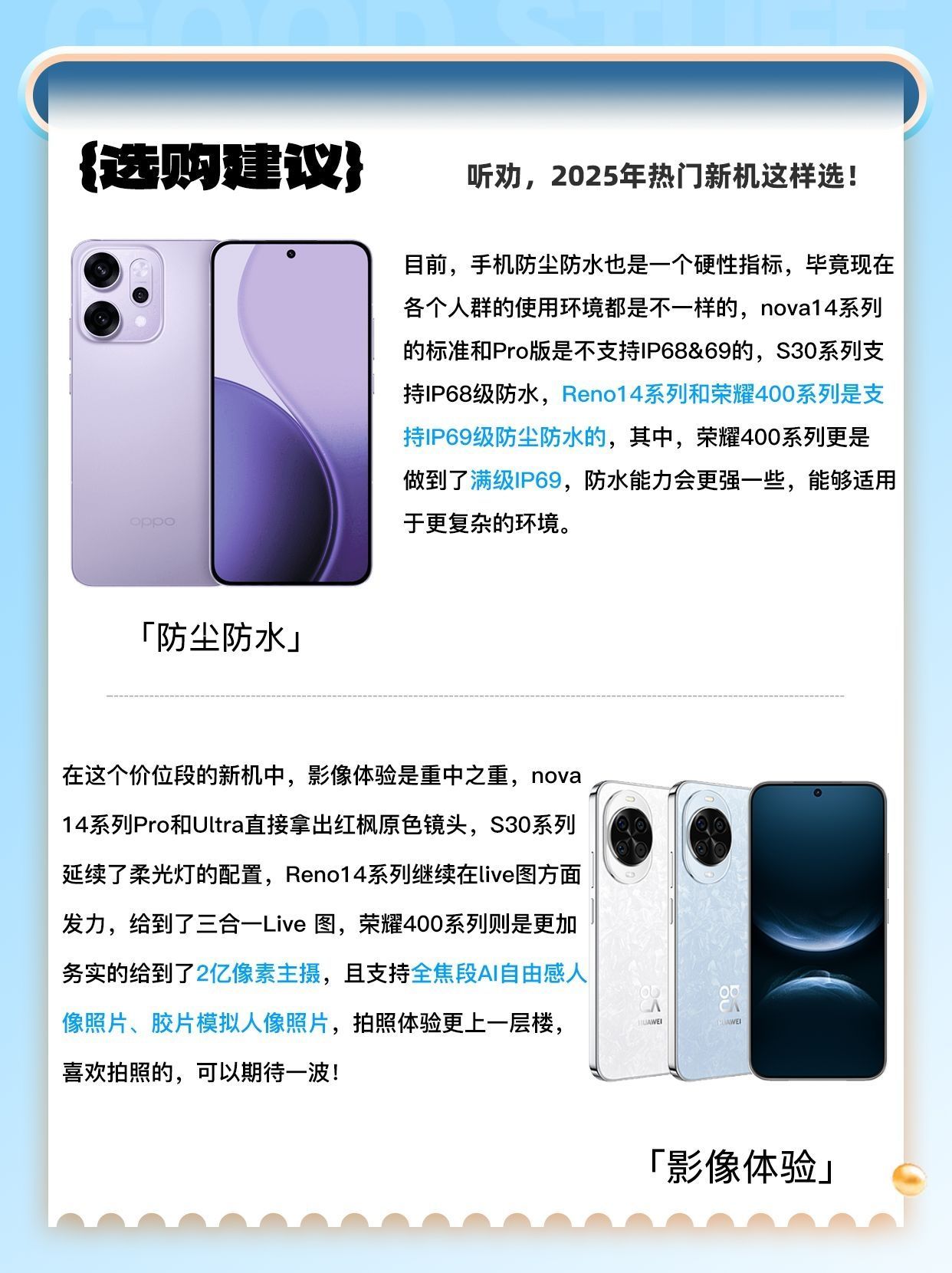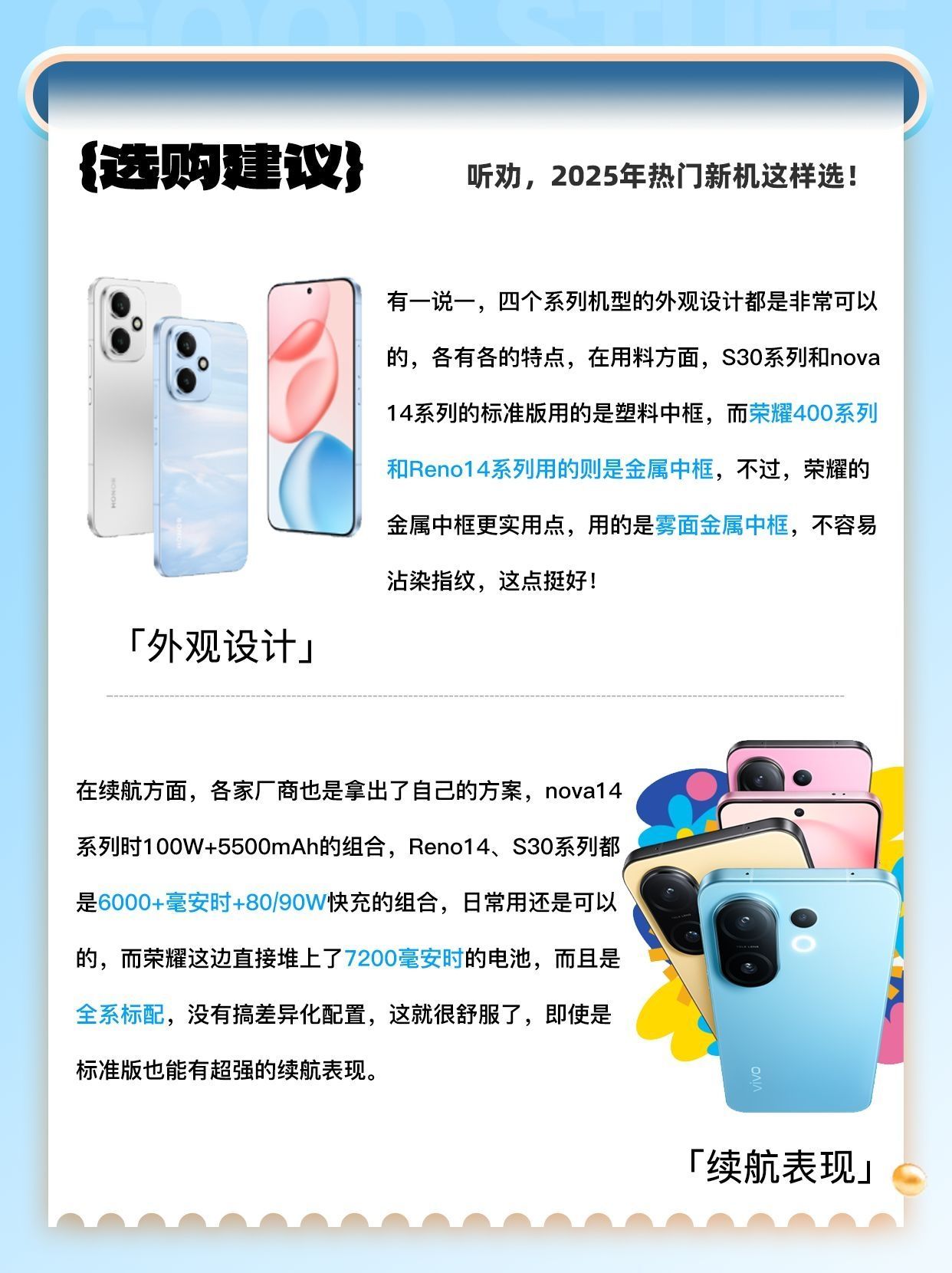 又到了“厂商打架”的月份,vivo、OPPO、荣耀、华为都在这个月有新机发布,说实在的,现在机圈是真的卷,中端机的体验都快赶上旗舰了,下面就和大家说下到底该怎么选,纠结党可以过来抄作业啦! 「外观设计」 有一说一,四个系列机型的外观设计都是非常可以的,各有各的特点,在用料方面,S30系列和nova14系列的标准版用的是塑料中框,而荣耀400系列和Reno14系列用的则是金属中框,不过,荣耀的金属...