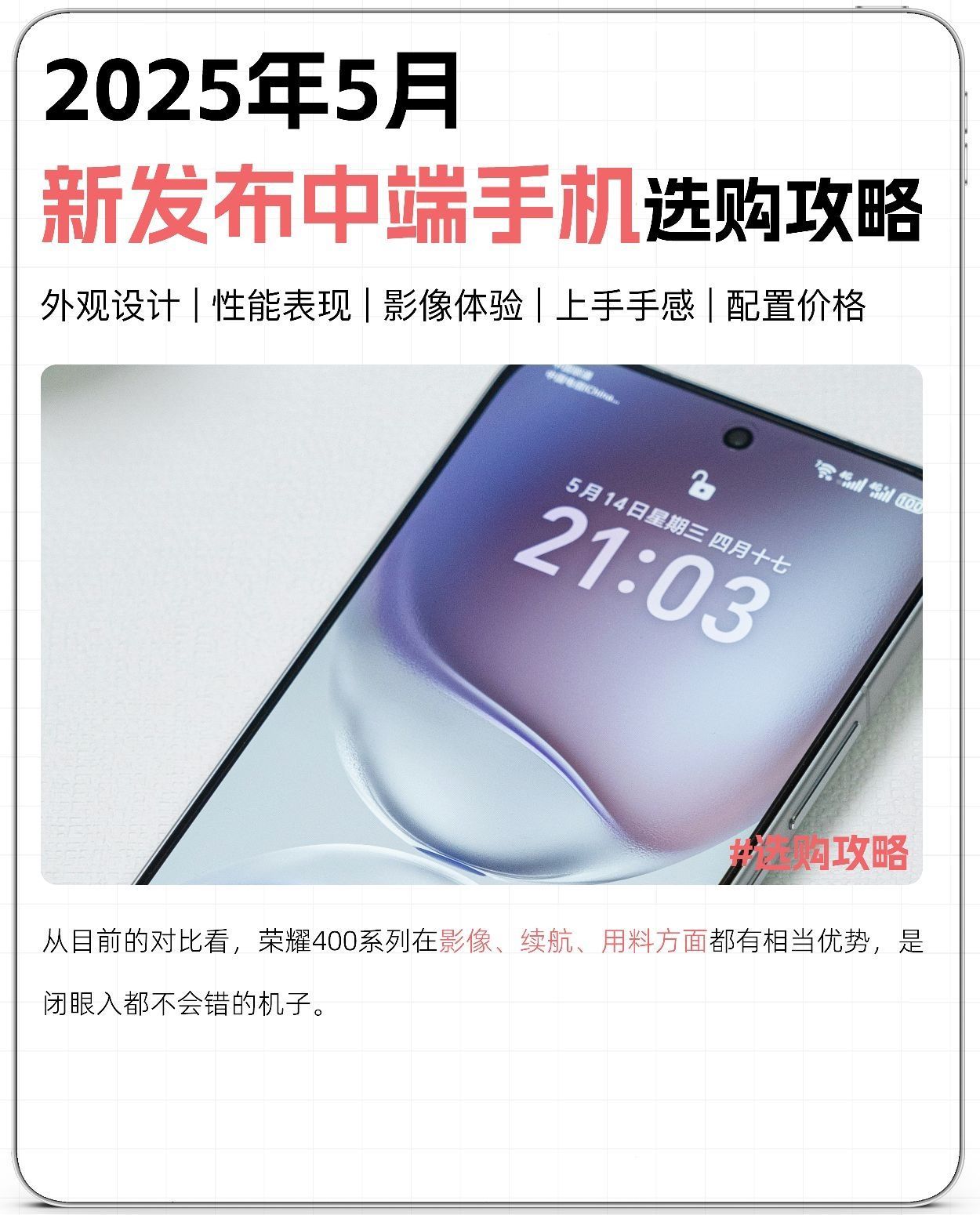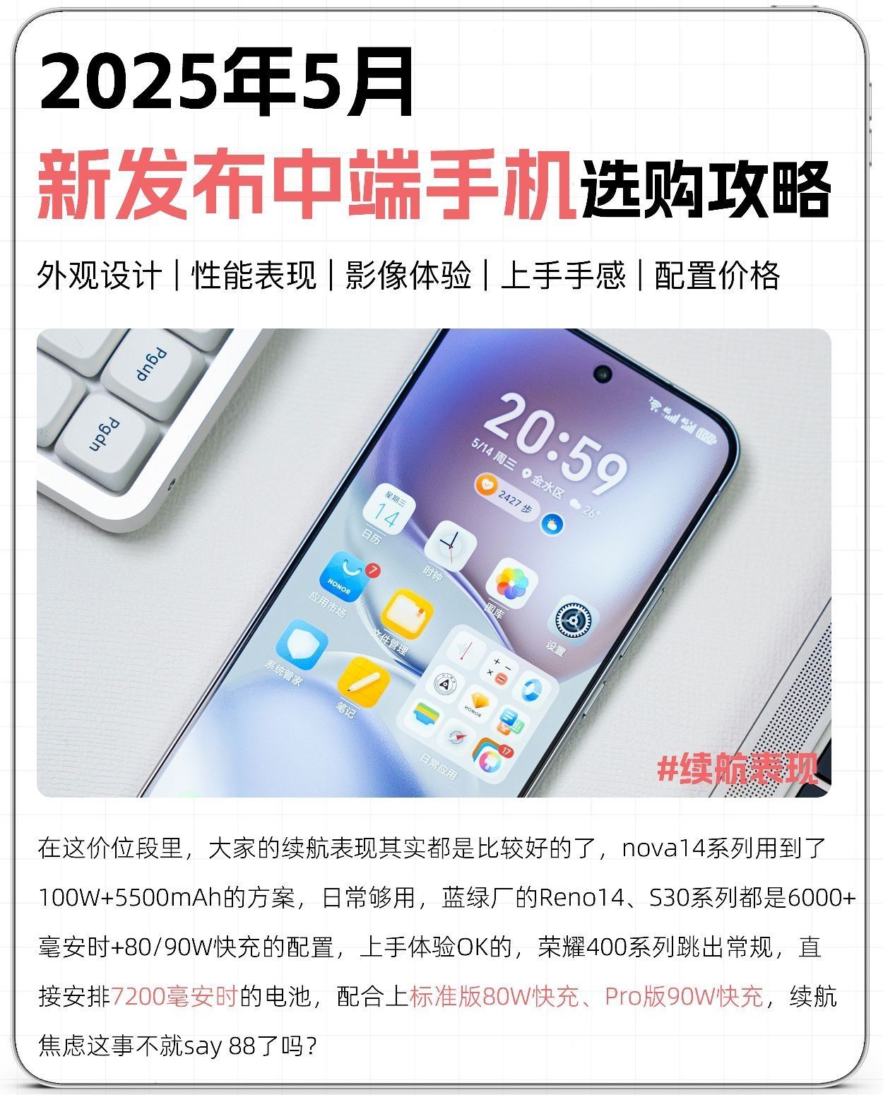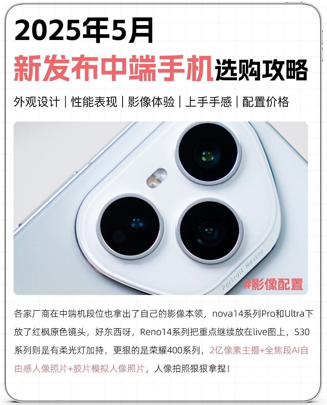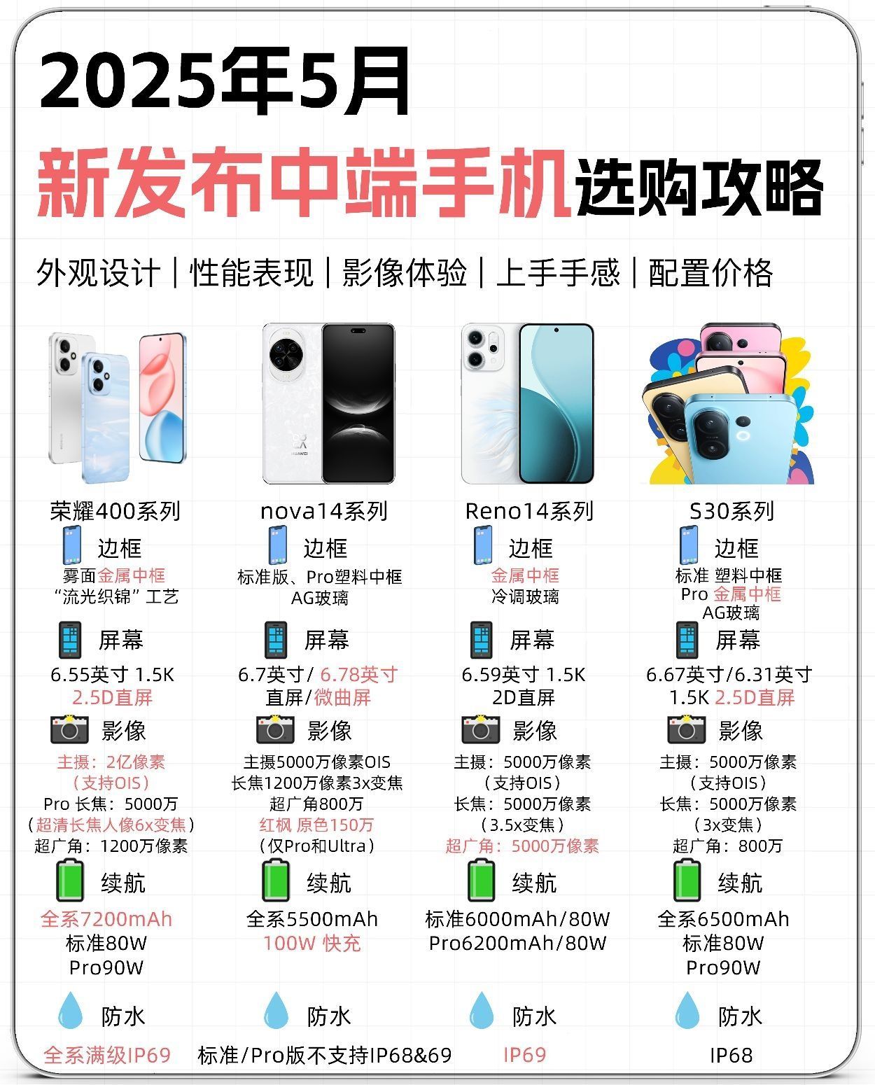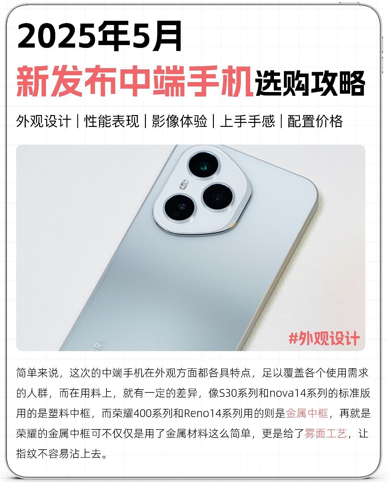 机圈太热闹了,这个5月,真的是各家厂商都在卷,体验也是蹭蹭往上涨,这对我们来说可是好事,今天,就给大家说下新中端机该怎么选! 「外观设计」 简单来说,这次的中端手机在外观方面都各具特点,足以覆盖各个使用需求的人群,而在用料上,就有一定的差异,像S30系列和nova14系列的标准版用的是塑料中框,而荣耀400系列和Reno14系列用的则是金属中框,再就是荣耀的金属中框可不仅仅是用了金属材料这么简单...