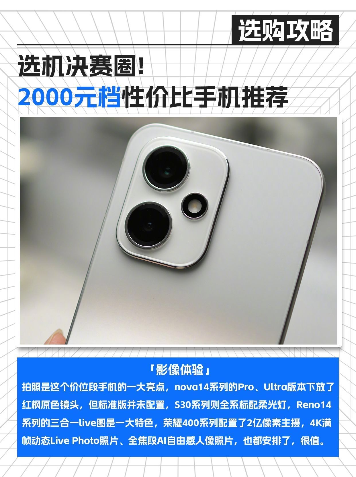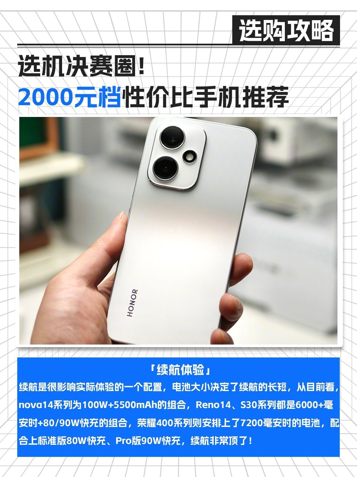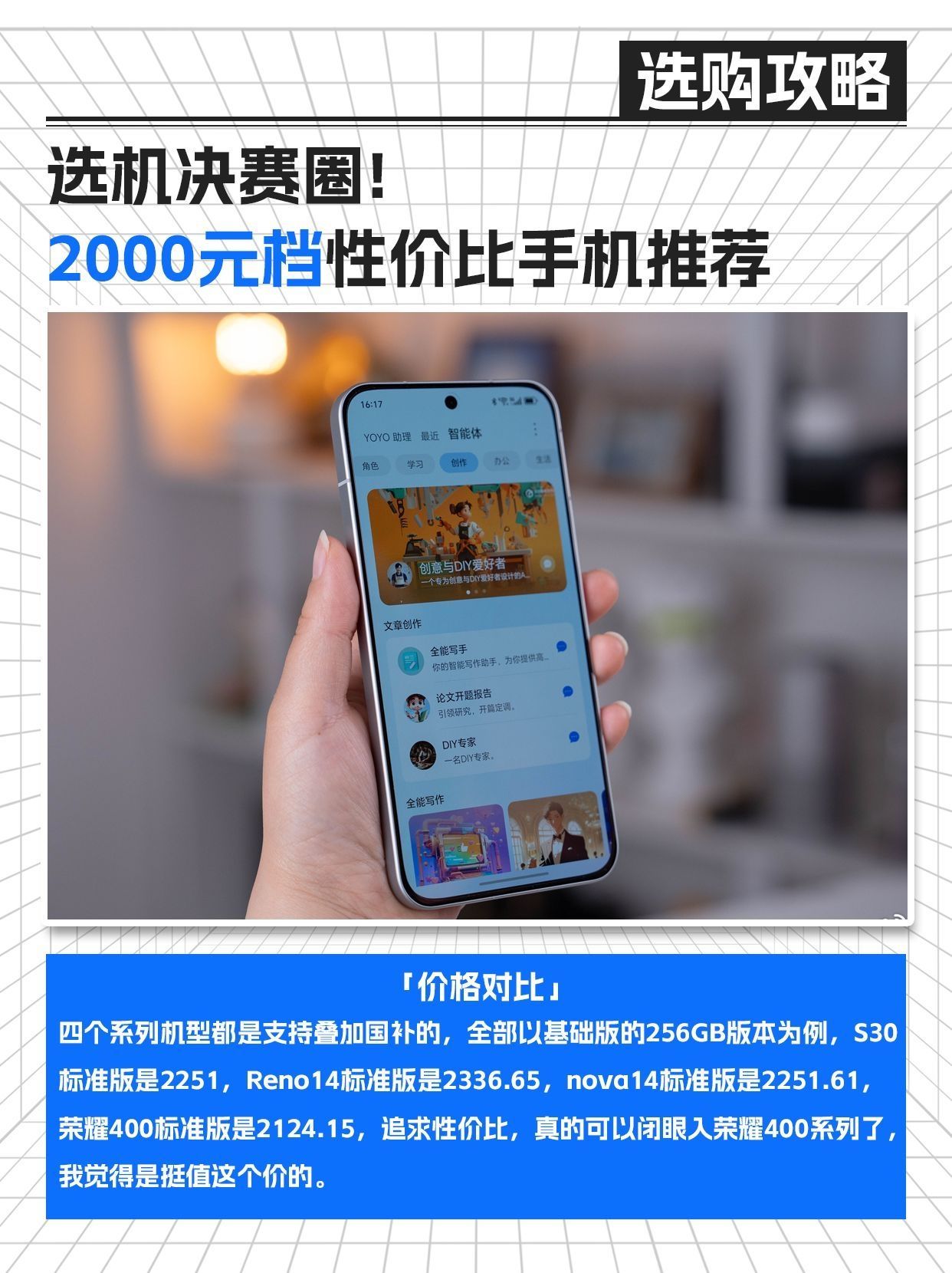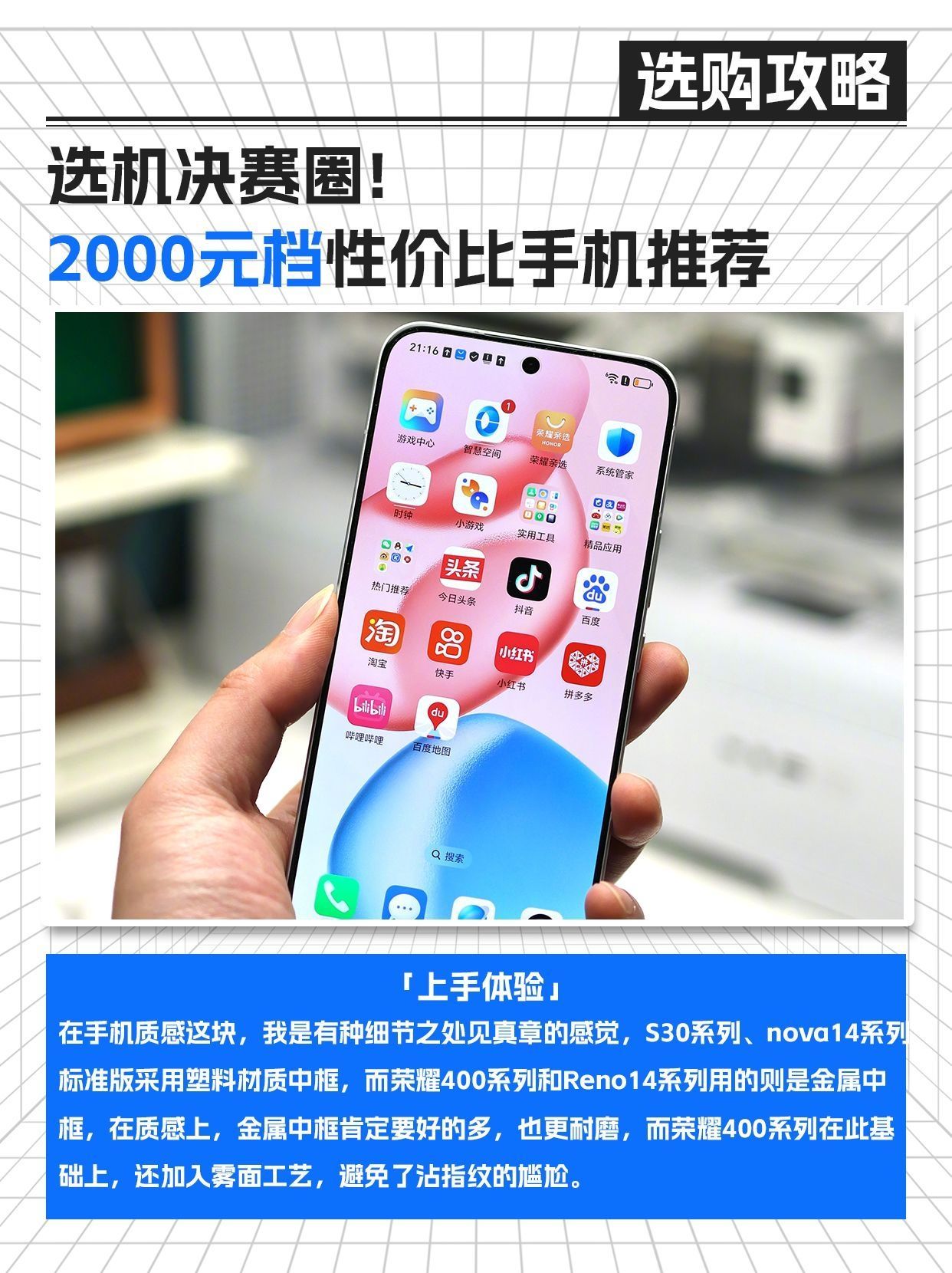 新机扎堆上市,这让人看得眼花缭乱,但是咱从性价比看就清晰的多了,叠加国补后2000元档的机型该怎么选,一起来看看! 上手体验,在手机质感这块,我是有种细节之处见真章的感觉,S30系列、nova14系列标准版采用塑料材质中框,而荣耀400系列和Reno14系列用的则是金属中框,在质感上,金属中框肯定要好的多,也更耐磨,而荣耀400系列在此基础上,还加入雾面工艺,避免了沾指纹的尴尬。 续航体验,续...