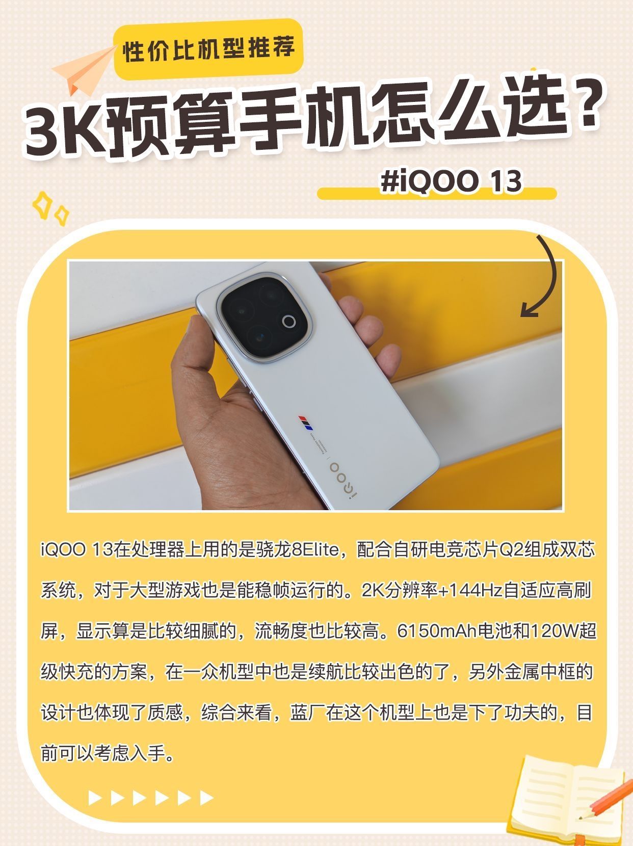 iQOO 13在处理器上用的是骁龙8Elite,配合自研电竞芯片Q2组成双芯系统,对于大型游戏也是能稳帧运行的。2K分辨率+144Hz自适应高刷屏,显示算是比较细腻的,流畅度也比较高。6150mAh电池和120W超级快充的方案,在一众机型中也是续航比较出色的了,另外金属中框的设计也体现了质感,综合来看,蓝厂在这个机型上也是下了功夫的,目前可以考虑入手。