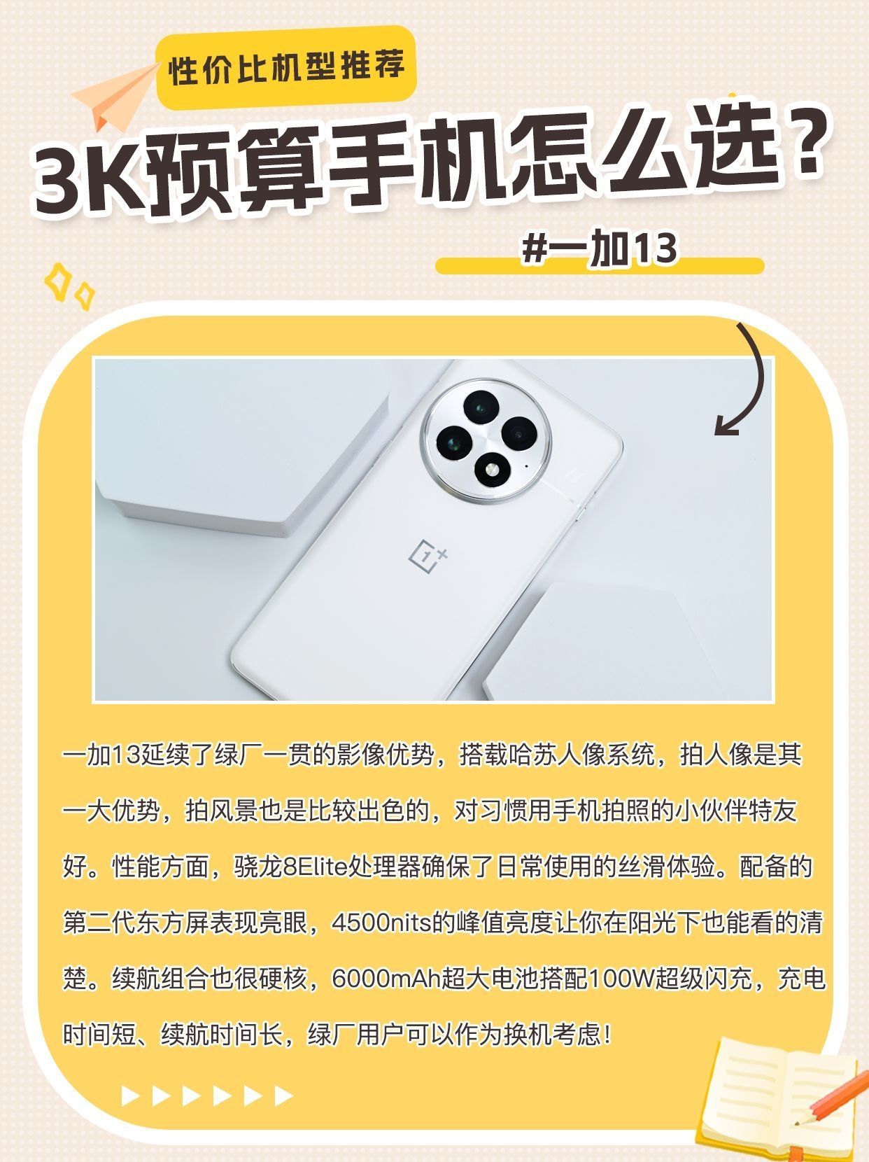 一加13延续了绿厂一贯的影像优势,搭载哈苏人像系统,拍人像是其一大优势,拍风景也是比较出色的,对习惯用手机拍照的小伙伴特友好。性能方面,骁龙8Elite处理器确保了日常使用的丝滑体验。配备的第二代东方屏表现亮眼,4500nits的峰值亮度让你在阳光下也能看的清楚。续航组合也很硬核,6000mAh超大电池搭配100W超级闪充,充电时间短、续航时间长,绿厂用户可以作为换机考虑!