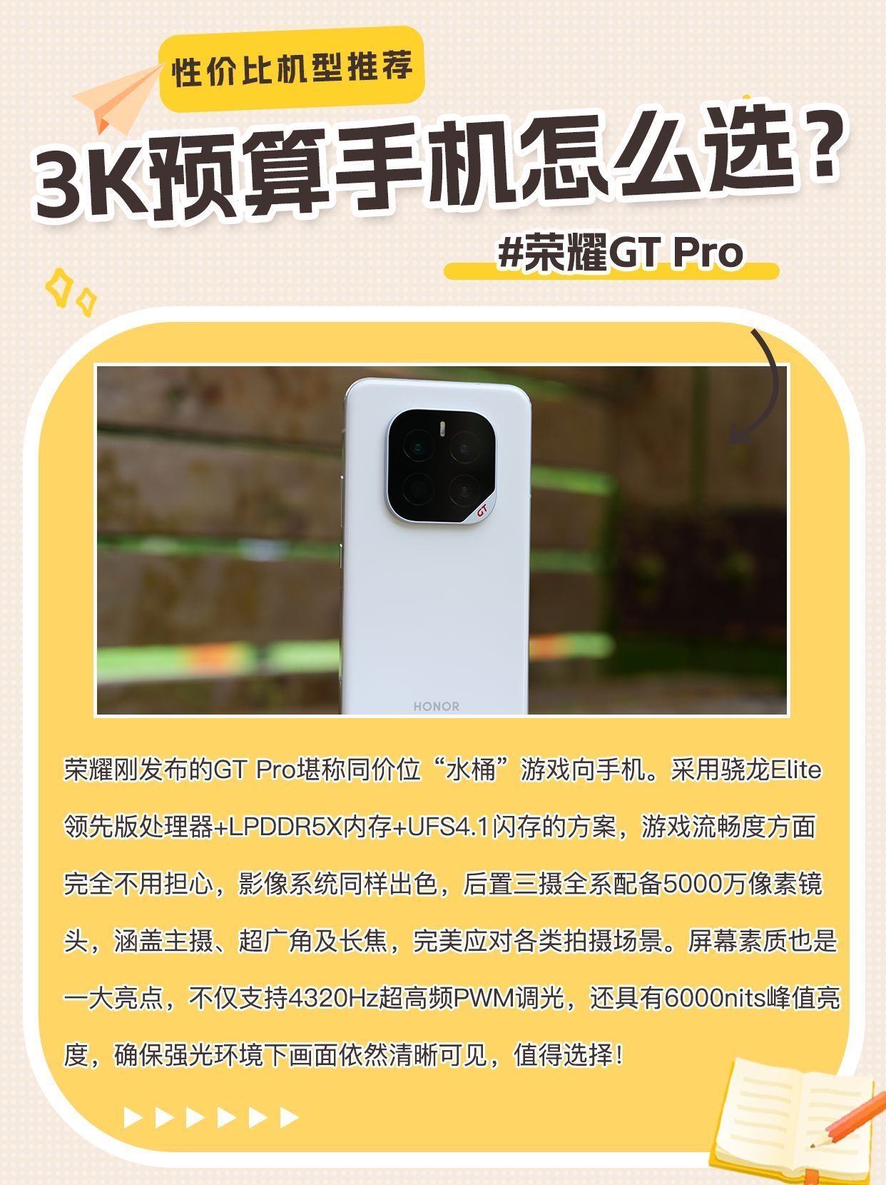 荣耀刚发布的GT Pro堪称同价位“水桶”游戏向手机。采用骁龙Elite领先版处理器+LPDDR5X内存+UFS4.1闪存的方案,游戏流畅度方面完全不用担心,影像系统同样出色,后置三摄全系配备5000万像素镜头,涵盖主摄、超广角及长焦,完美应对各类拍摄场景。屏幕素质也是一大亮点,不仅支持4320Hz超高频PWM调光,还具有6000nits峰值亮度,确保强光环境下画面依然清晰可见,值得选择!