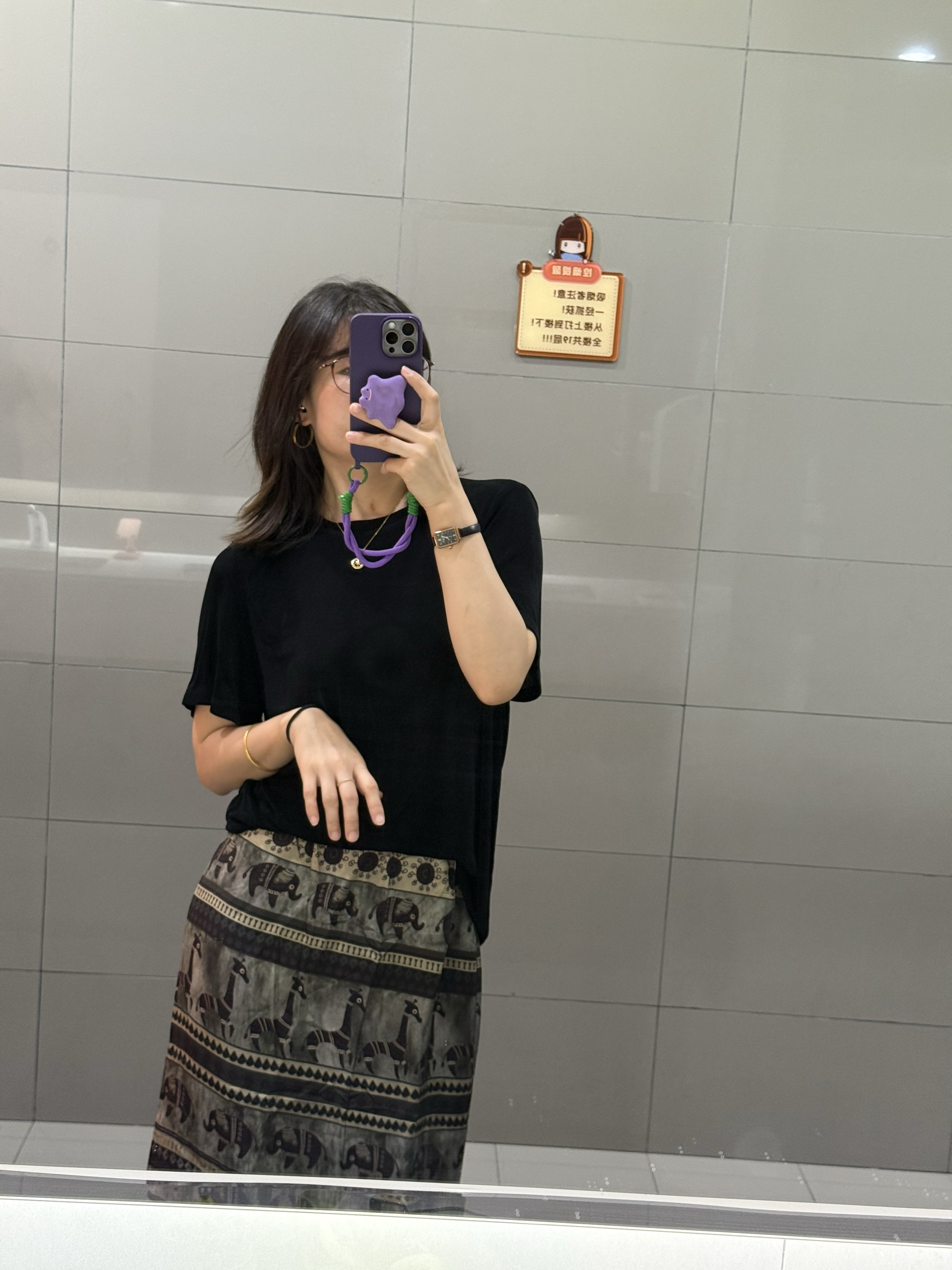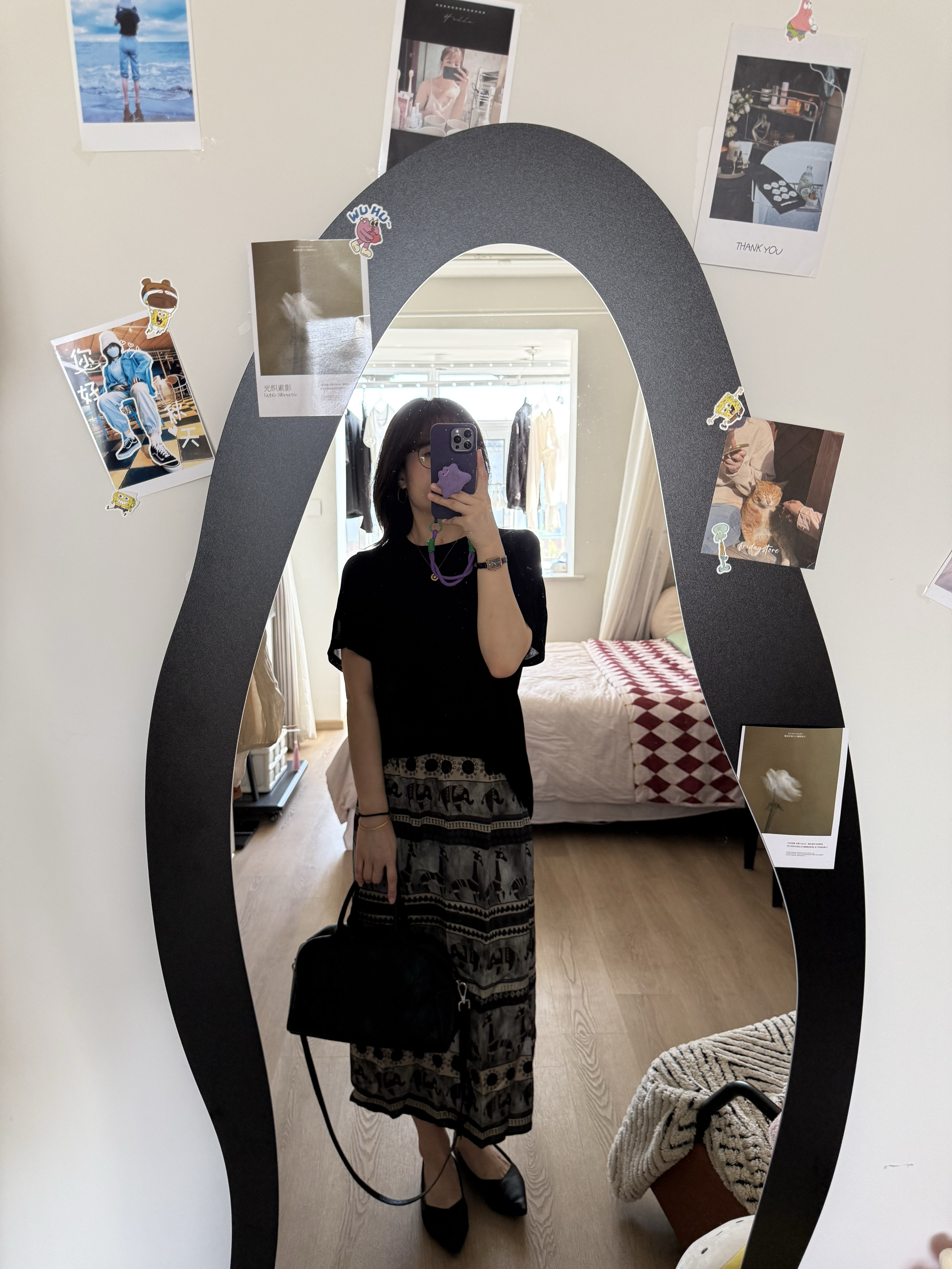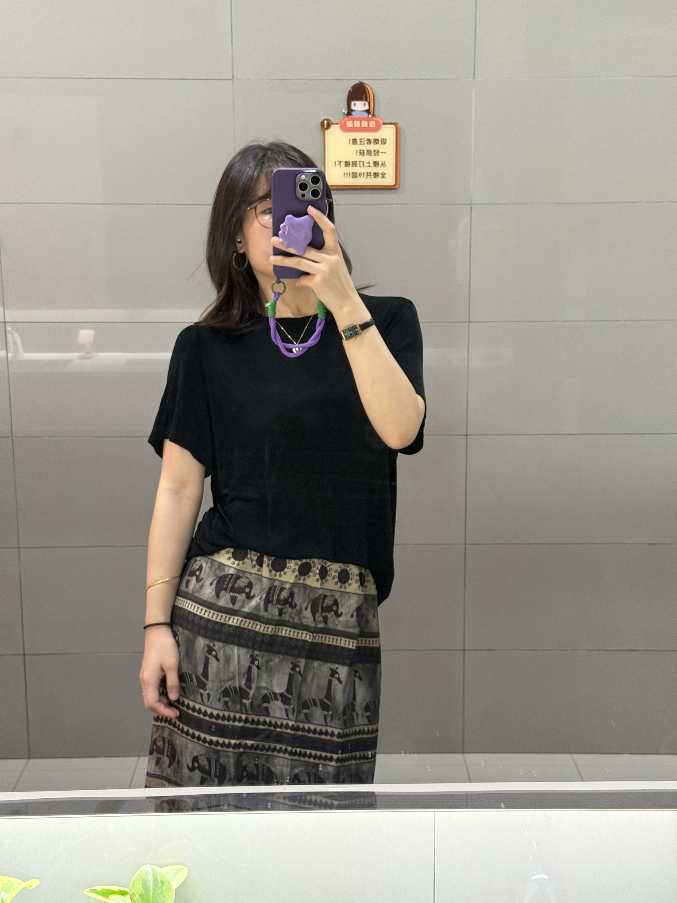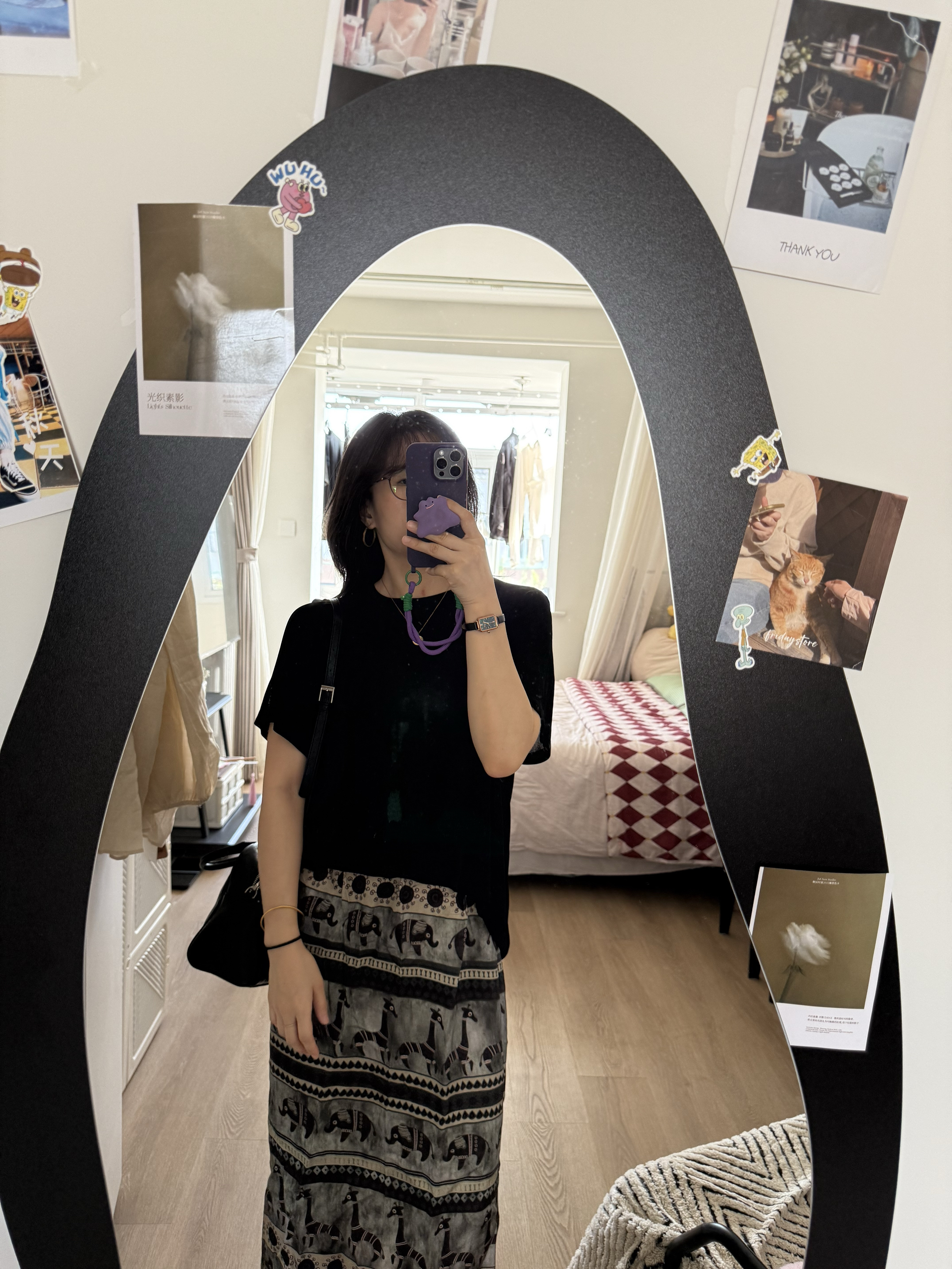 趁着夏天还没结束,把衣橱里的T恤都拿出来在穿一下吧! 黑色配上花色半裙!你学会了吗?