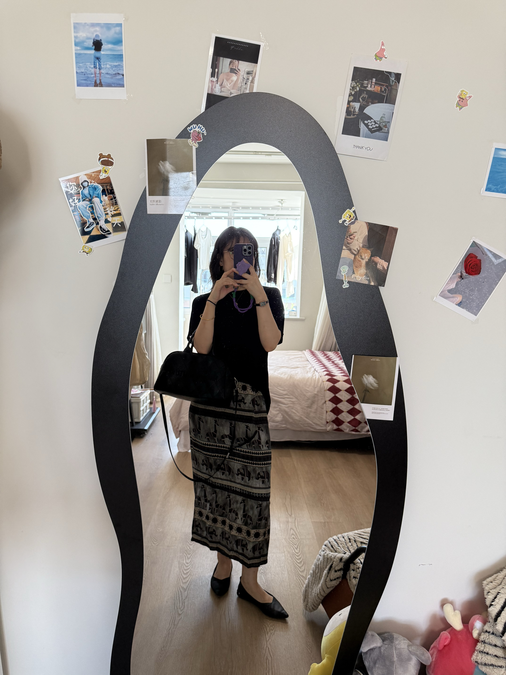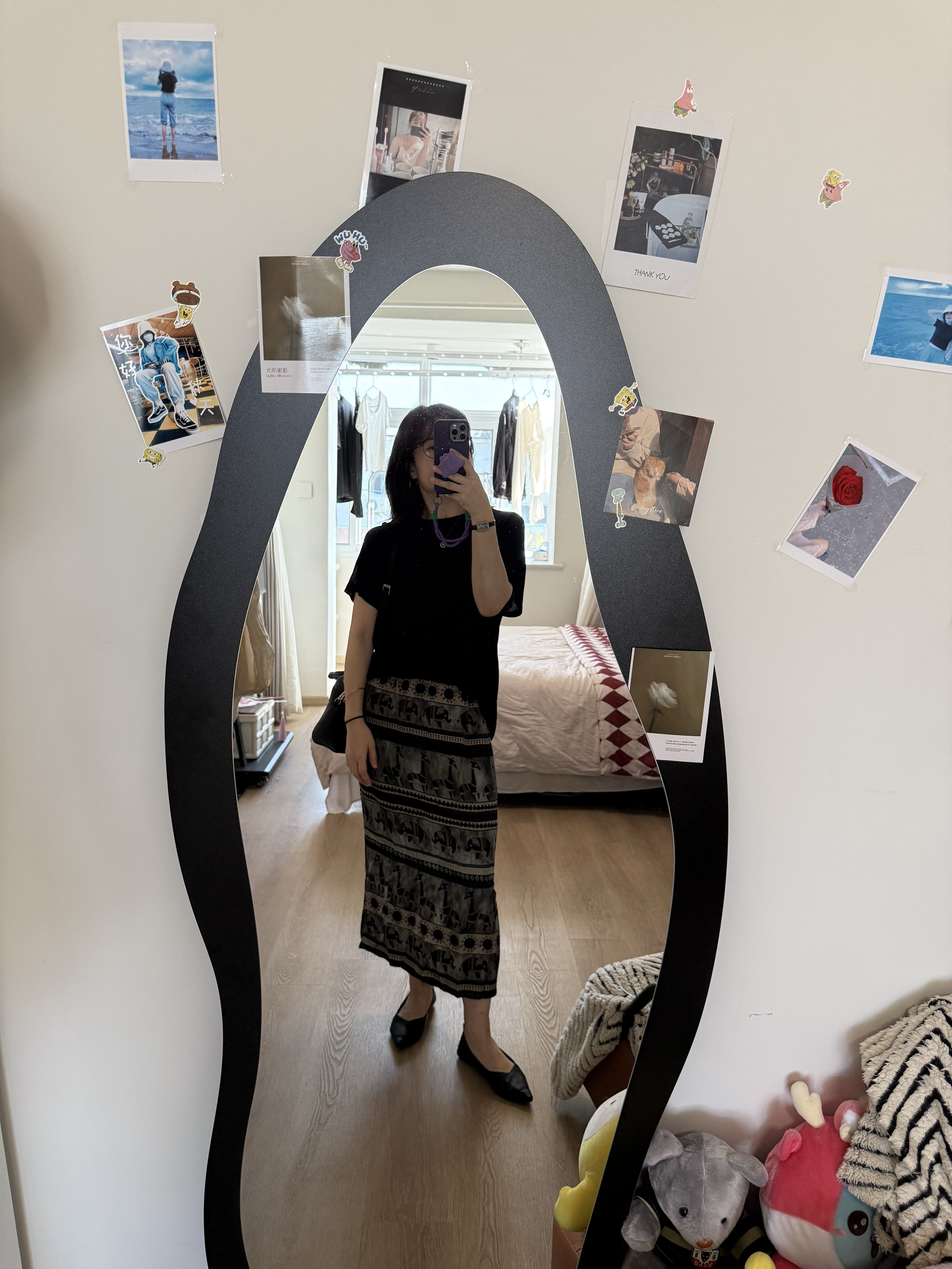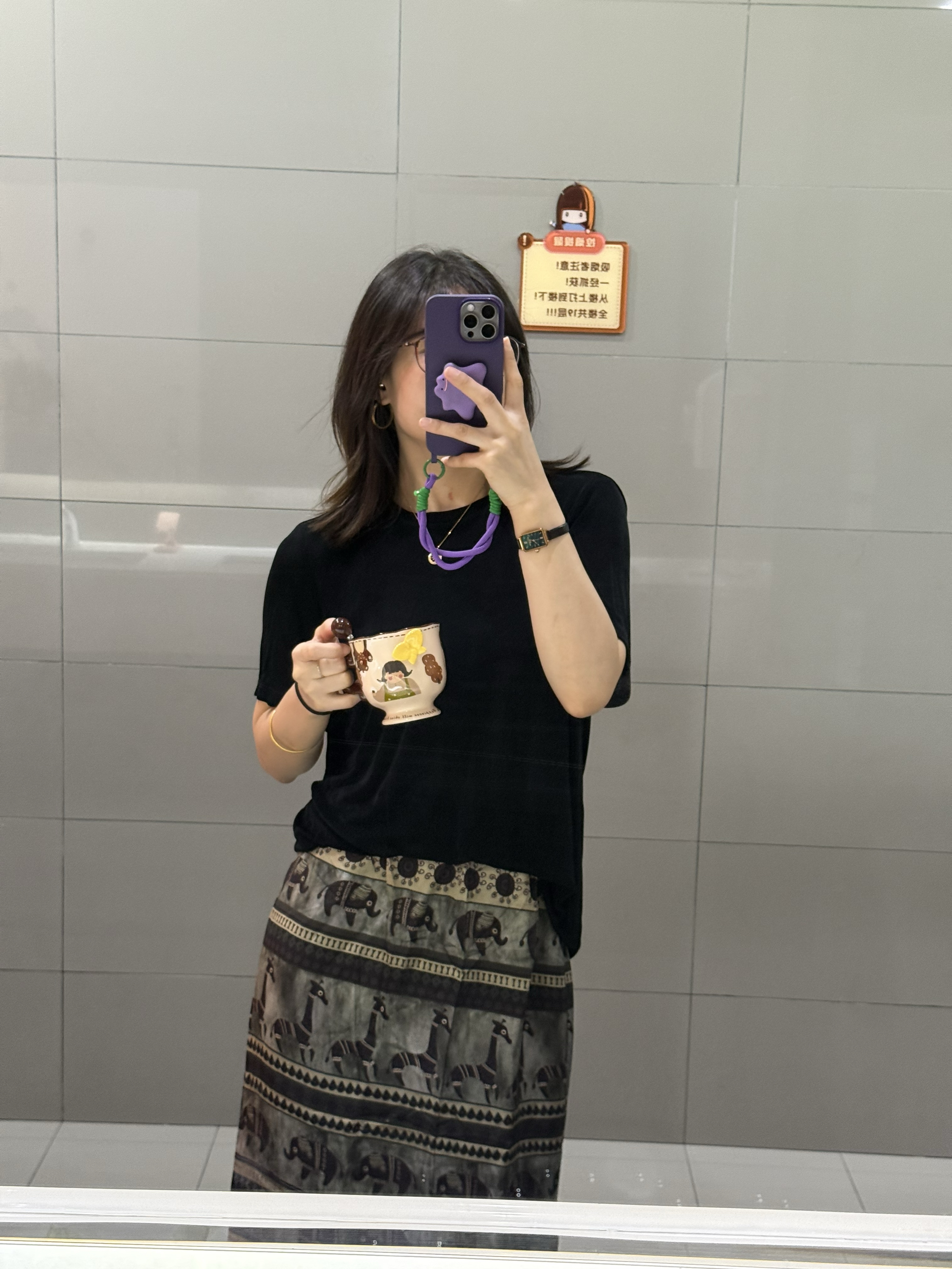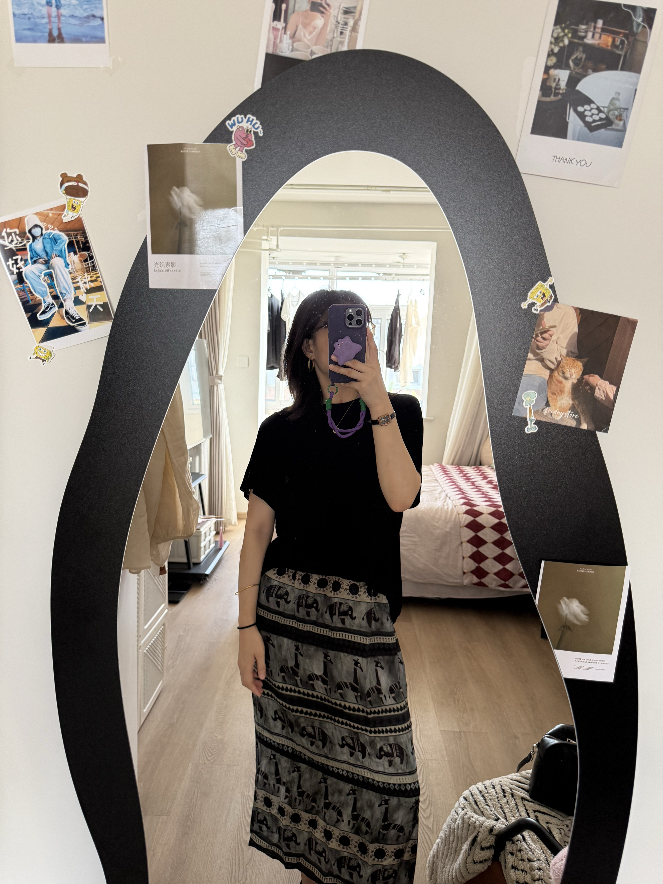 趁着夏天还没结束,把衣橱里的T恤都拿出来在穿一下吧! 黑色配上花色半裙!你学会了吗?