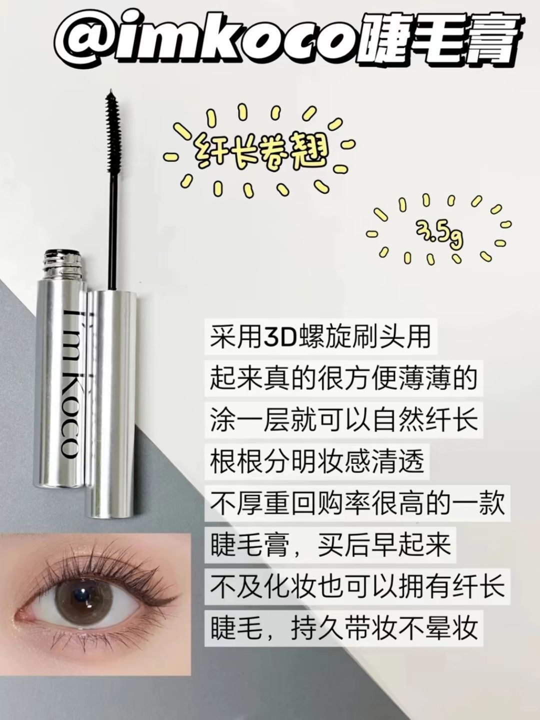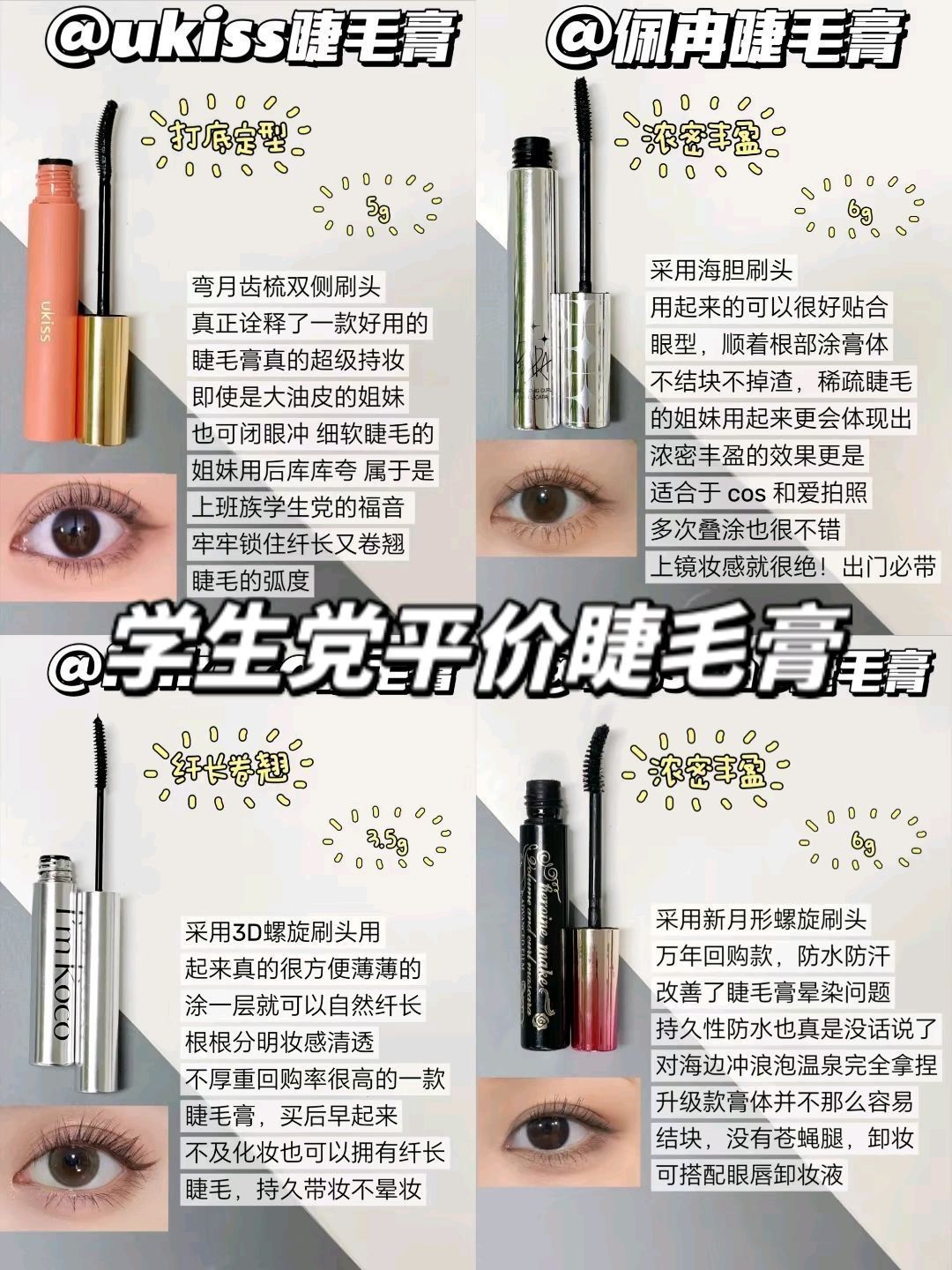 imkoco睫毛膏 根根分明的妆效超爱的呀!还不晕染超适合约会用。 ukiss睫毛膏 打底定型 纤细自然 真是牢牢锁住睫毛弧度了! 佩冉睫毛膏 海胆刷头 浓密睫毛 适合爱拍照的姐妹呀! kissme睫毛膏 防水纤长 卷翘持久 立体丰盈。 适合自己才是最好的,别再盲冲了