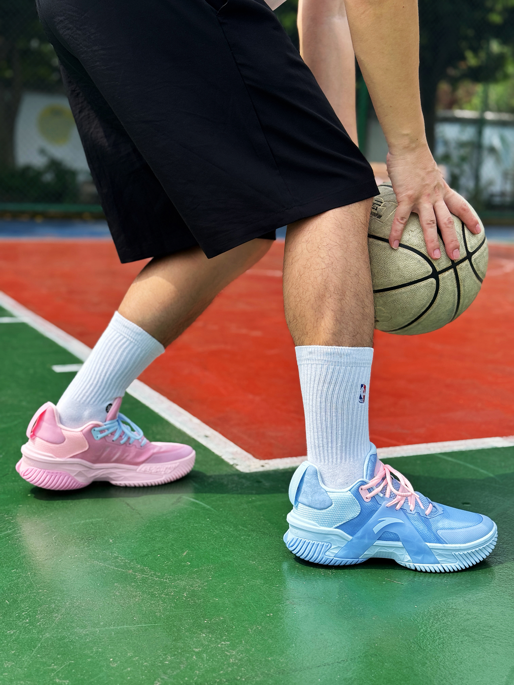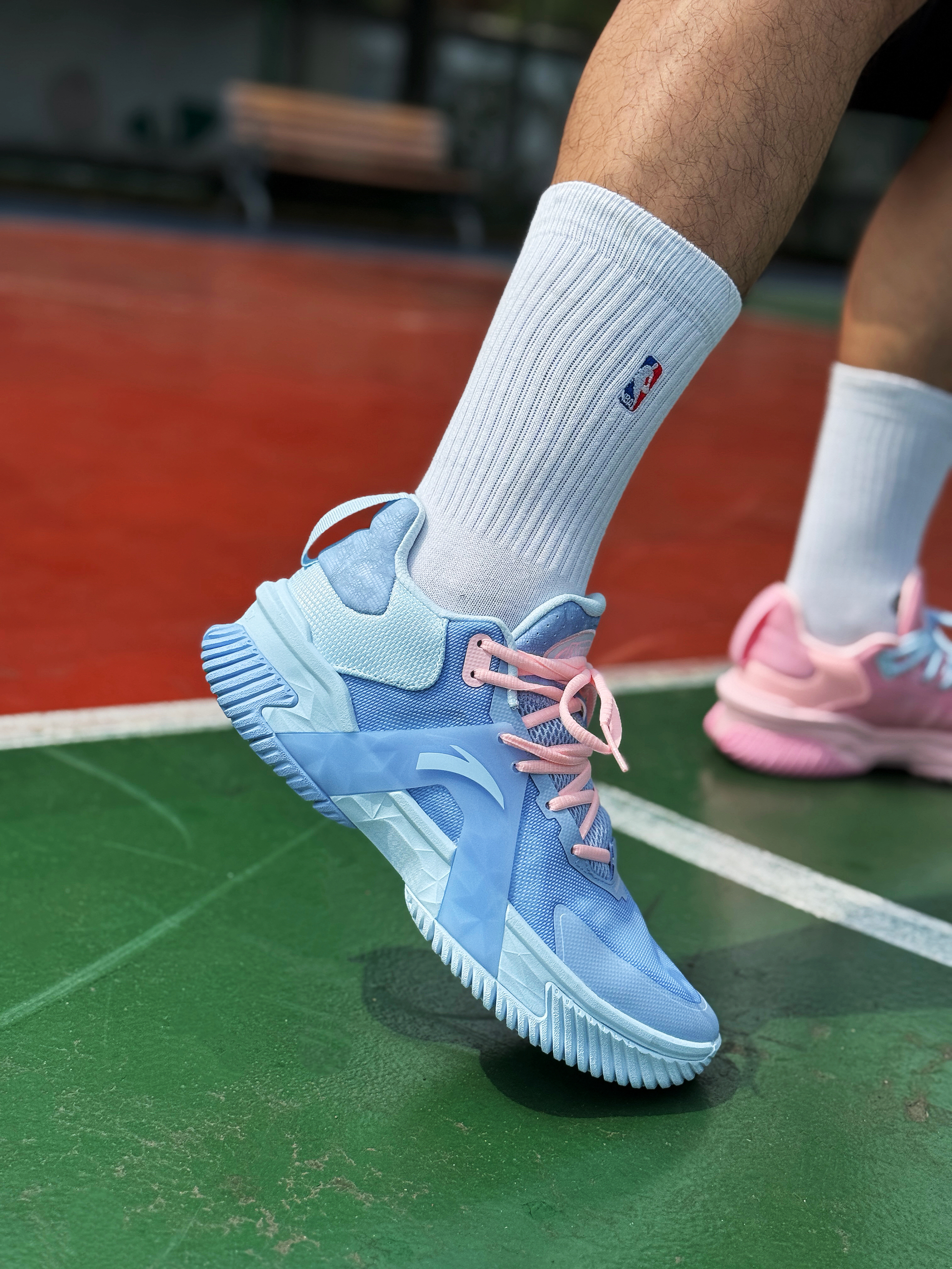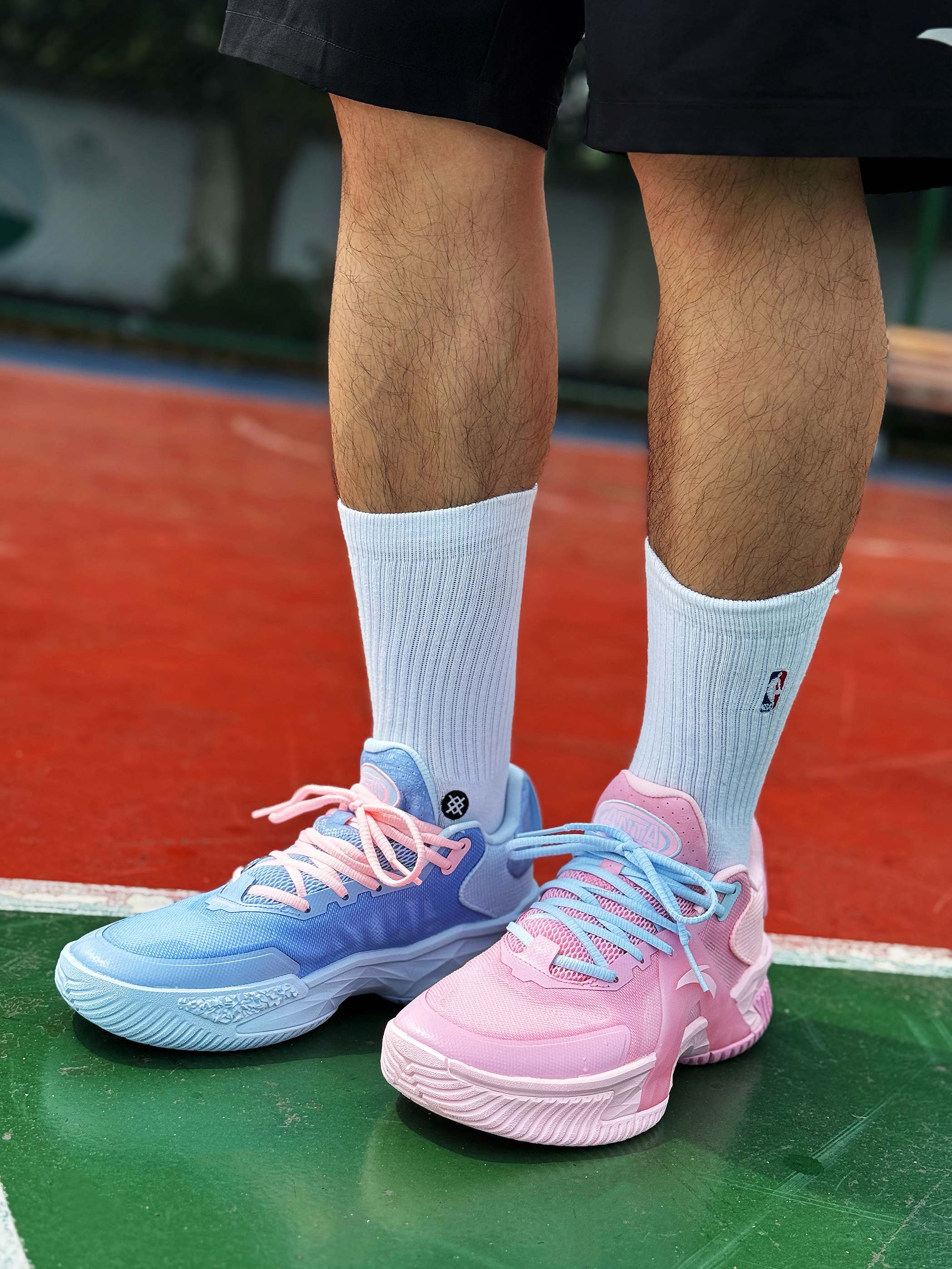 平时爱打外场的兄弟们对球鞋的要求除了帅 一定还会考虑它的耐磨性!今天上脚的这双安踏空域5鸳鸯就挺适合的! 粉蓝鸳鸯搭配很适合多彩的夏季!网布鞋面轻薄透气 整体包裹舒适!A-Flashedge + 水泥克星外底 脚感轻质韧弹 耐磨抓地不错!平时外场实战完全够用了 适合正常脚型 尺码正常选择!