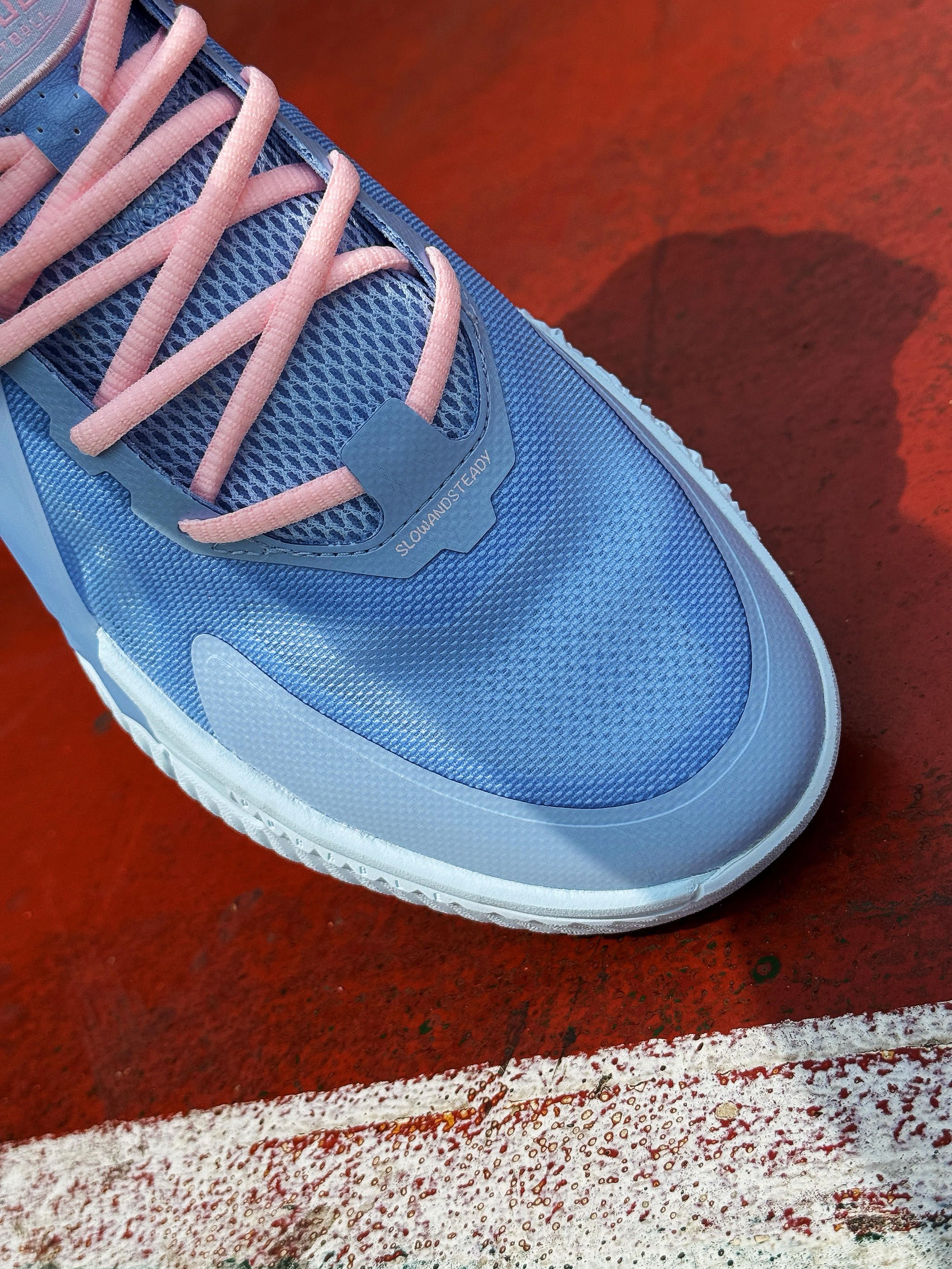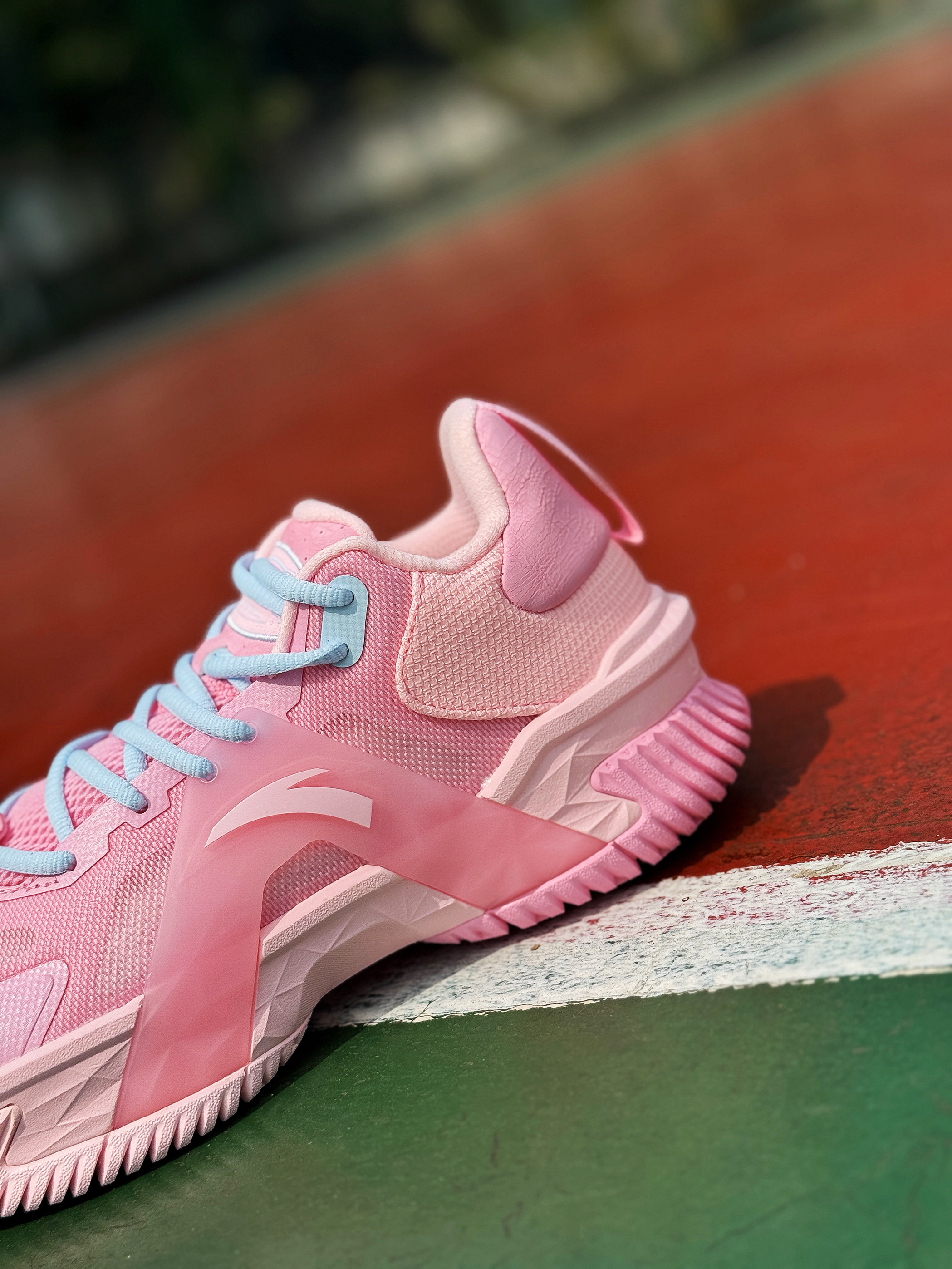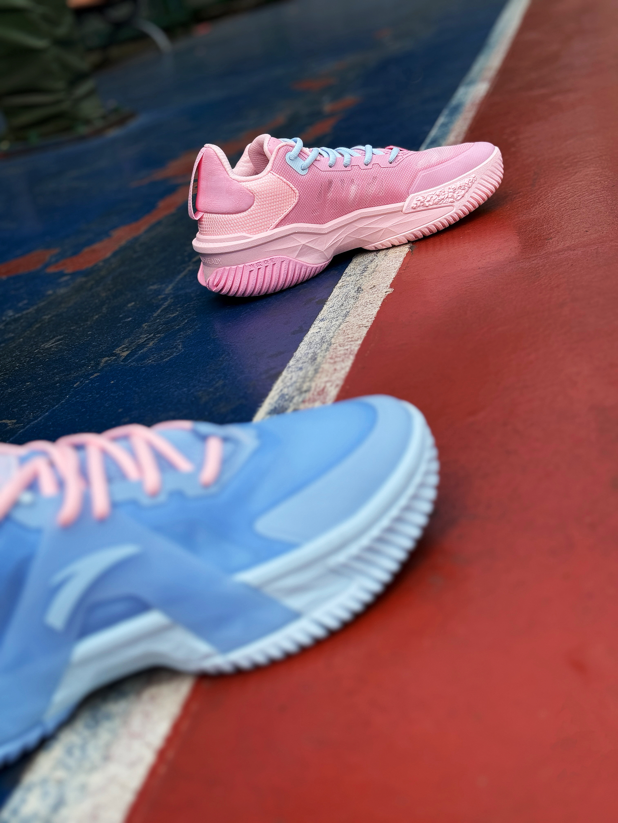 平时爱打外场的兄弟们对球鞋的要求除了帅 一定还会考虑它的耐磨性!今天上脚的这双安踏空域5鸳鸯就挺适合的! 粉蓝鸳鸯搭配很适合多彩的夏季!网布鞋面轻薄透气 整体包裹舒适!A-Flashedge + 水泥克星外底 脚感轻质韧弹 耐磨抓地不错!平时外场实战完全够用了 适合正常脚型 尺码正常选择!