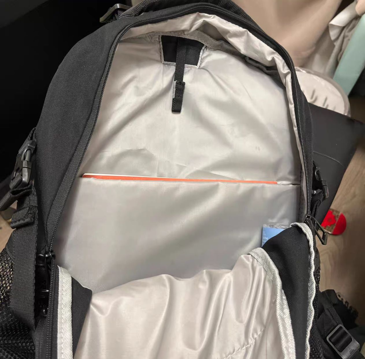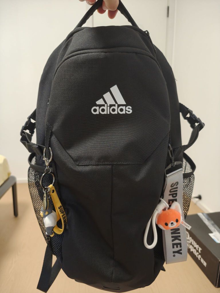 阿迪达斯运动户外背包,大小在25L到30L左右,正面有挂点,可以通过D型扣挂载物品。副袋里面有钥匙扣,一个网布隔层和一个拉链口袋,拉链口袋大概半个手掌长。主袋里有一个电脑分隔,可以放笔记本,水袋,也可以利用这个挂点挂一个mp3,通过顶部的水管口放耳机线或者充电宝线。这个包有重心调节带,背面是阿迪达斯的AREOREADY面料,所谓这个面料其实就是稍微透点气,当然背负也去确实还不错。