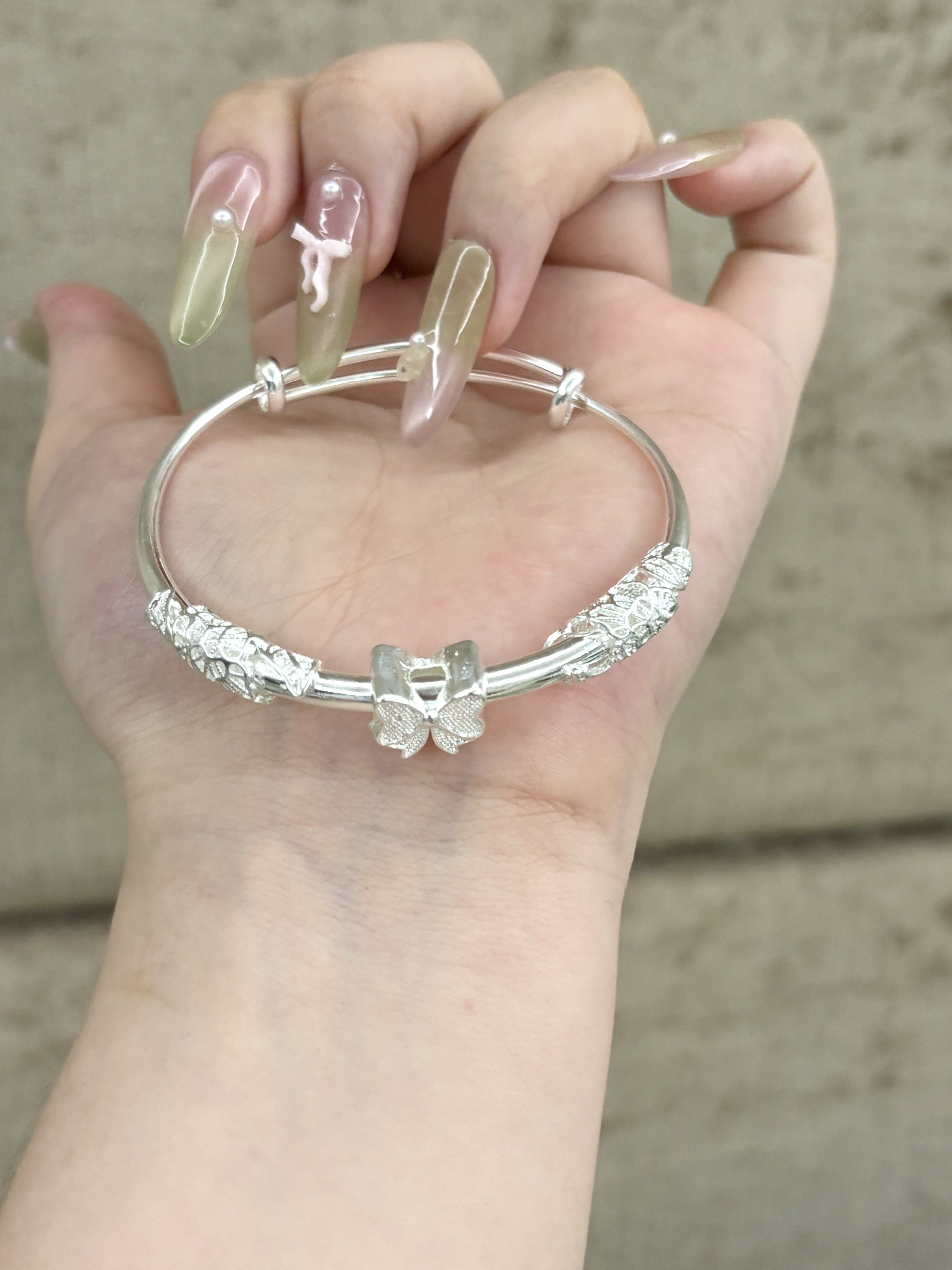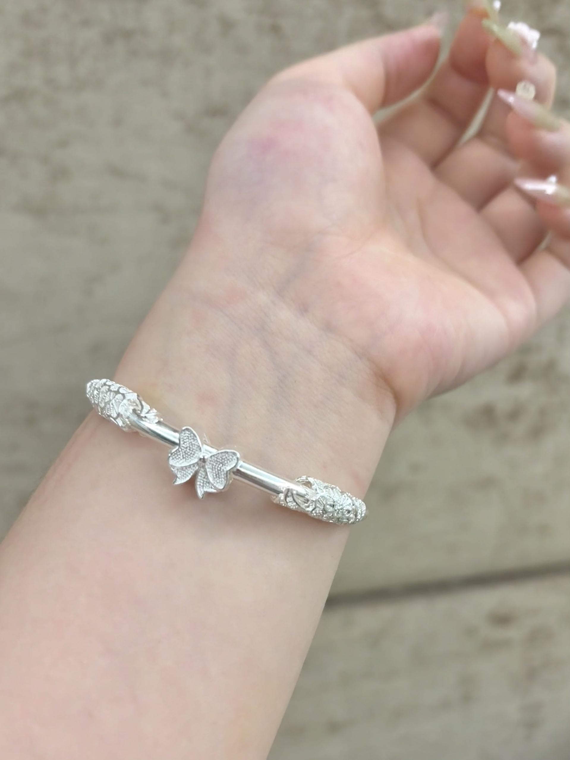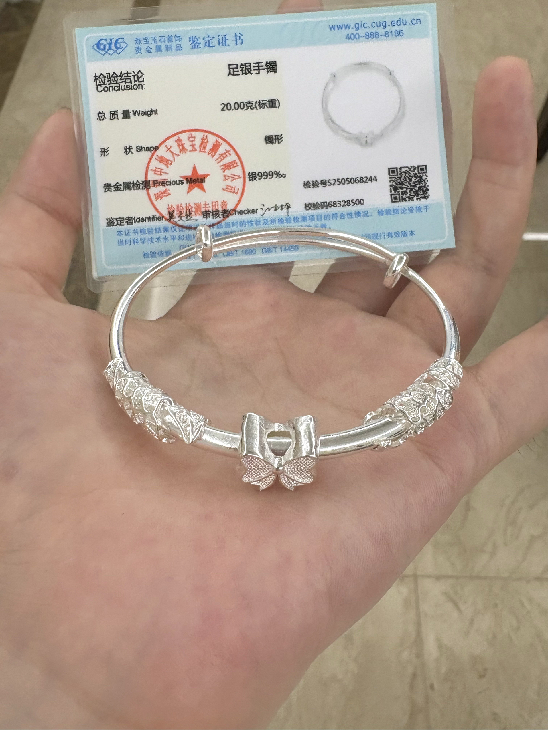 这个当七夕礼物太合适啦 这款的款式很精致!上面是蝴蝶🦋的装饰,和繁花浮雕设计,戴在手上很有质感,显的手又细又白. 是足银999 有20g 是足重的,戴在手上很有质感! 准备这个礼物包不出意外的!