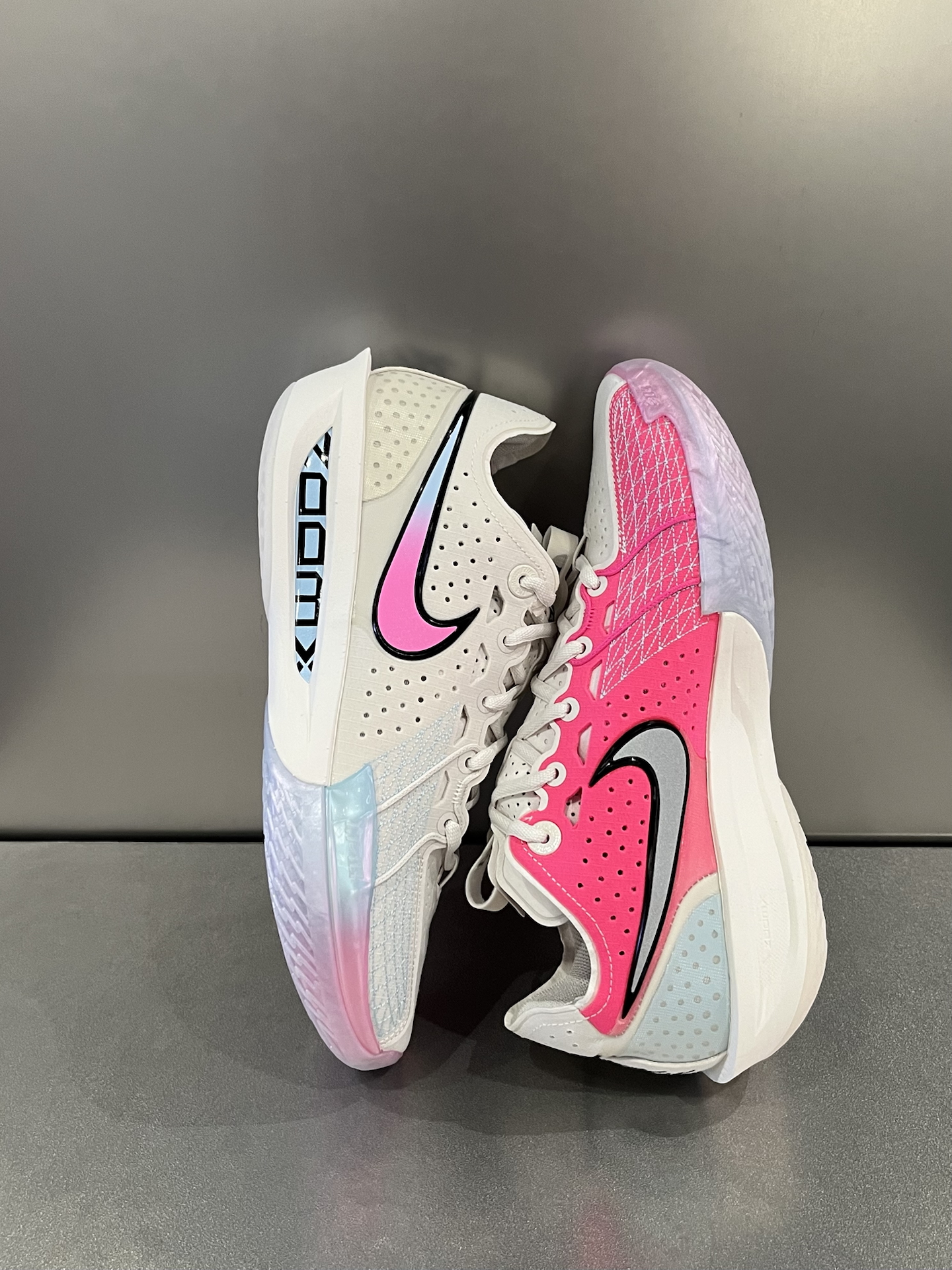 - 外观:鞋身用了轻薄发泡材质,淡蓝色液态金属质感鞋面,搭配银色Swoosh和后跟GT徽章,还有贯穿鞋身的锯齿纹理,未来感十足,颜值直接拉满。非对称鞋带系统很吸睛,不仅独特还能提升包裹感,内侧足弓中底有额外填充,支撑和包裹值得期待。 - 缓震:虽说中底科技还没官宣,但按耐克对GT系列的重视程度,大概率会延续ZoomX加全掌Zoom Strobel的组合。ZoomX轻弹,全掌Zoom Strobe...