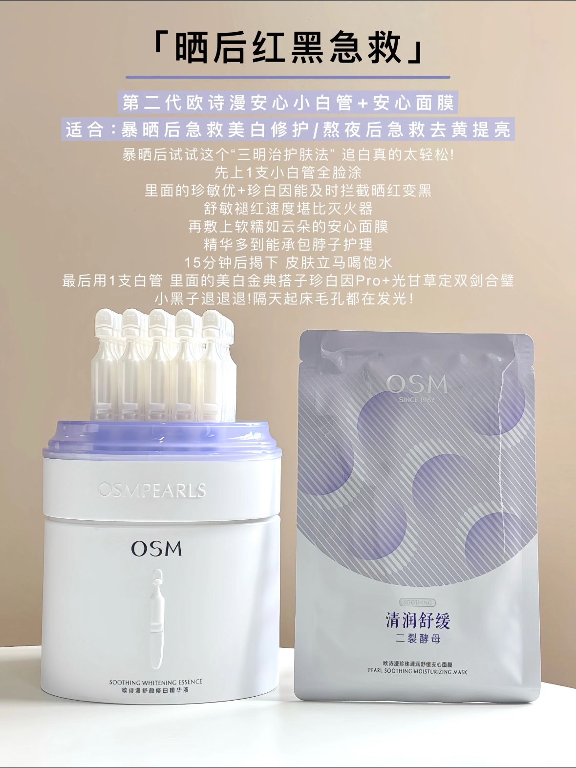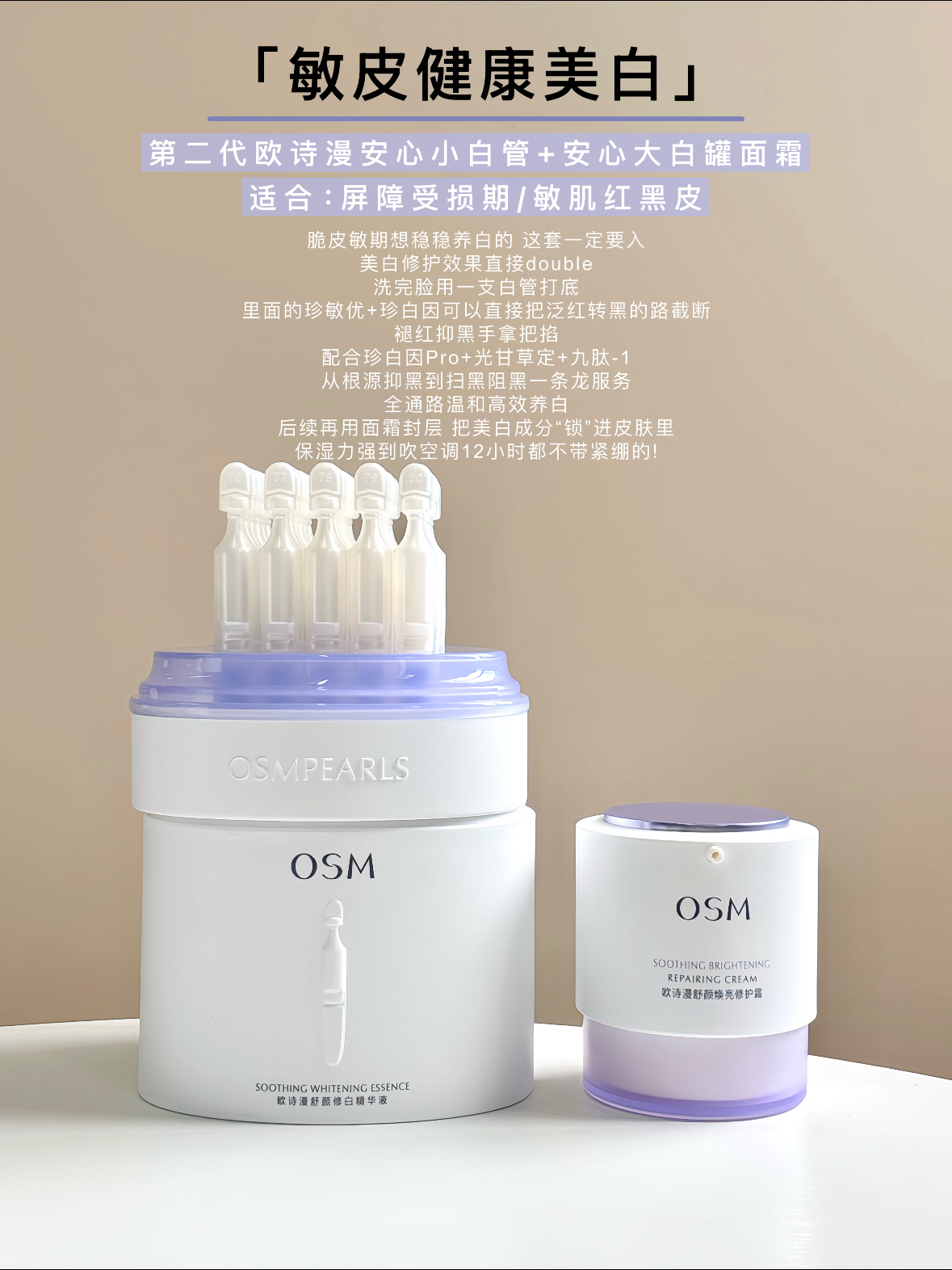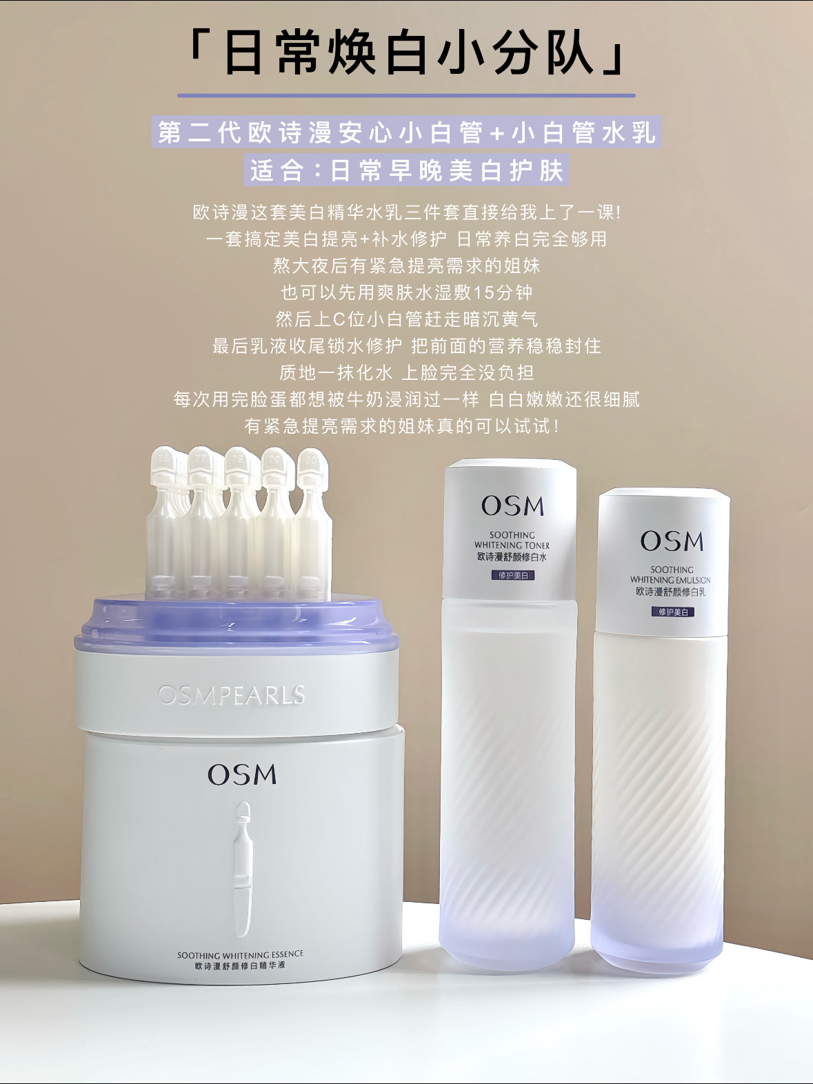姐妹们!欧诗漫安心小白管 我从一代追到第二代 是真爱没跑了! 名字就叫“安心”用起来是真・安心又真・能白! 温和到不行,美白效果却一点不含糊! 但!是!我今天放大招了又给它找了4个“神仙队友” 效果直接原地起飞1+1>2用完皮肤那叫一个透亮! 作业本都给你们准备好了 快抄! 「日常焕白小分队」 第二代欧诗漫安心小白管+小白管水乳 适合:日常早晚美白护肤 「敏皮健康美白」 第二代欧詩漫安心小白管+安...