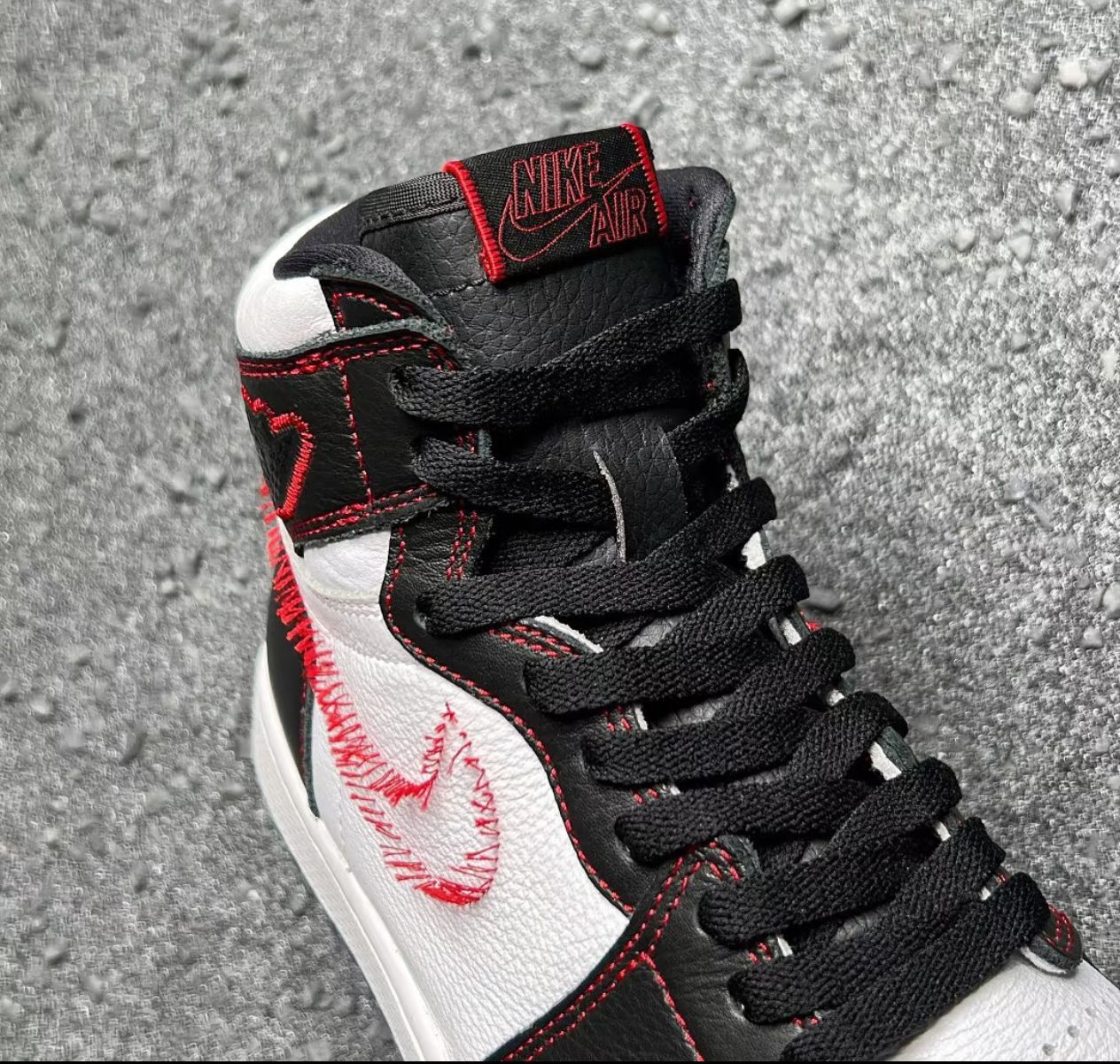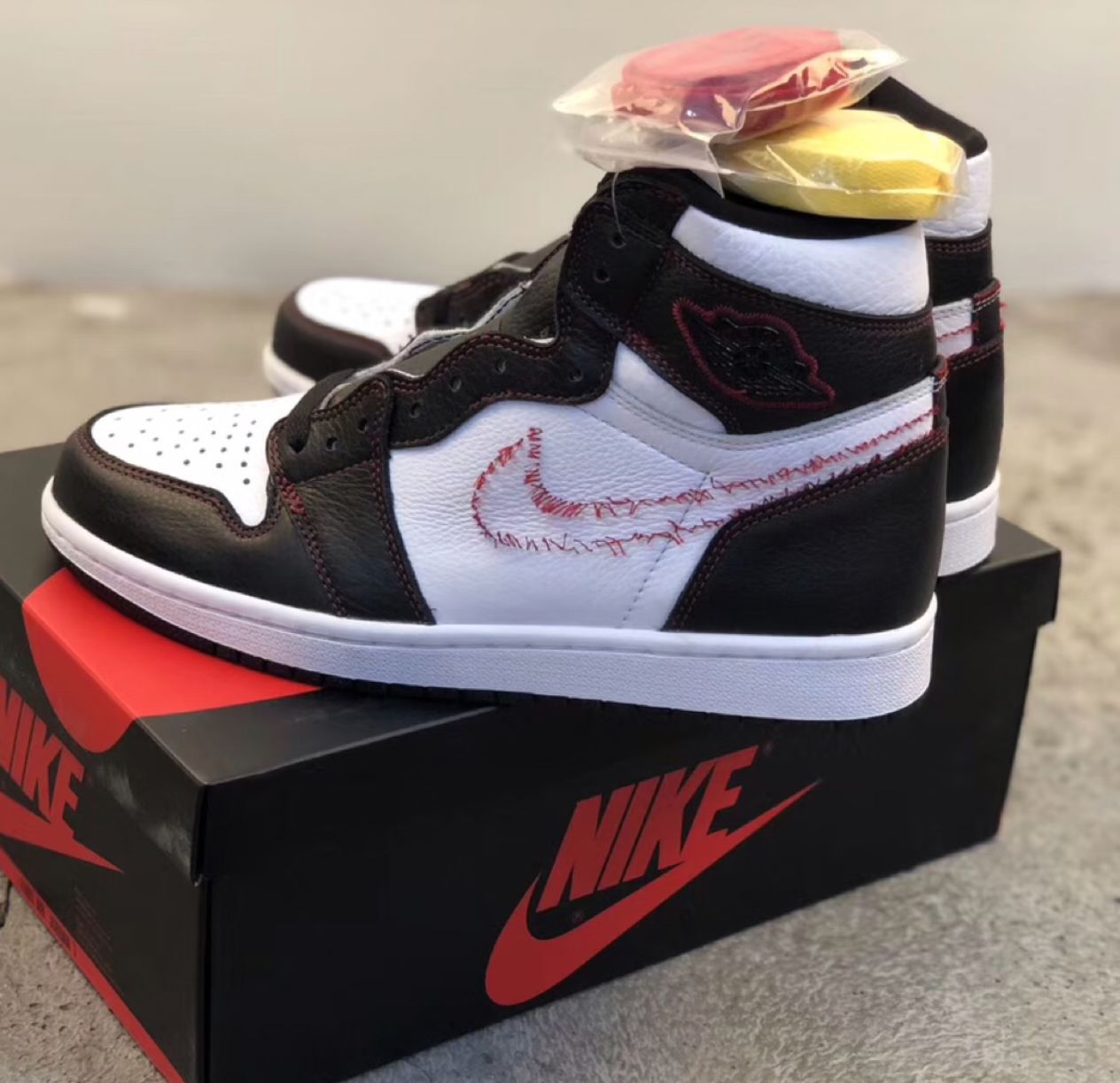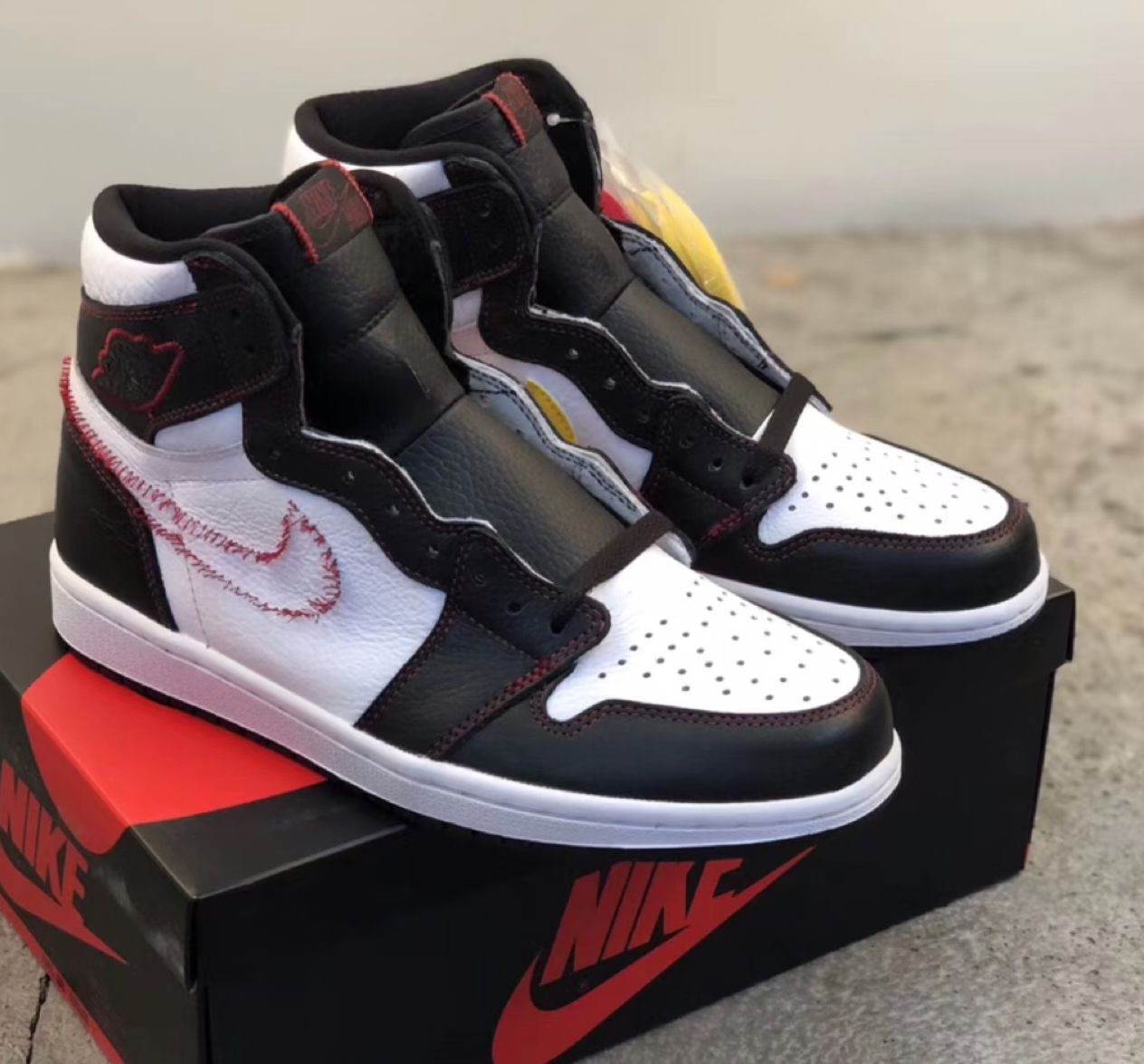 Air Jordan 1 high OG defiant 拆线swoosh 👀设计细节 鞋身 采用黑白撞色; 车线 采用红色勾勒边缘; 仅在左脚内侧有一个黄色swoosh,其余3个swoosh均被“强制拆除”。 确为标准的“另类设计风”…… 乍一看中规中矩的AJ1,设计上的确给我带来一些新鲜感,好在价格比较香,又是OG high版本,果断入手……