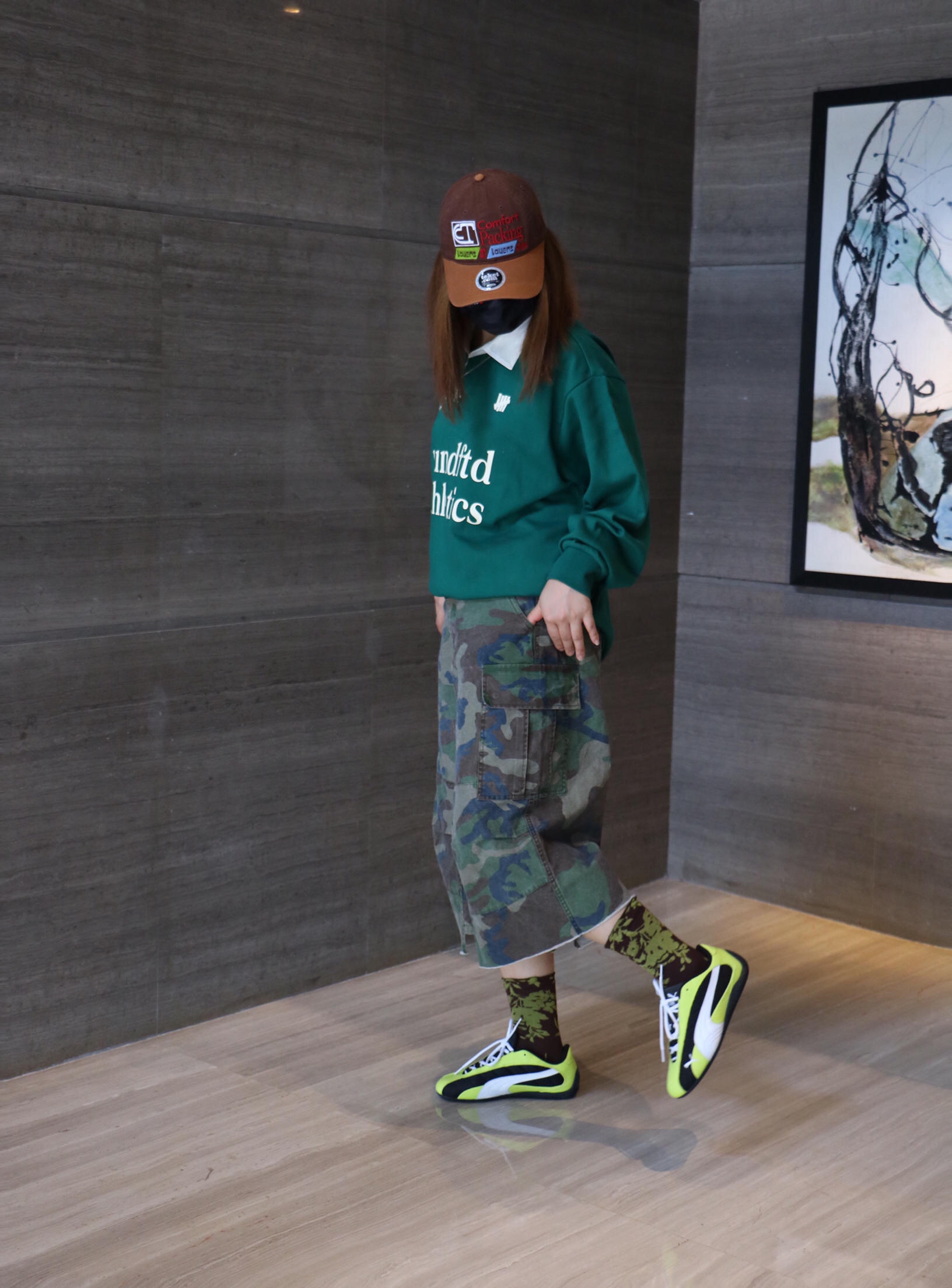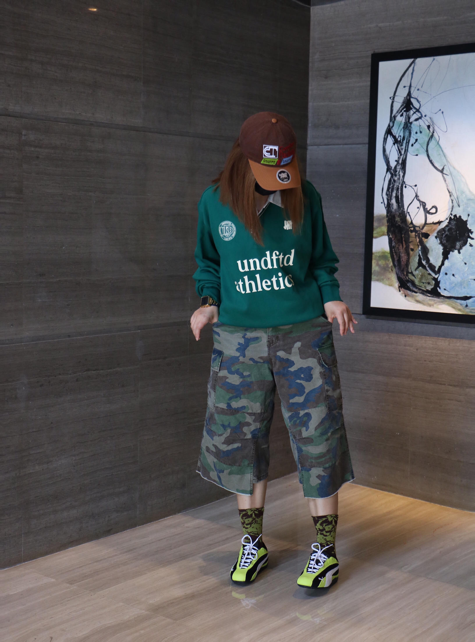 夏日时髦精休闲出游穿搭分享 上衣: undefeated 长袖 印花字母 polo 衫 下装:休闲风迷彩七分裤 鞋子:puna 薄底赛车鞋