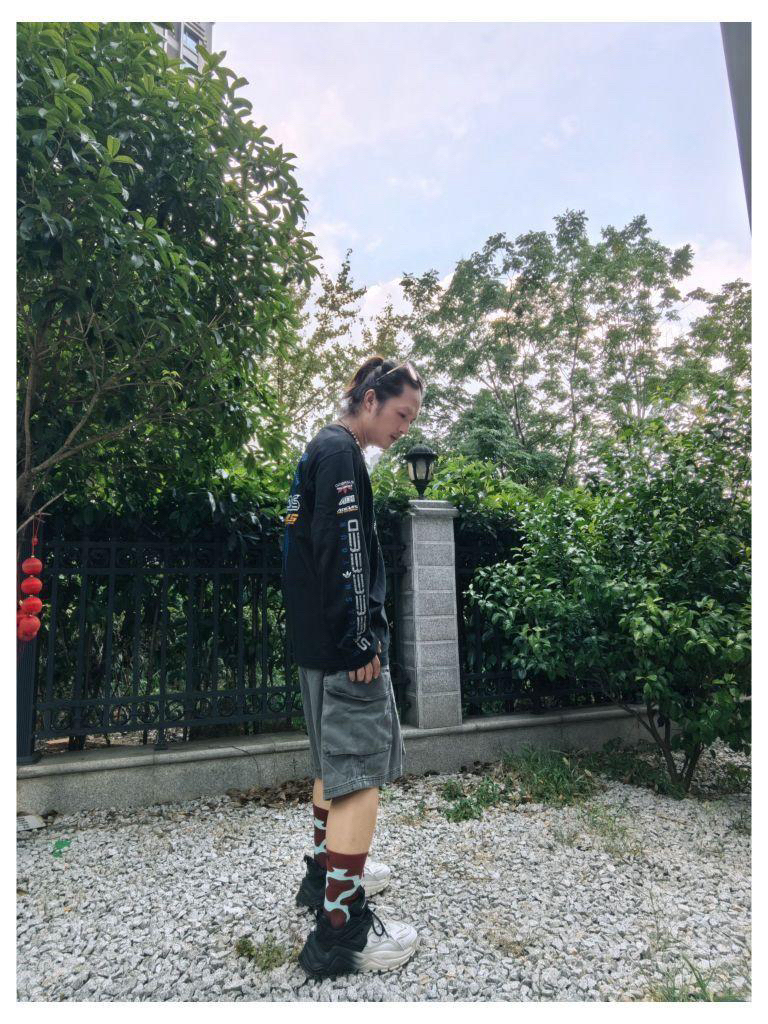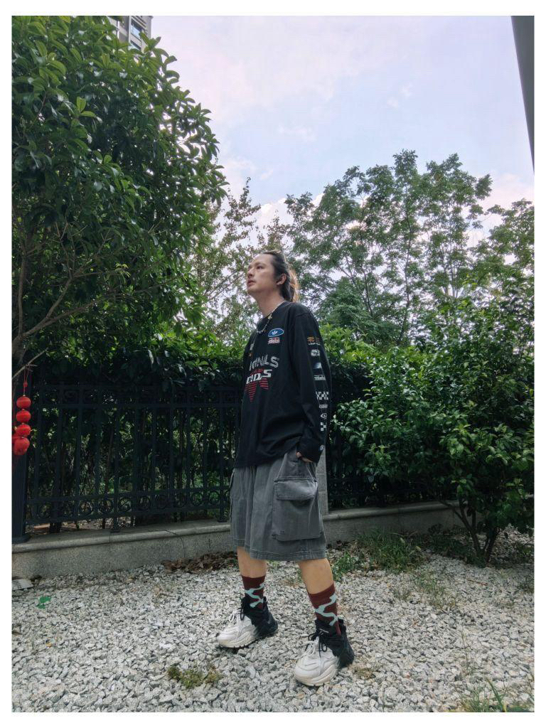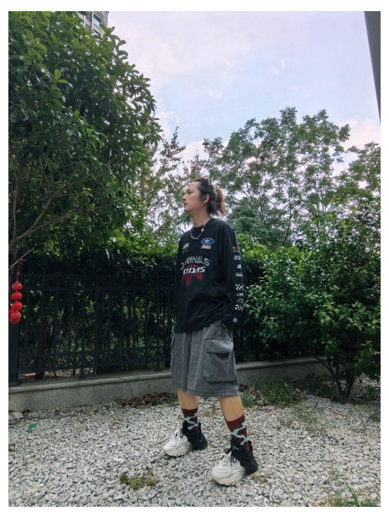 夏日户外同色系休闲穿搭 上衣 :阿迪达斯 赛车风 印花字母 短袖T恤 下装:阿迪达斯 多口袋工装短裤 鞋子: 黛西法罗 拼色老爹鞋