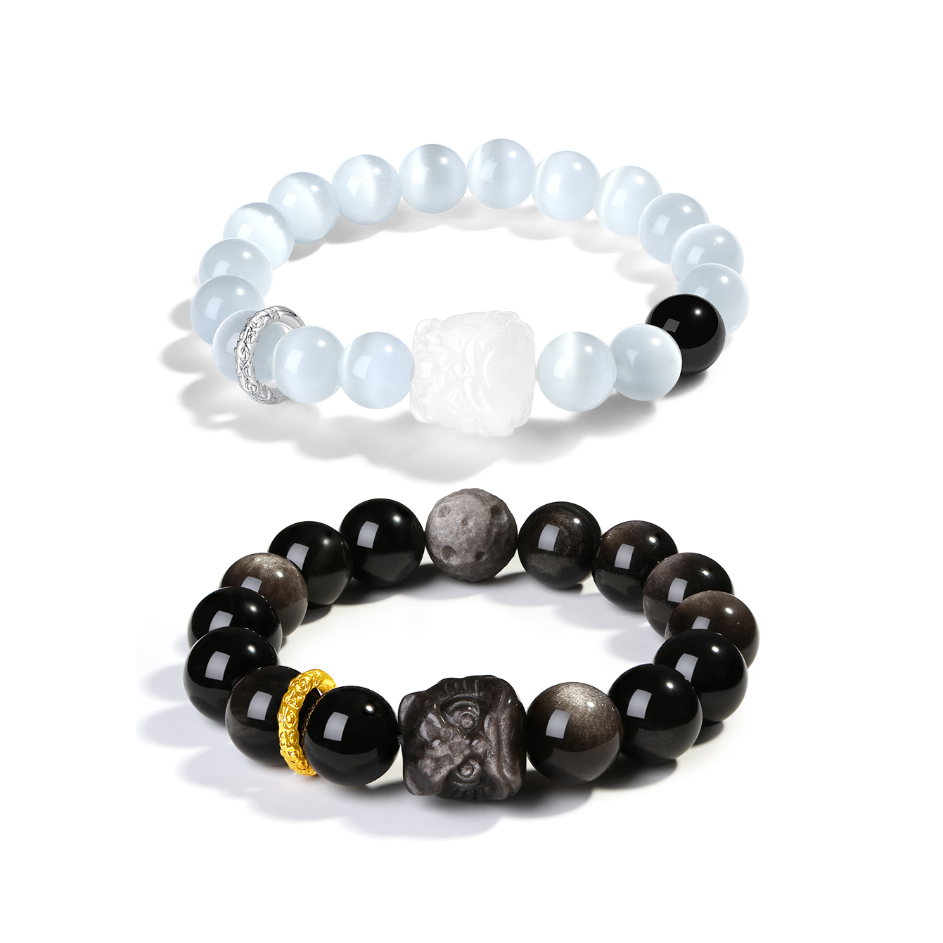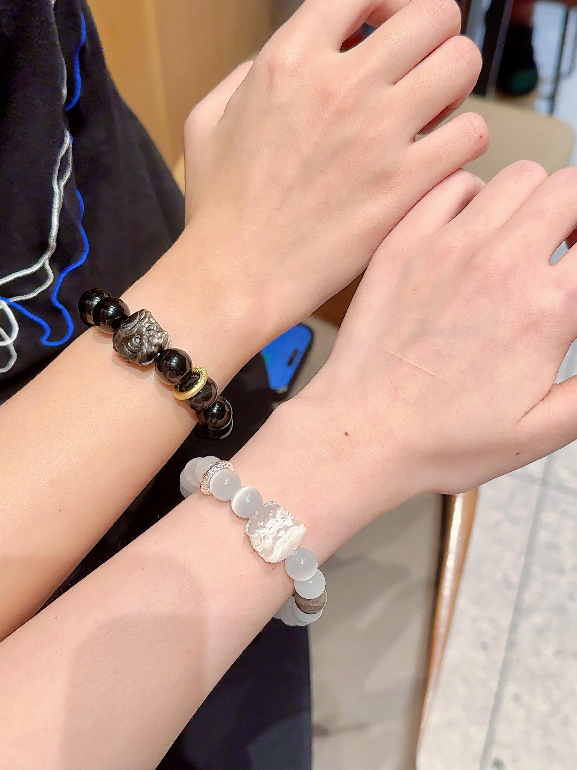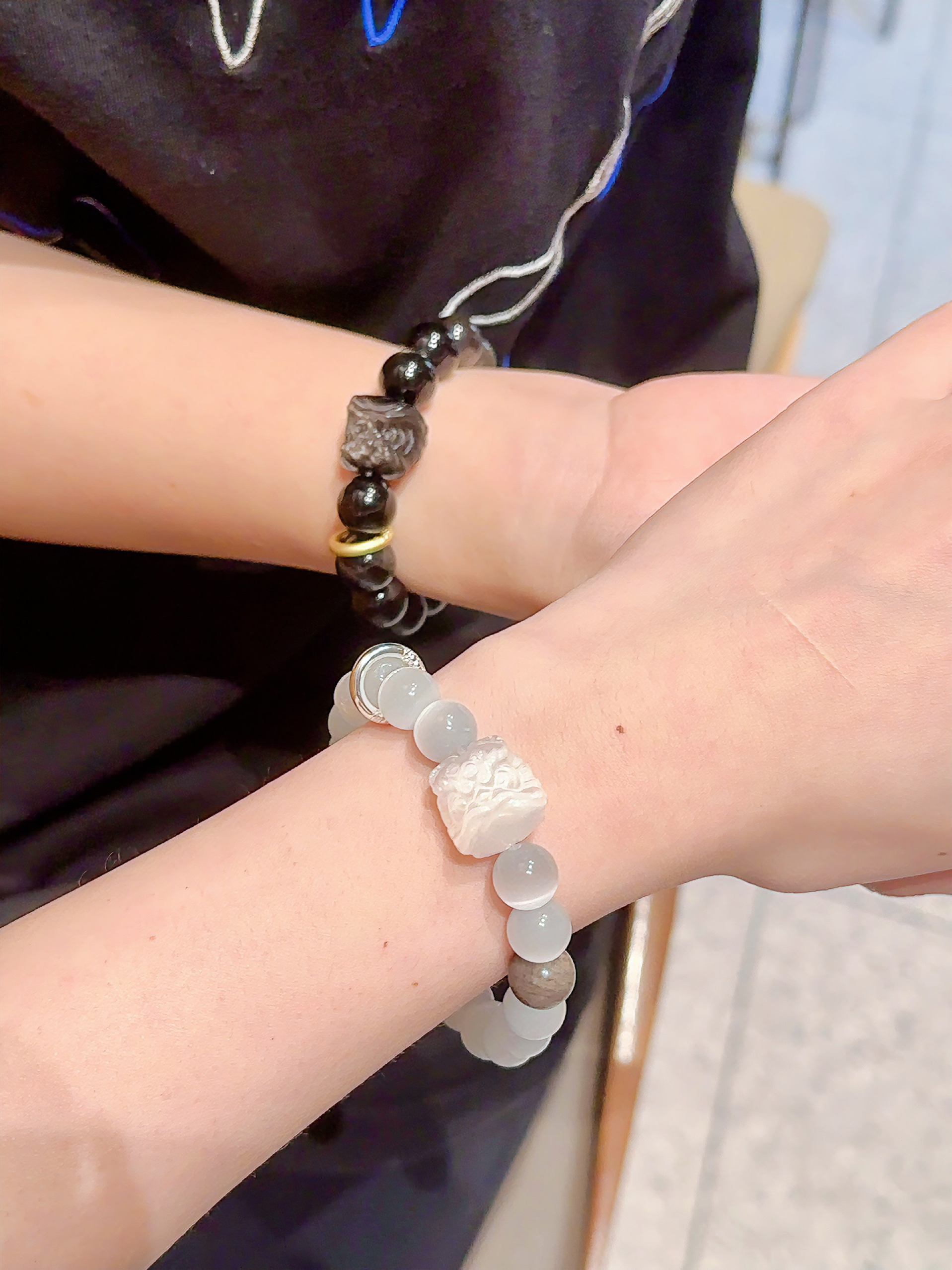 一眼就被这款情侣款祥瑞醒狮手串吸引住了 男款是低调高级的银曜石💫 女款是闪闪发光的猫眼石✨ 搭配霸气的醒狮➕转运环 吸睛又吸金💰 很国潮风 日常百搭的款式 戴在手上显白又大气 随便搭配T恤就不会出错 礼盒包装证书齐全 蛮适合七夕情侣互相送礼🎁