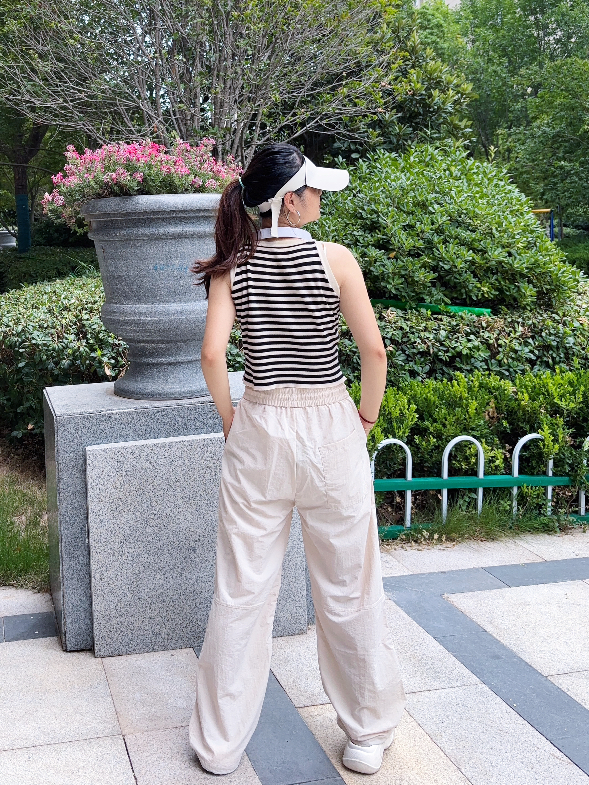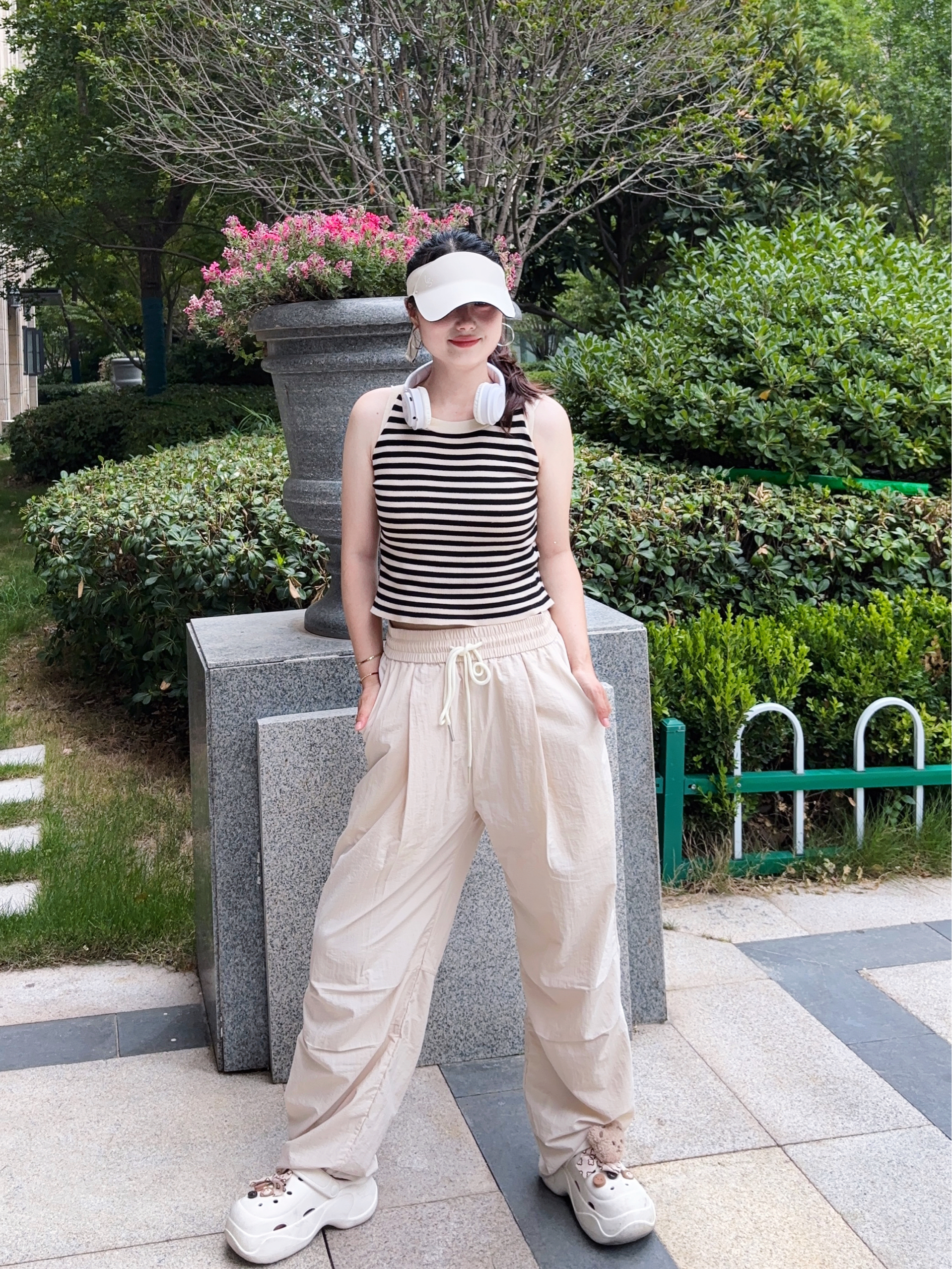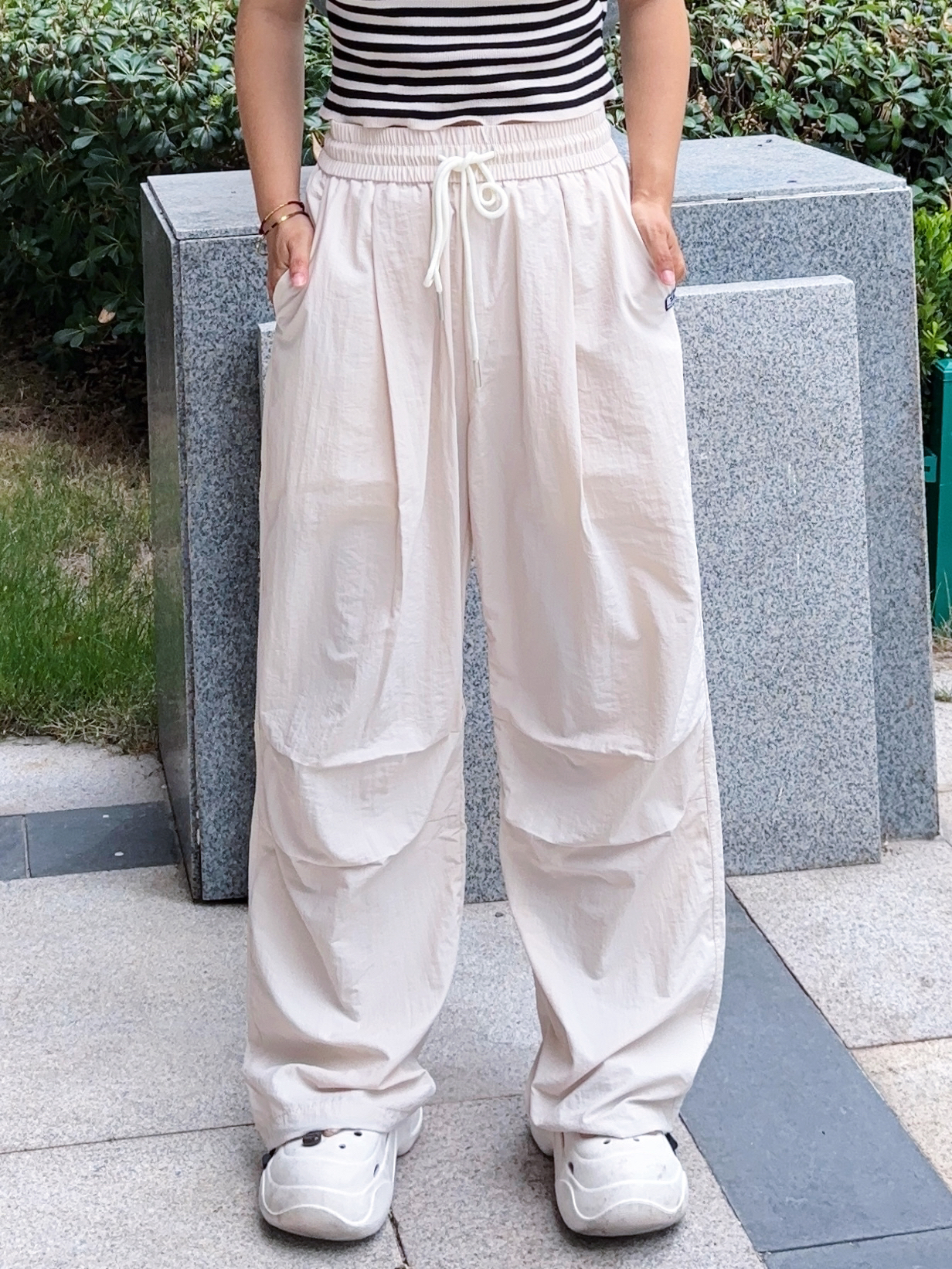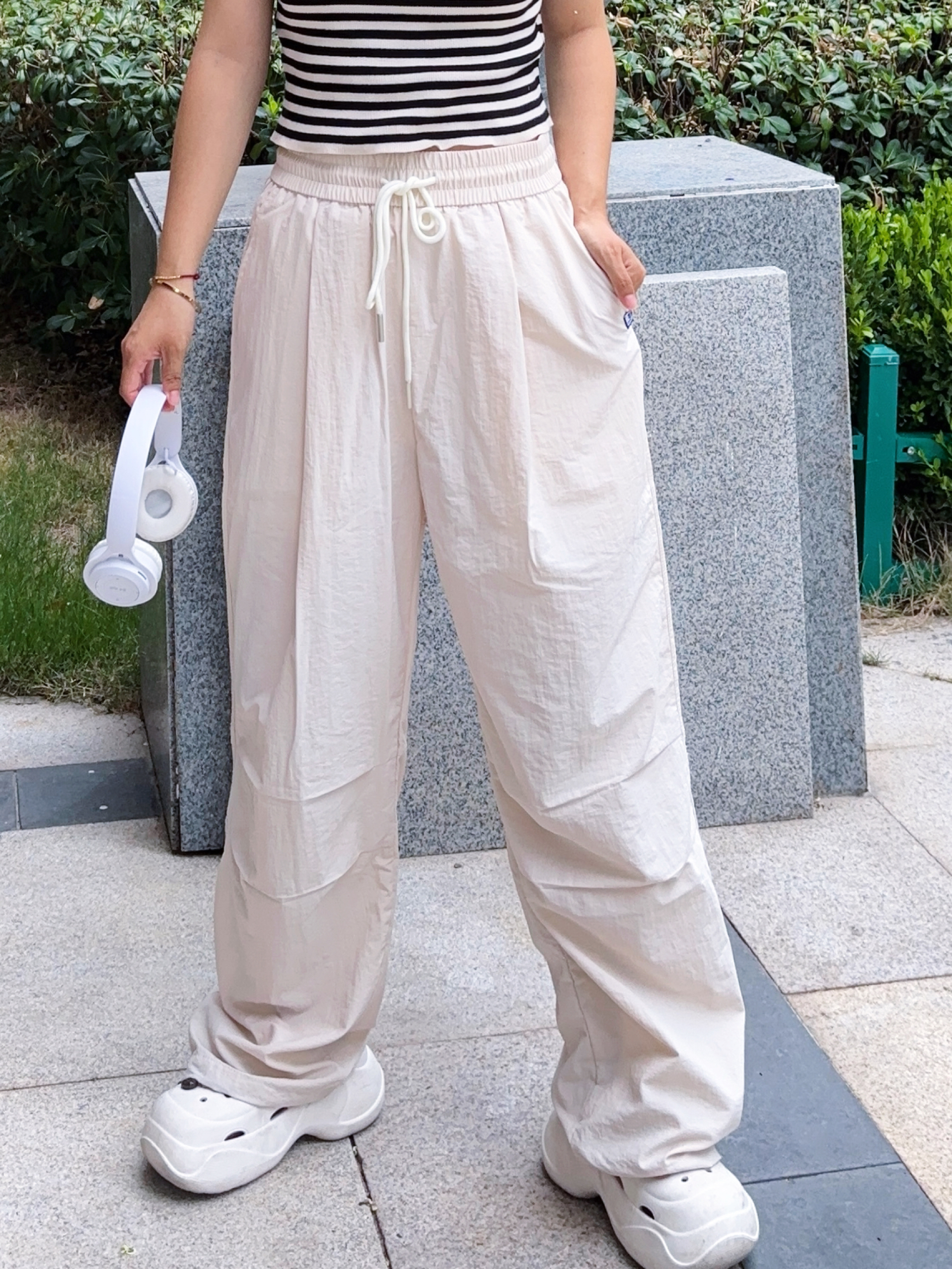 我真的是找到了一条适合夏天的神裤 芝麻街家这款伞兵裤也太好穿了吧 米杏色的颜色也很好看百搭啊 上身穿很轻薄透气,不沾身 真的是一点也不闷热,很舒适感啊 我是160/95 S码长度刚刚好 属于宽松版型的裤子,穿搭上也很省心 日常简单的短袖都很好看耶 侧边有一点堆堆褶皱设计很松弛感拉满啊 性价比高,真的很推荐呀~
