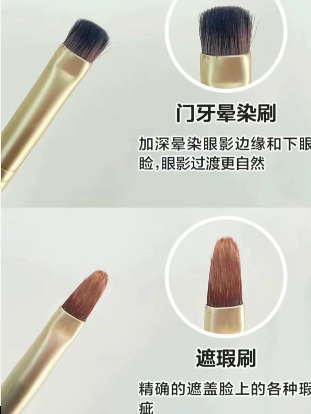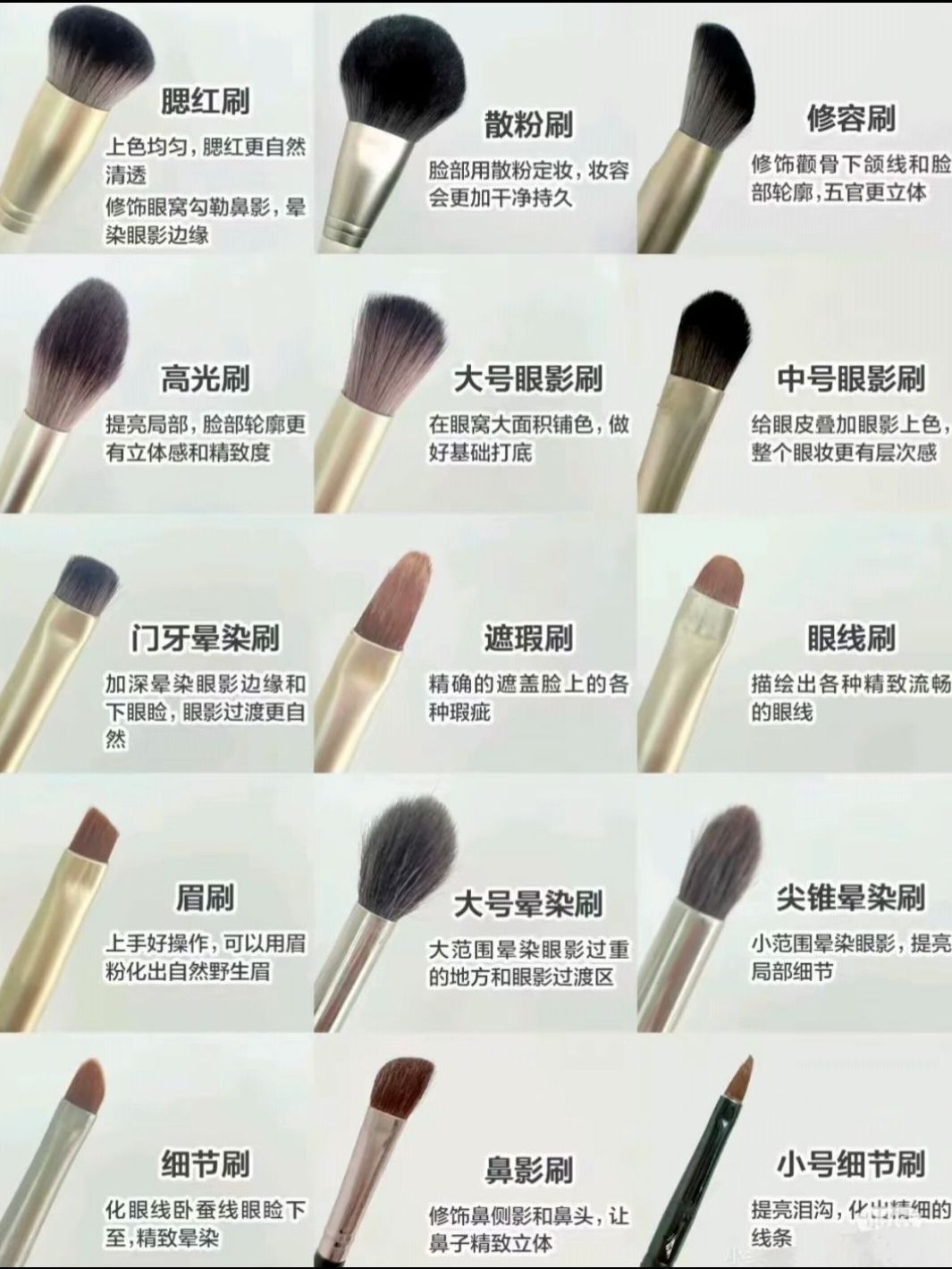 新手入门化妆刷使用教程❗️❗️ 新手入门化妆刷使用教程‼️学生小白必看!! 超全的化妆刷使用方法,赶快收藏起来吧 修容刷!! 蘸取修容粉轻扫颧骨,修饰下颌线和脸部外轮廓 高光刷!! 蘸取少量高光扫在鼻部颧骨等需要提亮的地方 门牙晕染刷!! 蘸取深色加深眼尾和下眼睑,晕染眼影不自然的地方 遮瑕刷!! 将遮瑕膏晕染在需要遮盖瑕疵的地方,比如黑眼圈、泪沟、痘痘等 腮红刷!! 蘸取适量腮红,轻轻扫在苹果肌...