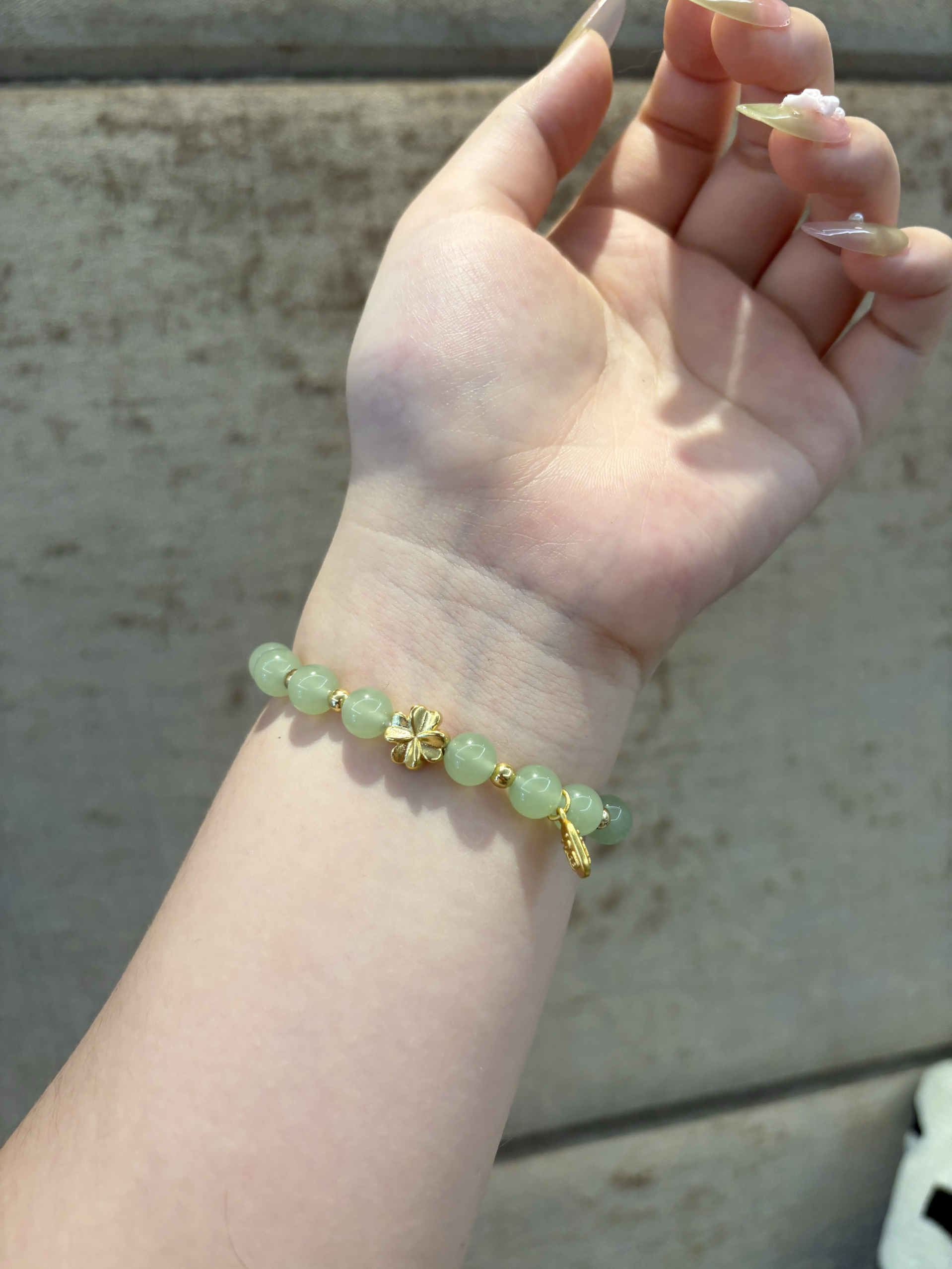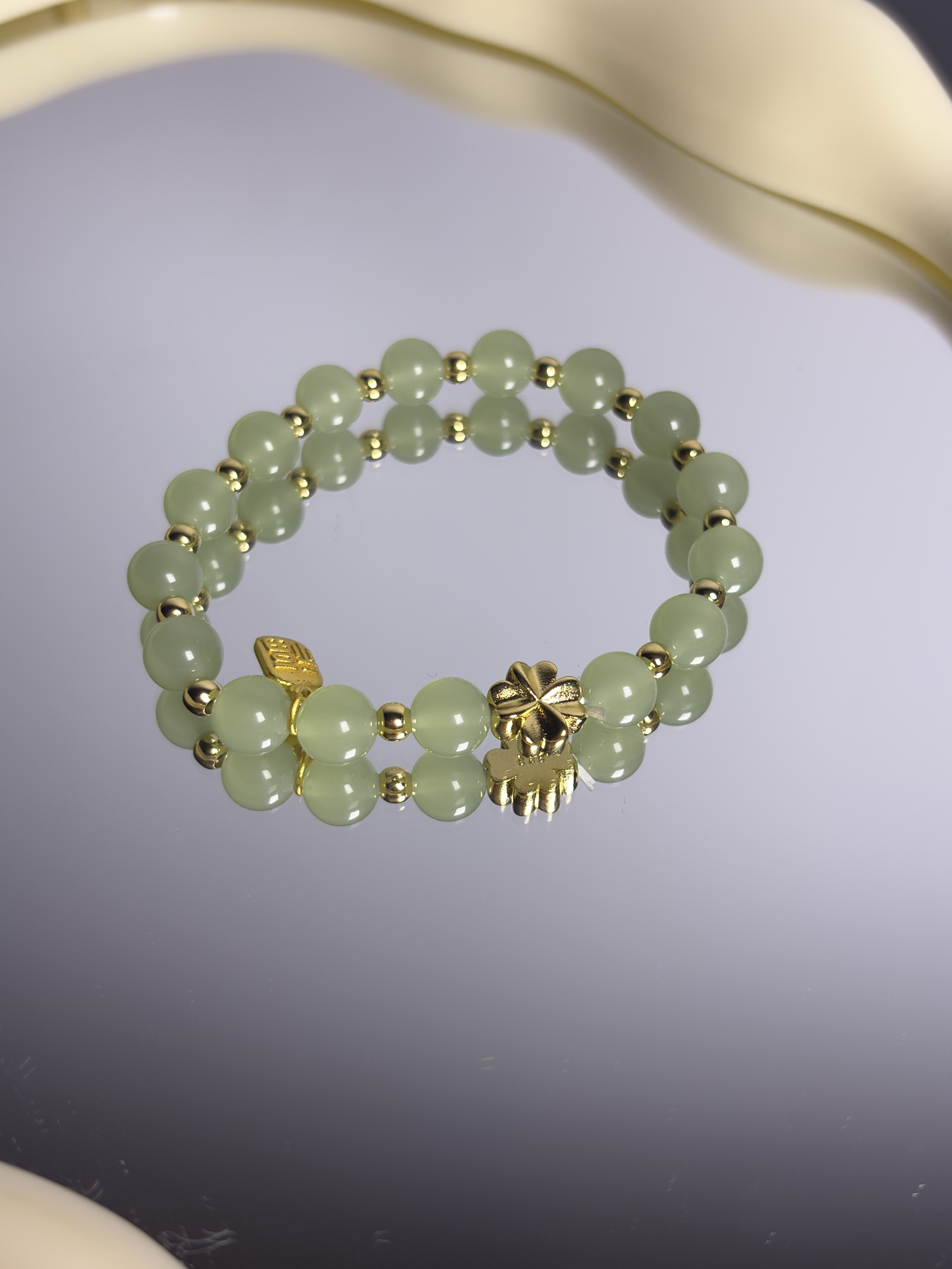 是很清透的绿 冰透质感瞬间降温10℃视觉 四叶草福牌暗藏玄机 内侧是立体雕花!戴上去真的很美啊!显得手白白嫩嫩的.