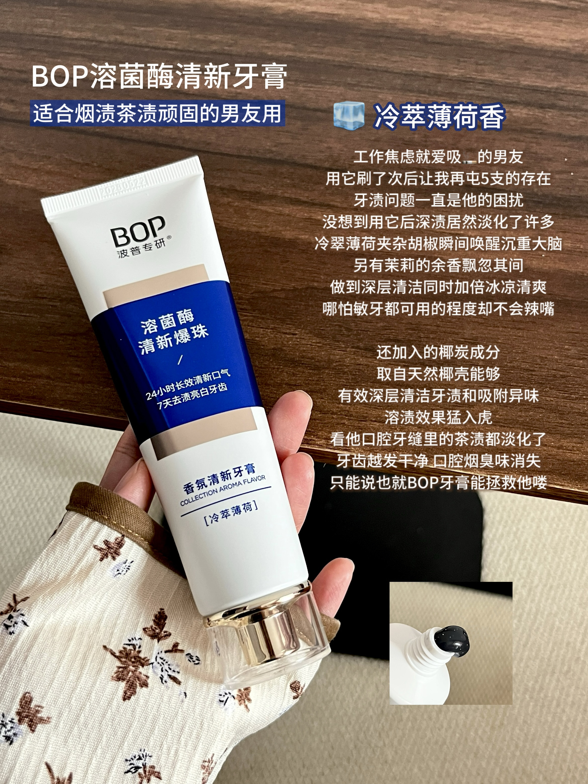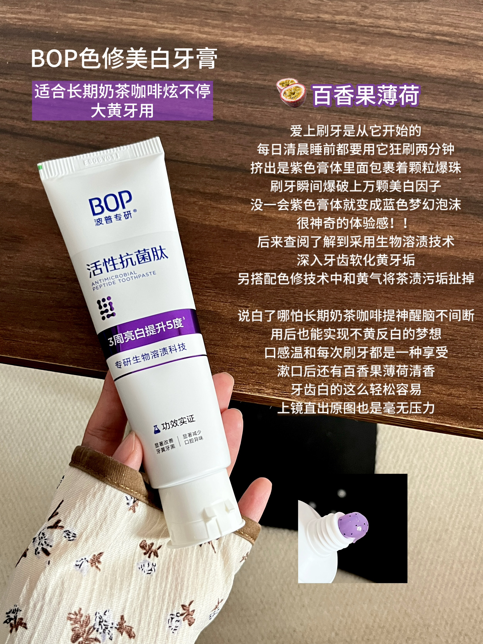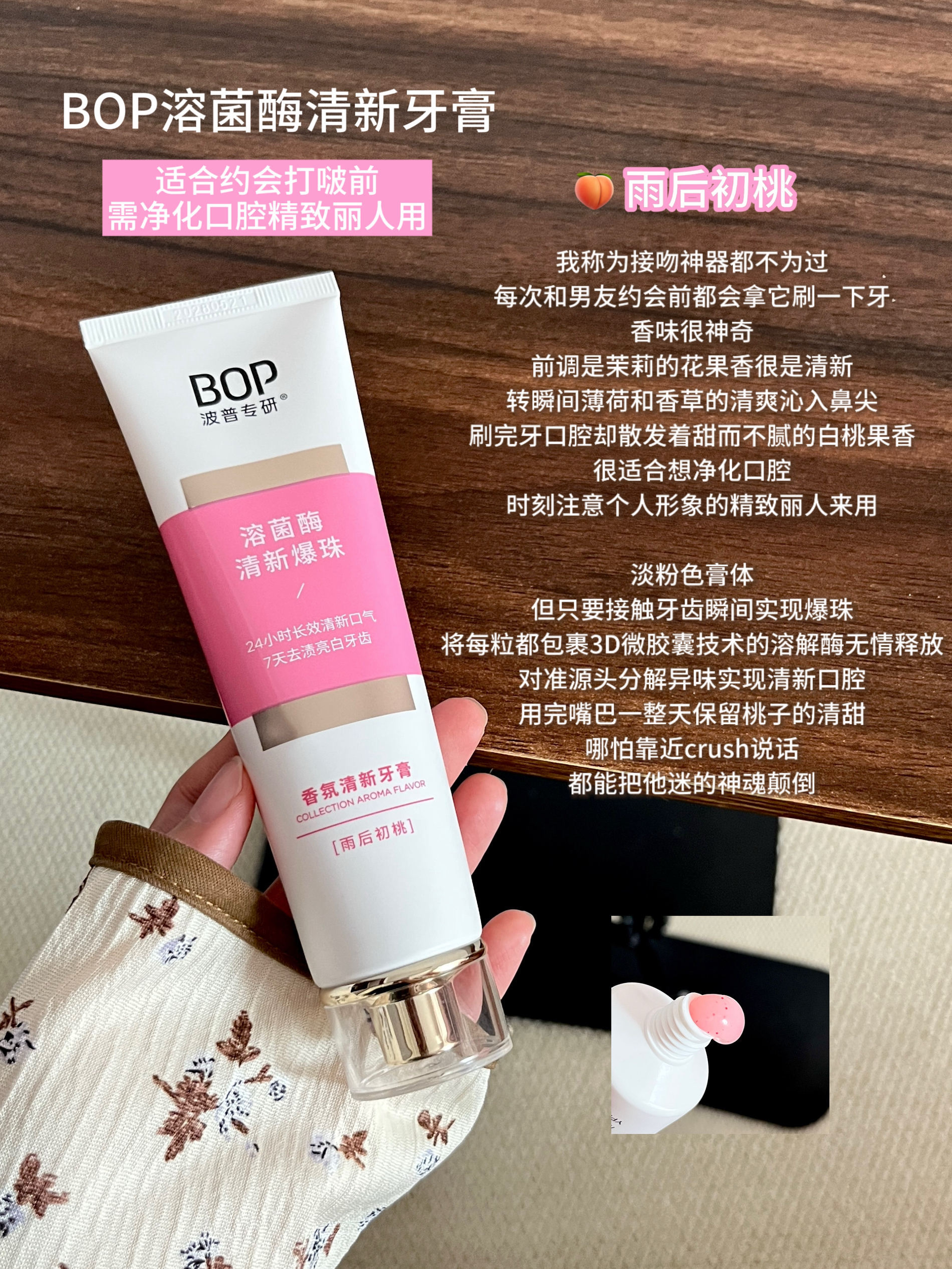 请问BOP的研发人员是去进修过吗 清新口气,修黄美白牙齿这块厉害的真让我失语。。。 当初图便宜凑单买了色修美白牙膏 用了还不到半管肉眼可见牙齿就净白不少 关键不是即刻亮白效果是那种稳的净稳的白 哪怕本拿铁大户不改变饮食 刷牙依旧搭配破烂牙刷清洁 也是让我这口大黄牙实现露齿自由唇齿留香 因为泰好用顺手一口气把剩下几个热门款也入了 在这和大家简单分享下我的使用感受 - BOP溶菌酶清新牙膏(雨后初桃)...