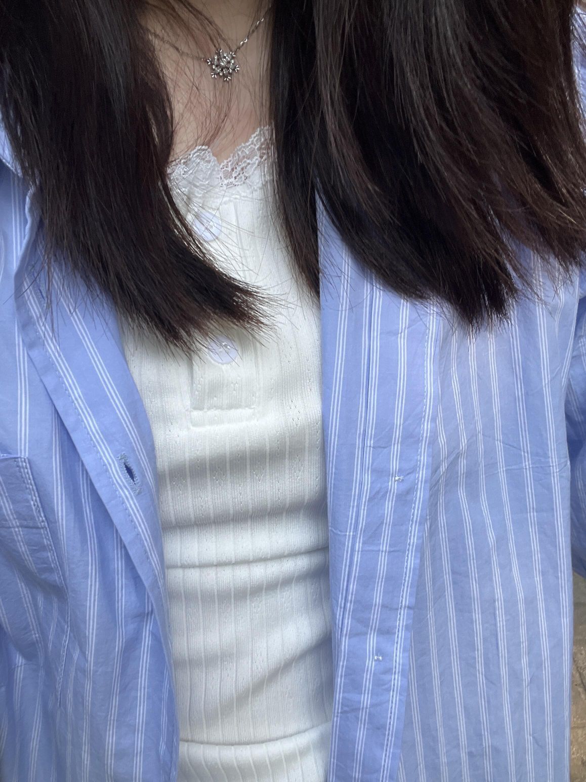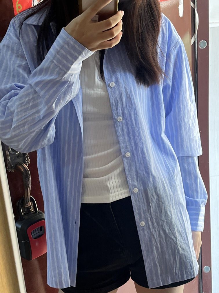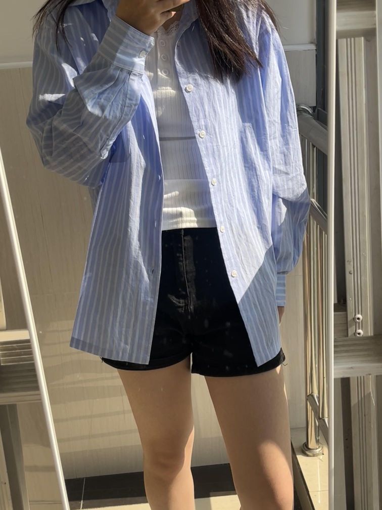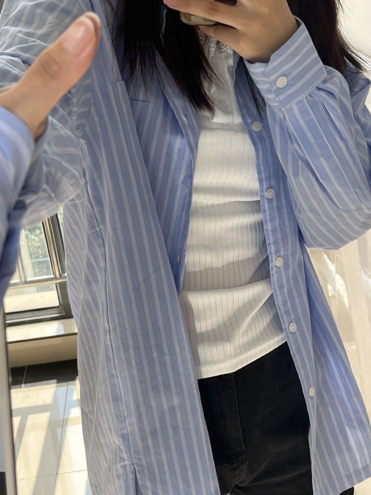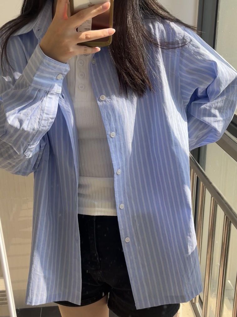 其实费力的美感也没有任何问题啊,重要的是你是否从中获得了真正的愉悦^_^ and本条纹控宣布!终于找到了自己的梦中情衣 面料是纯棉的穿着真的很舒服,版型也是完美,特地买大一码,搭配短裤穿出来就是oversize的感觉 关键是这个蓝色真的很特别有一种海边度假的感觉🌊 随便搭个什么出门就是很韩很韩