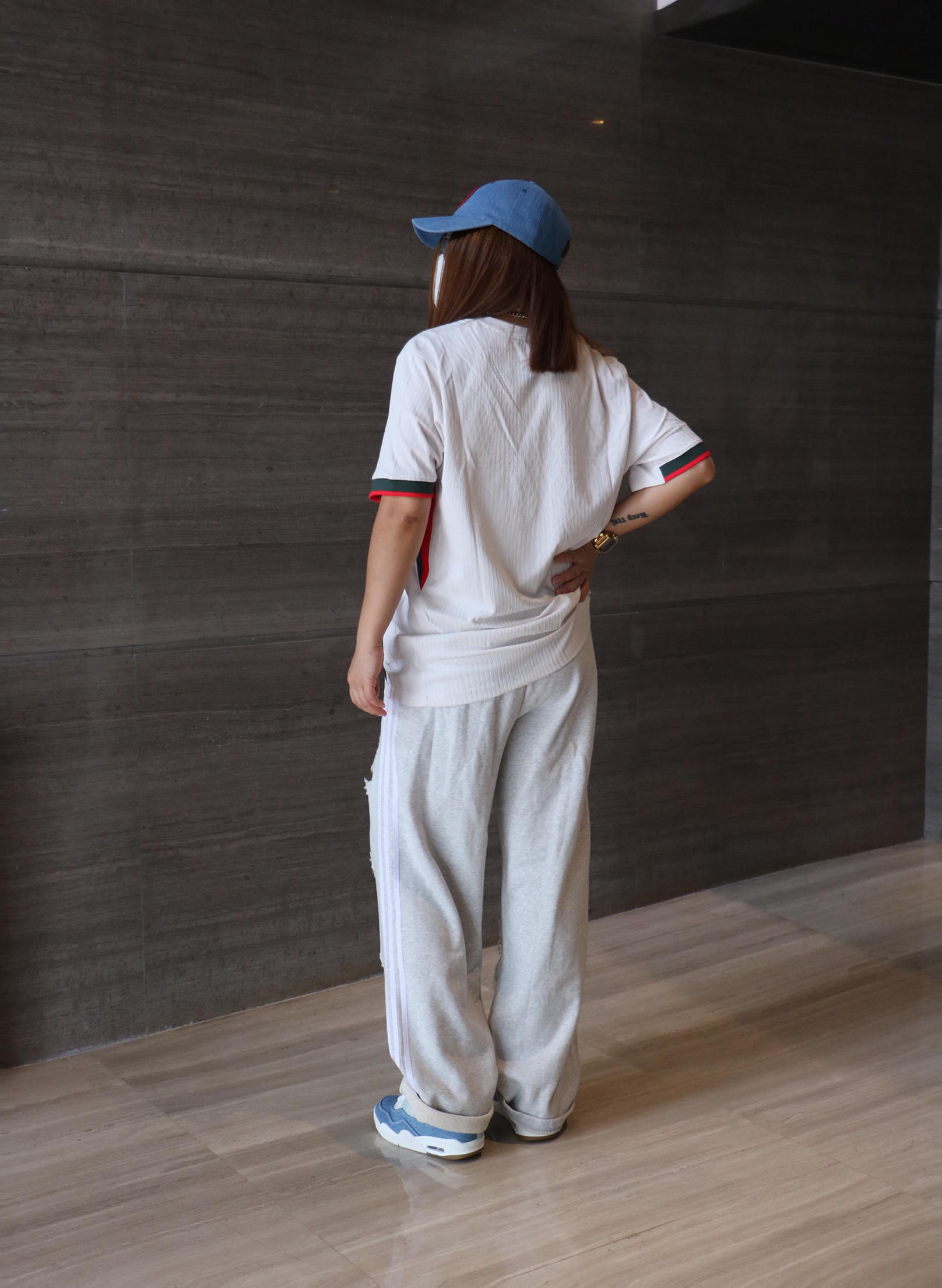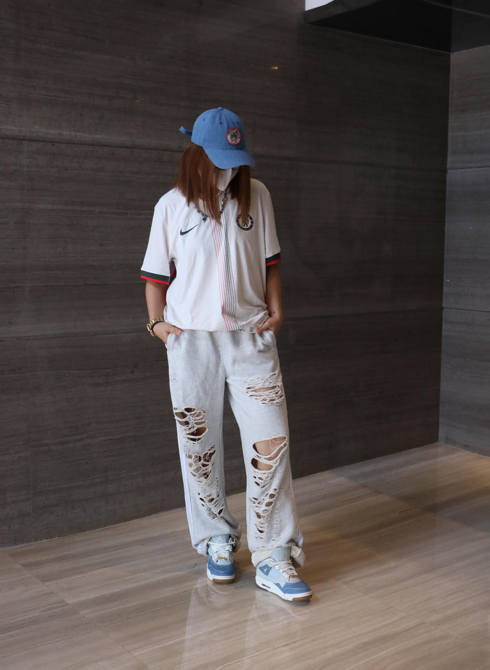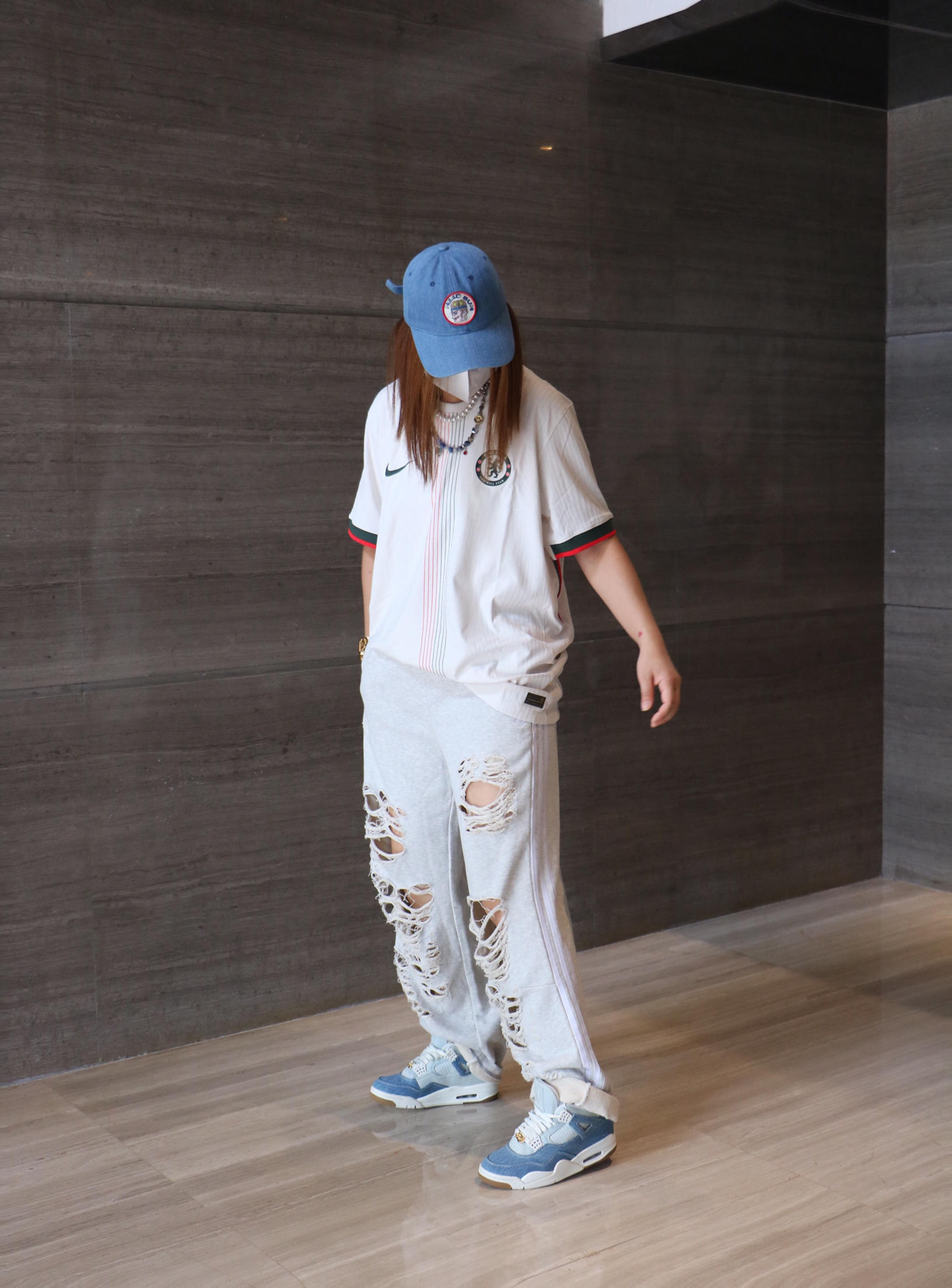 夏日时髦精休闲出游穿搭分享 上衣: nike 细条纹 足球风 字母logo 短袖T恤 下装:阿迪达斯 街头风破洞休闲裤 鞋子:air jordan 4 洗水牛仔