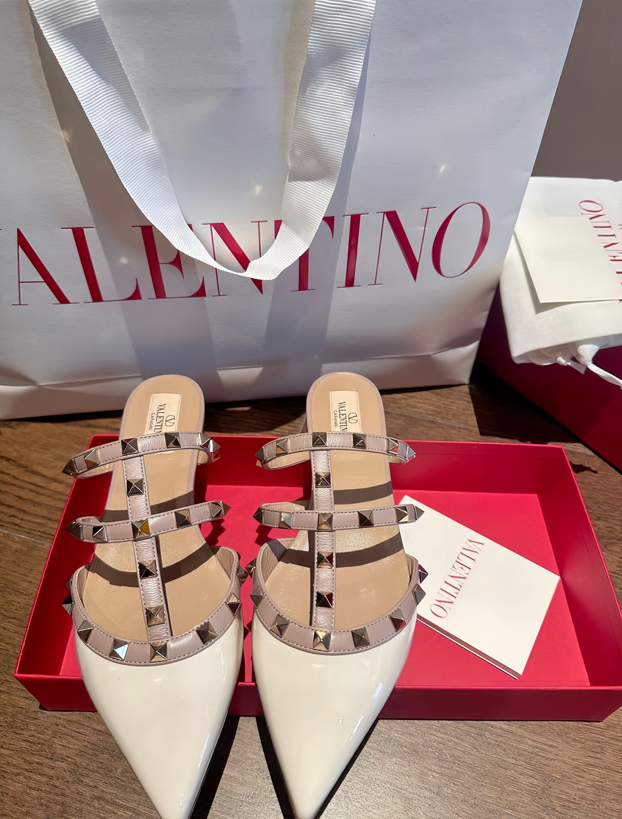 本篇笔记关联了Valentino Rockstud 休闲时尚 露跟 铆钉装饰 踝带 尖头 一字带 细跟 高跟鞋 象牙白/浅粉、Valentino 舒适百搭 时尚休闲 漆皮铆钉 尖头 平底 穆勒鞋 VW2S0H15 VNW 白色等商品,为用户提供真实的使用体验和购买参考。