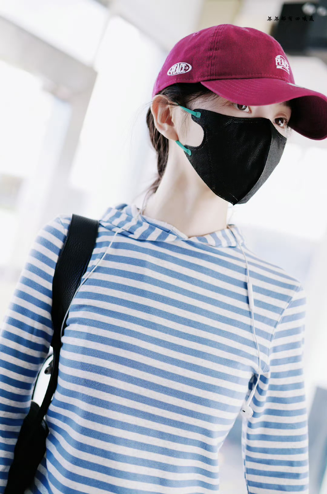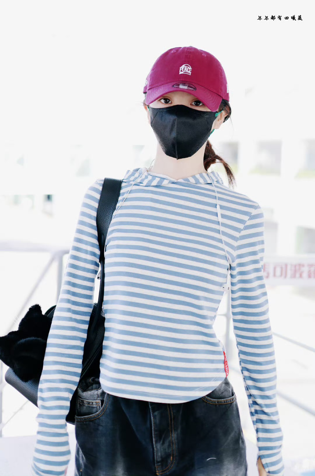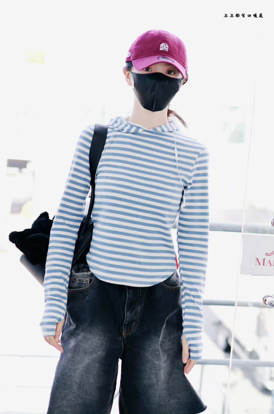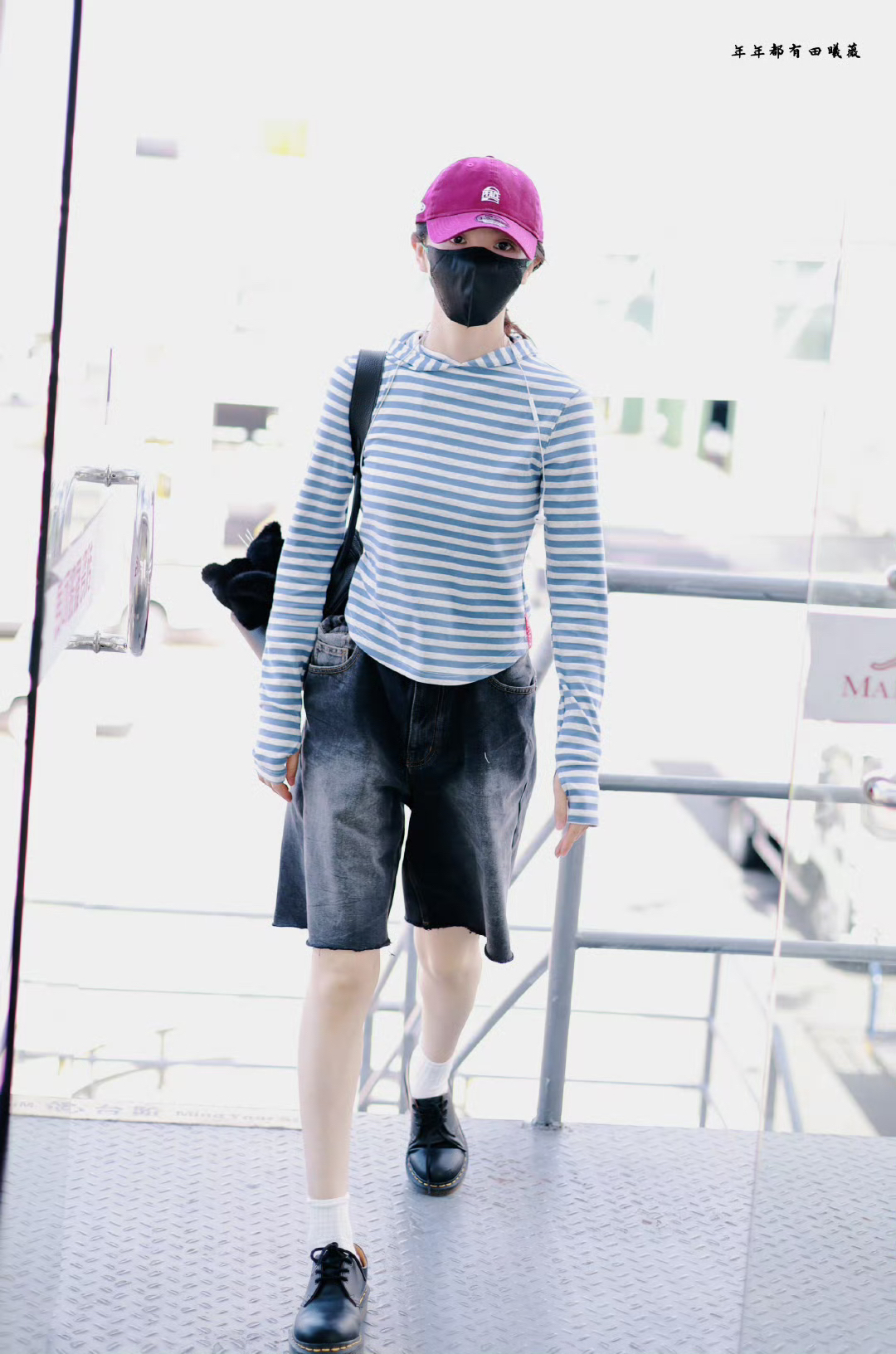 田曦薇分享了8月10日机场私服,条纹T恤韩系氛围感满满,下搭牛仔短裤,时髦又舒适,今天是小男孩小田! CR:@网络 上衣:sudakooo 裤子: WE11DONE 鞋子: Dr.Martens 帽子: New Era