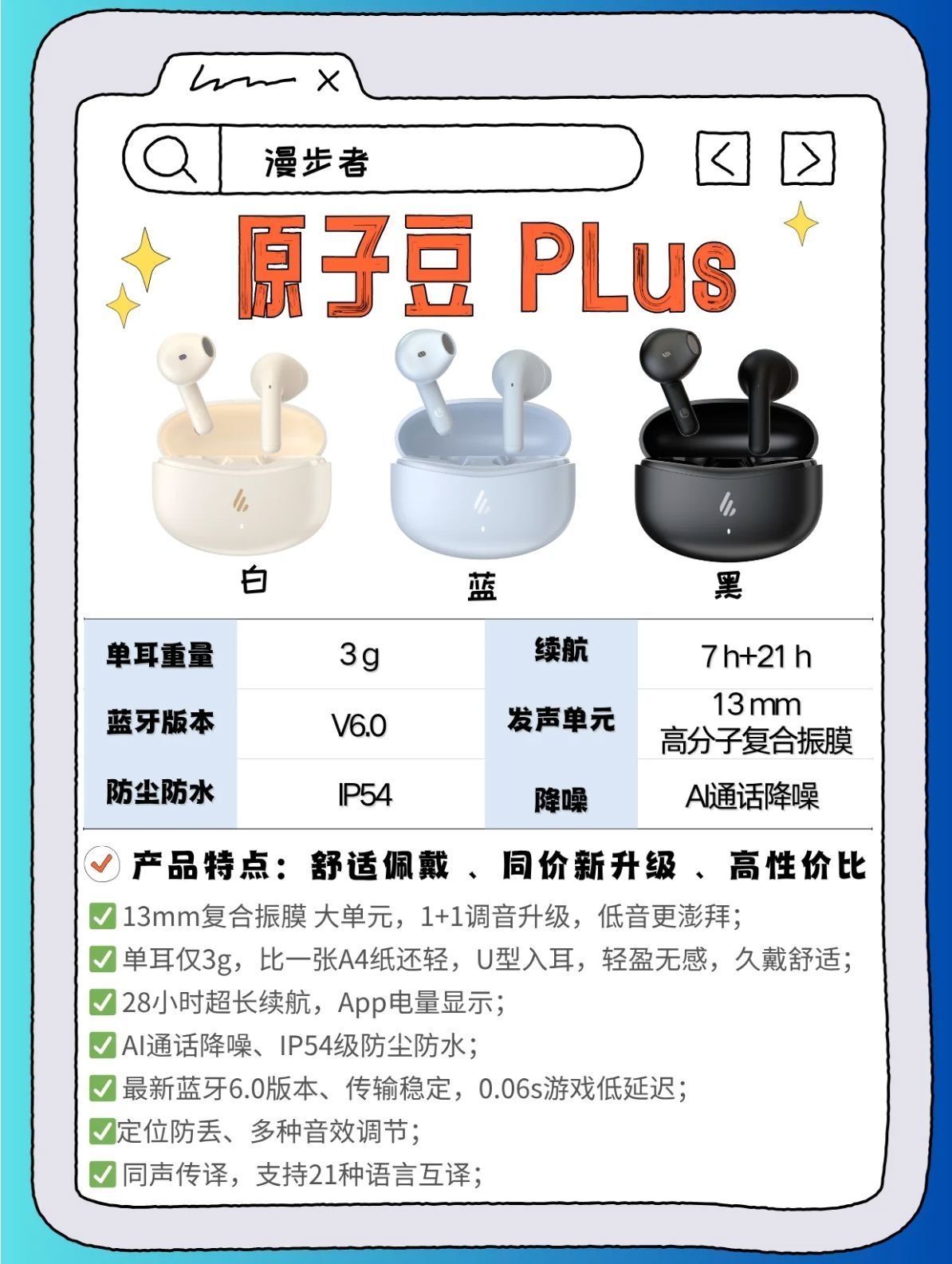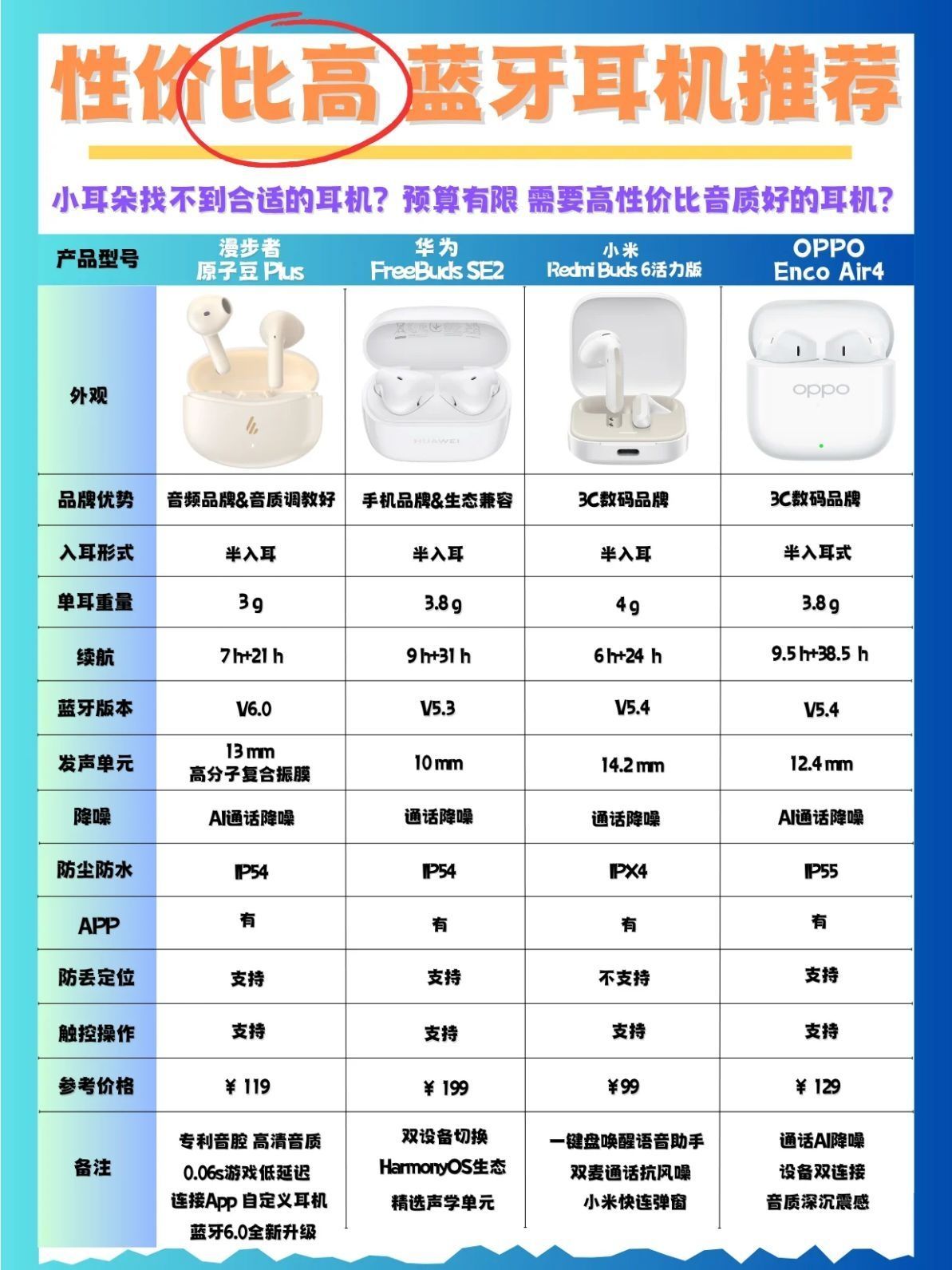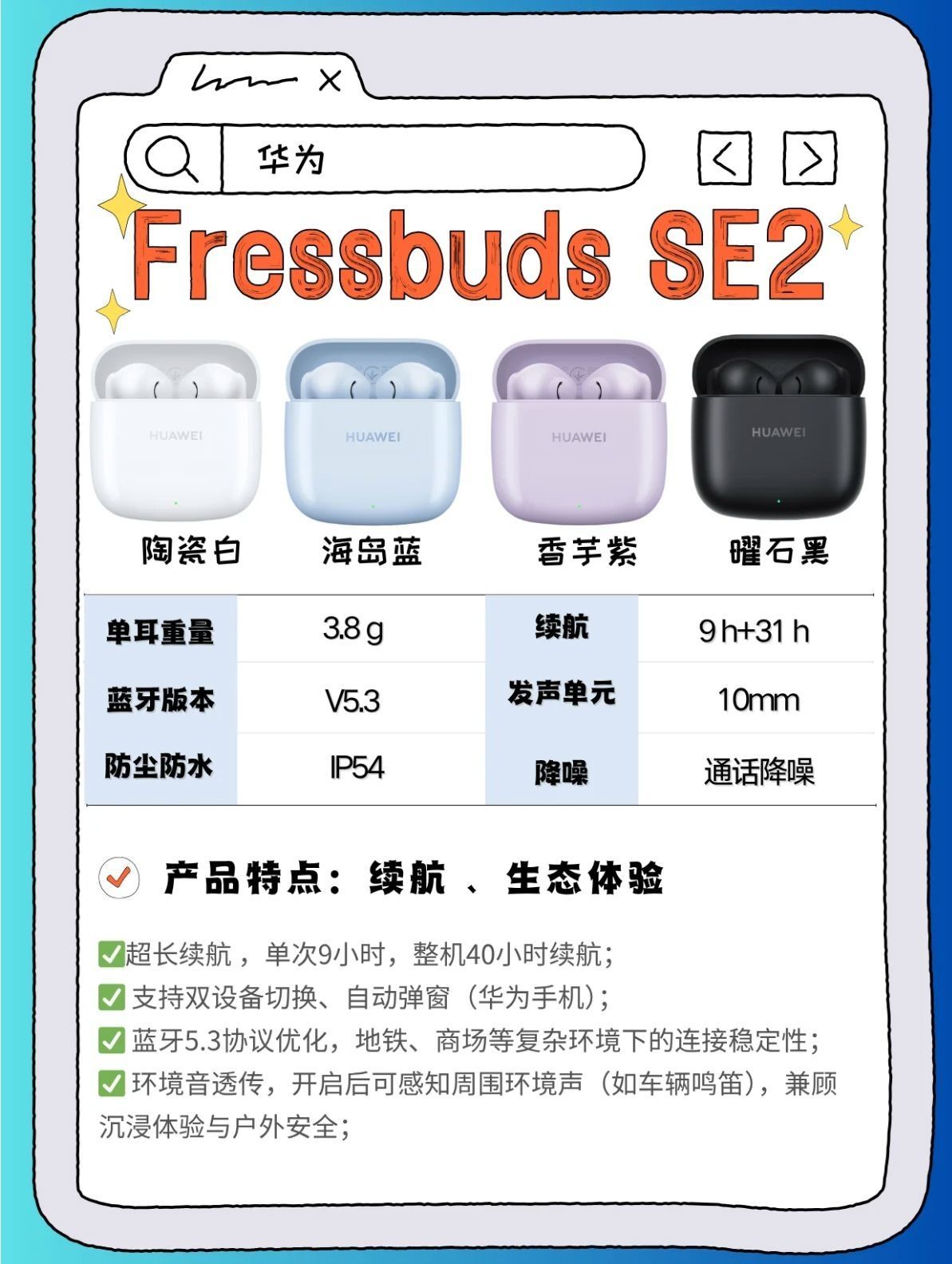 本篇笔记关联了HUAWEI/华为 FreeBuds SE 2 半入耳式 蓝牙耳机 小巧 快速充电 低延迟 运动 真无线 超长续航 降噪 快充 高音质 低延时 影音娱乐 海岛蓝、Edifier/漫步者 AtomBuds Plus 半入耳式 蓝牙 耳机 真无线 通话 防水 原子豆 降噪 无感延迟 冰蓝、HUAWEI/华为 FreeBuds SE 2 半入耳式 蓝牙耳机 小巧 快速充电 低延迟 运动 真无线 超长续航 降噪 快充 高音质 低延时 影音娱乐 陶瓷白等商品,为用户提供真实的使用体验和购买参考。