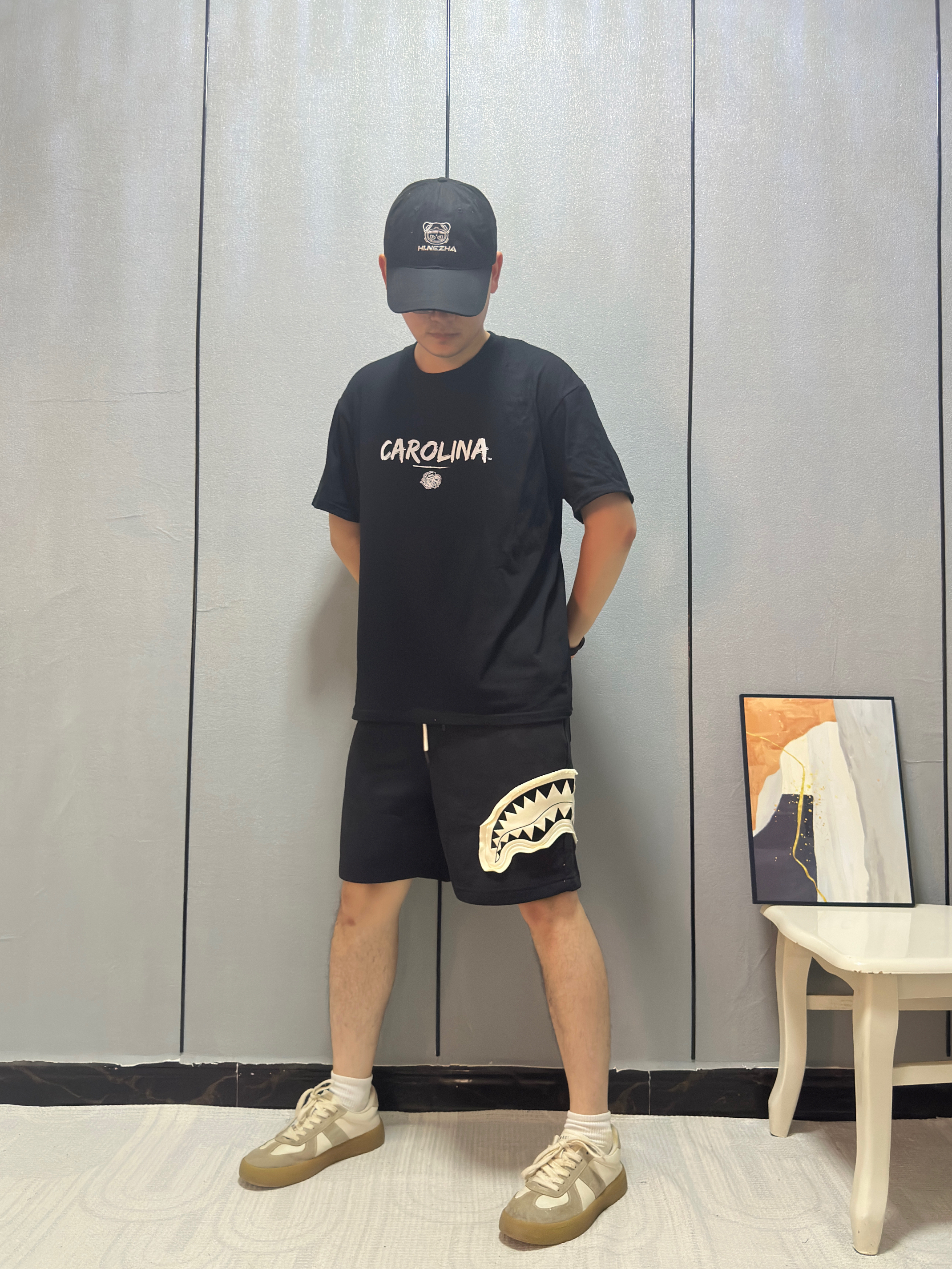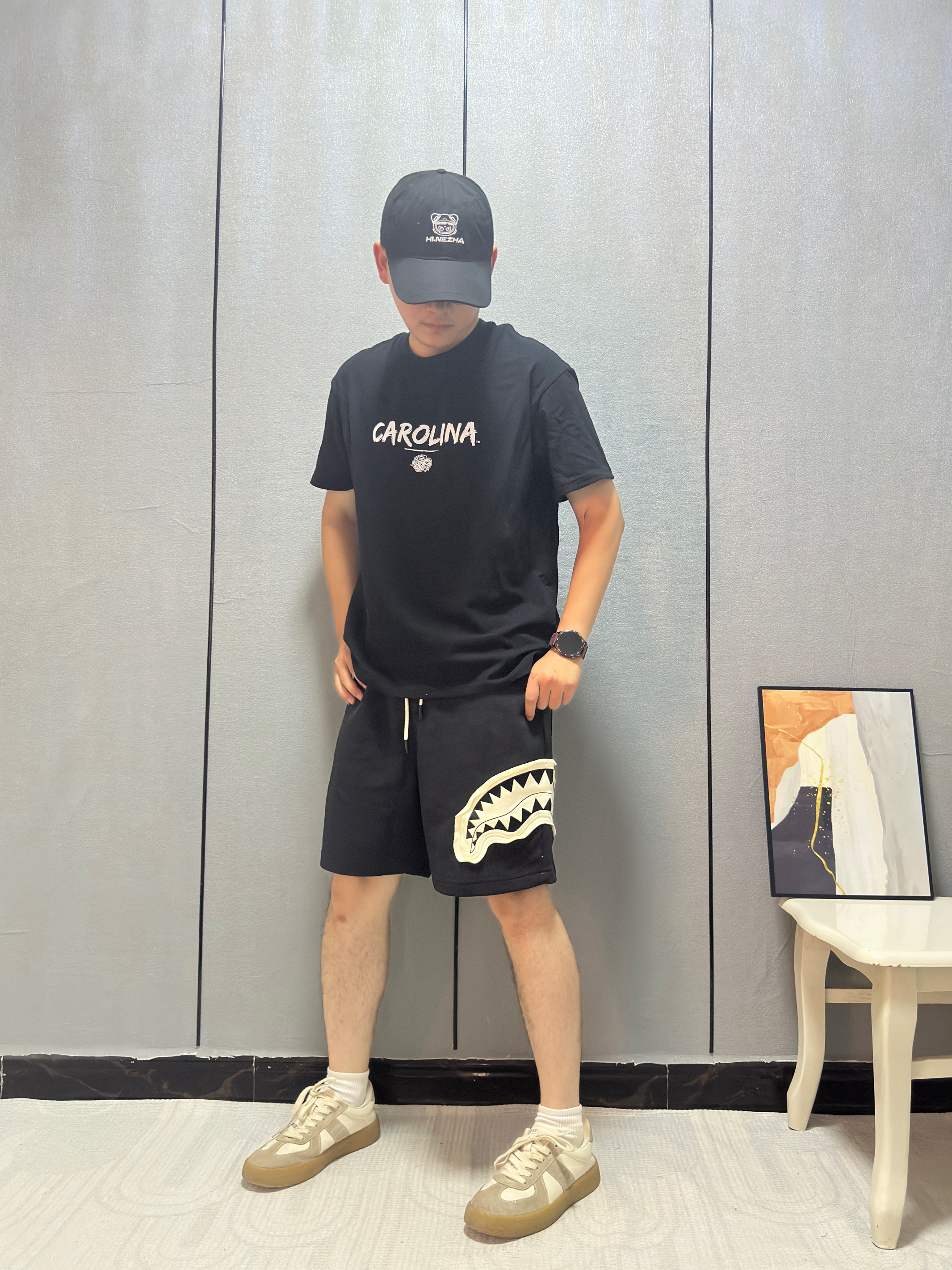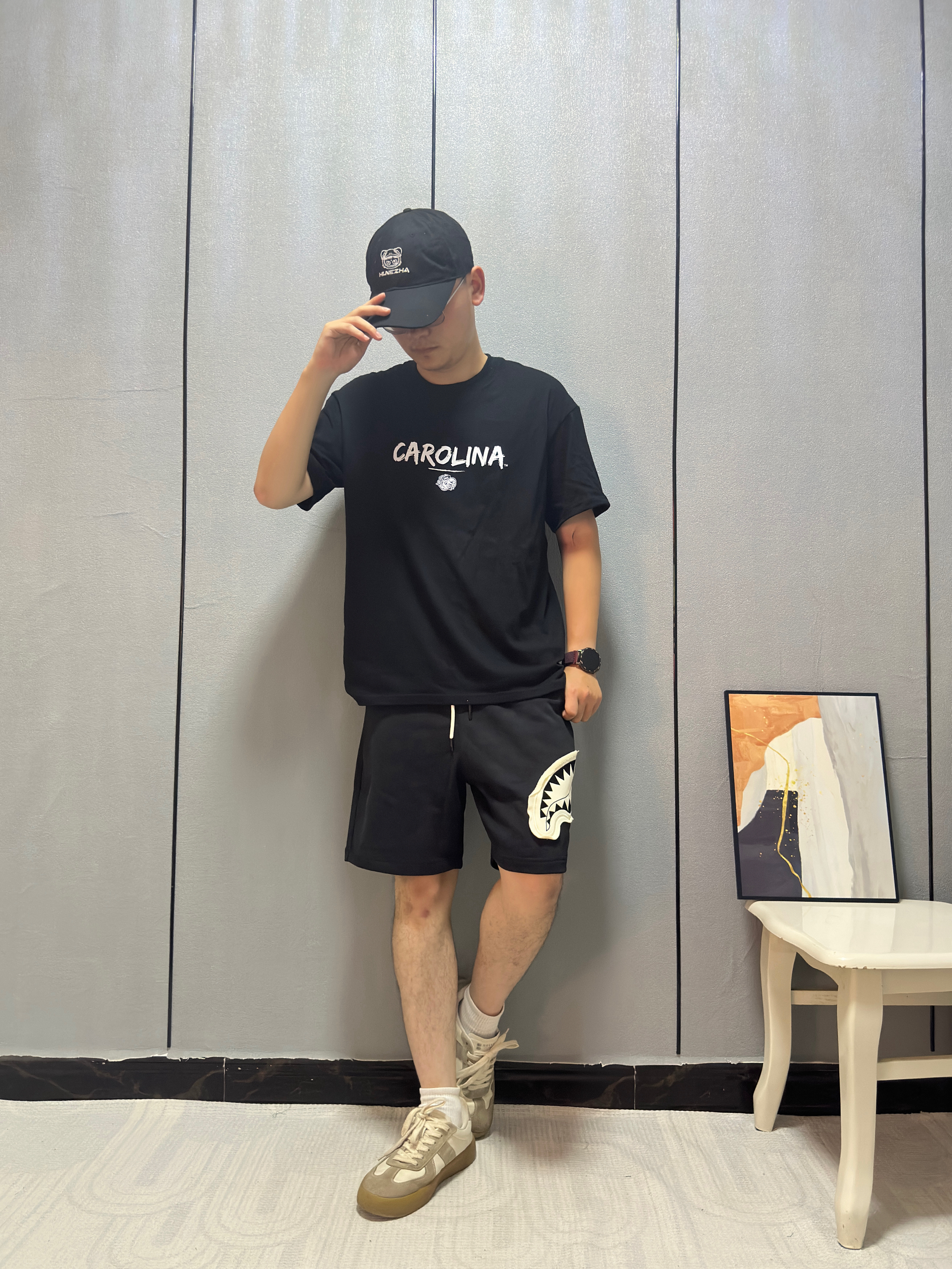 今天胸口鲨鱼🦈logo直接破局! 短裤挑了大面积贴布+撕边破坏设计 毛边啃得够野 🩳: SPRAYGROUND 搭配心机↓ ⚫️黑白对撞:logo白牙咬破沉闷 视觉瞬间跳出来 👟 踩双厚底黑拖鞋,增高不说 暗戳戳接住上衣底色 高温天这么穿——布料少但细节炸 #SPRAYGROUND