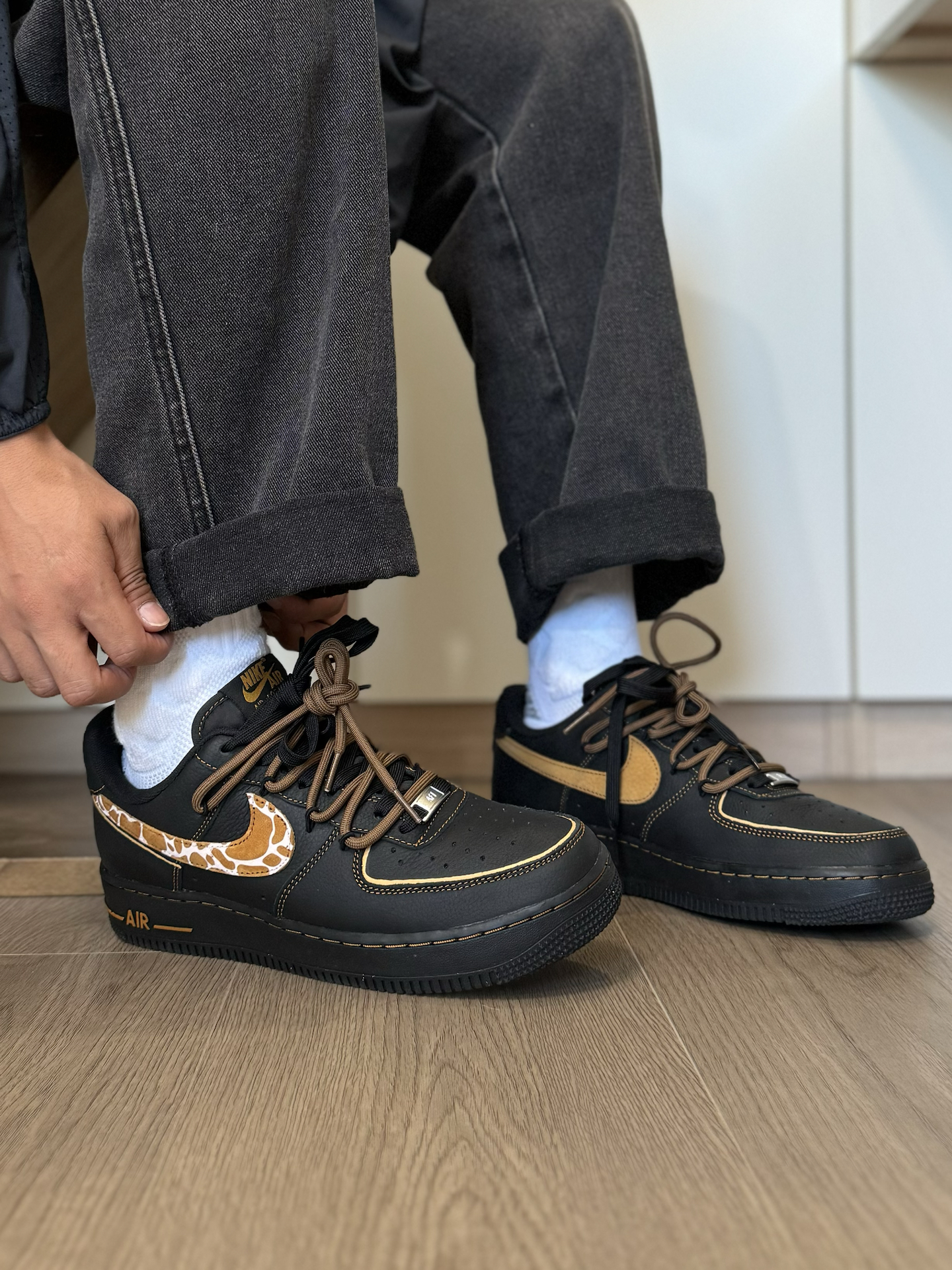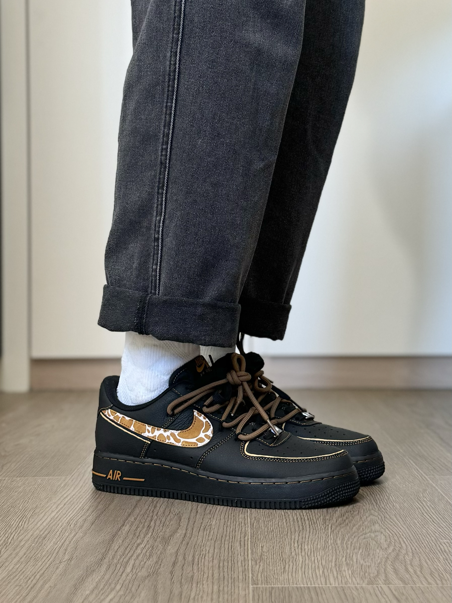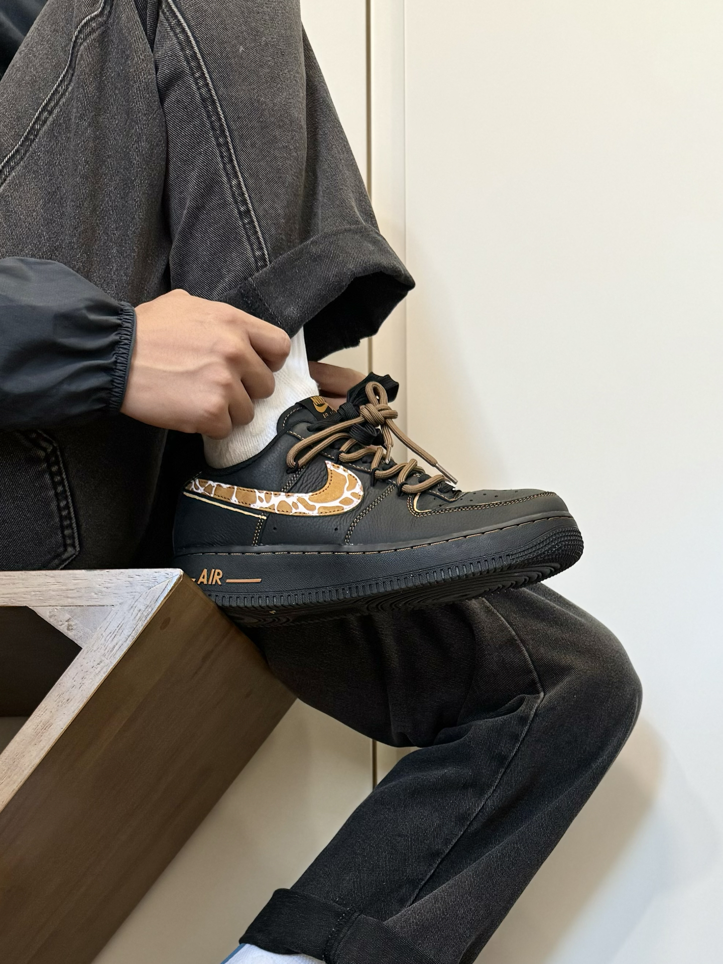 喜欢AF1的鞋型 又不想千篇一律!?给你们分享一双好看好搭 同时又很有个性的AF1板鞋~ 黑橙的配色 加上一点豹纹点缀 搭配双鞋带的设计 帅是真蛮帅的 上脚我很喜欢搭配一些牛仔裤 不怎么不挑风格 就是尺码方面 脚特别瘦的 建议适当选小半码… #可以定制的好礼物 #拿捏复古松弛感 #给度假计划配双鞋 #长期主义鞋子 #开箱心动好鞋