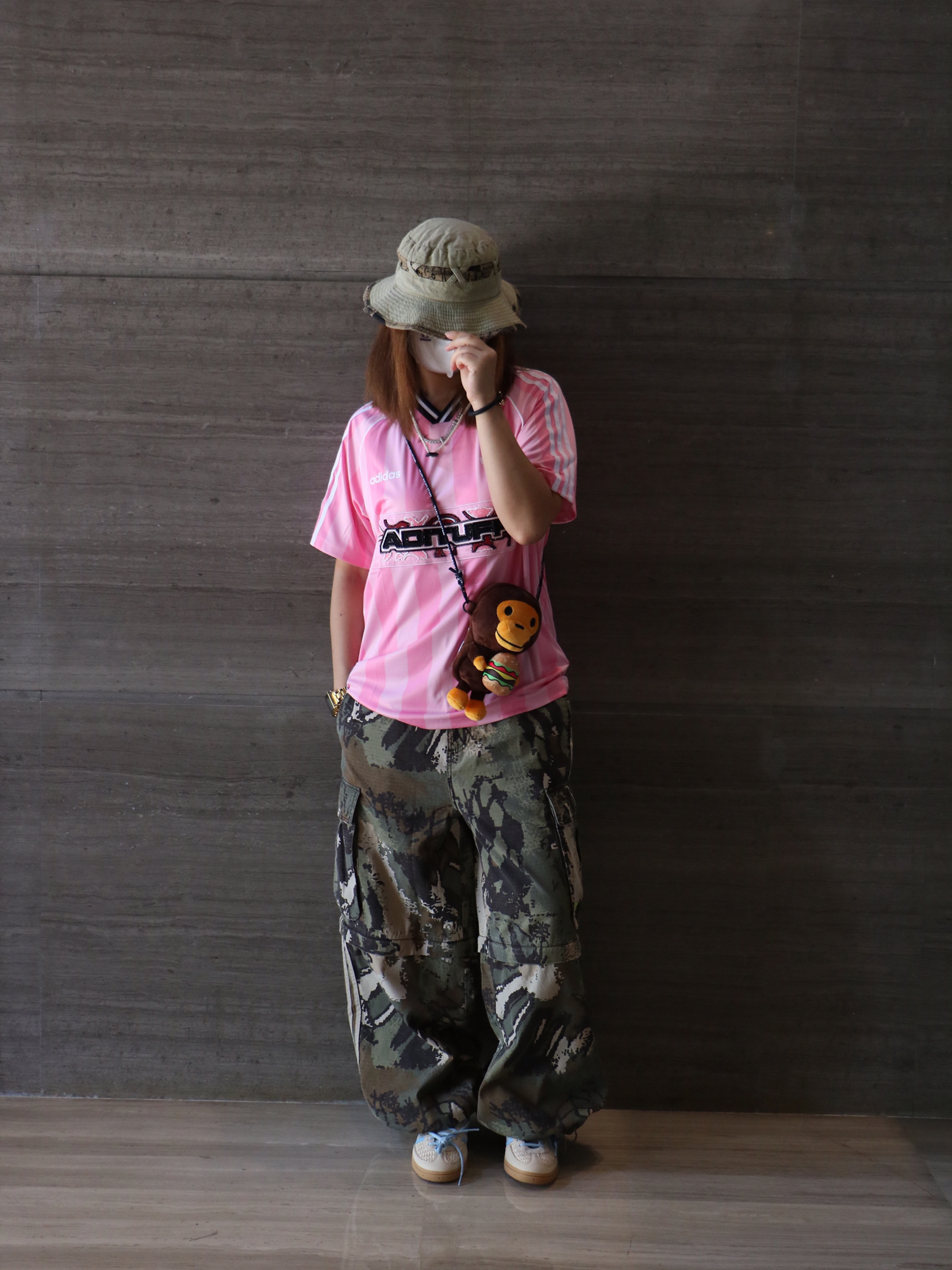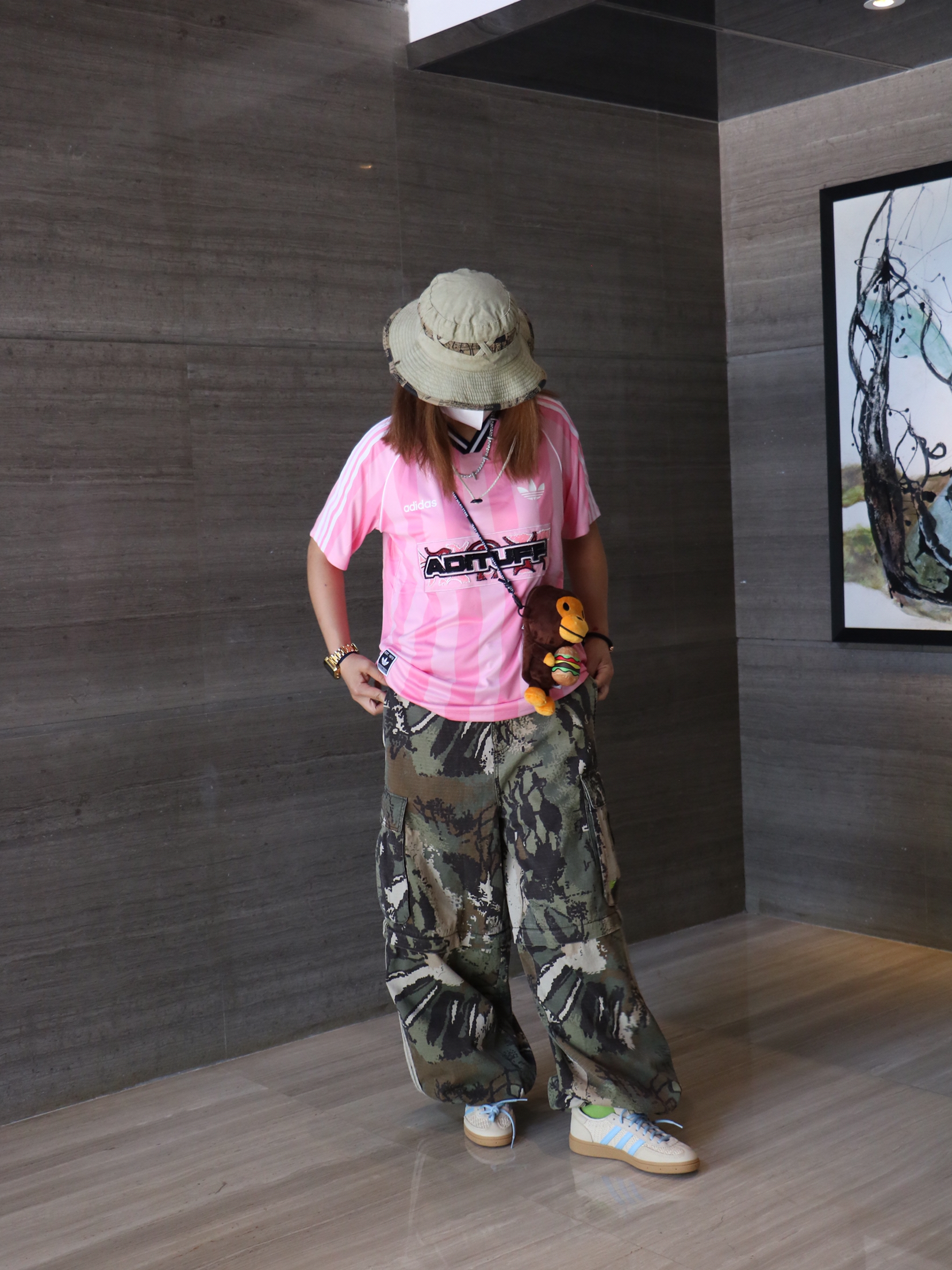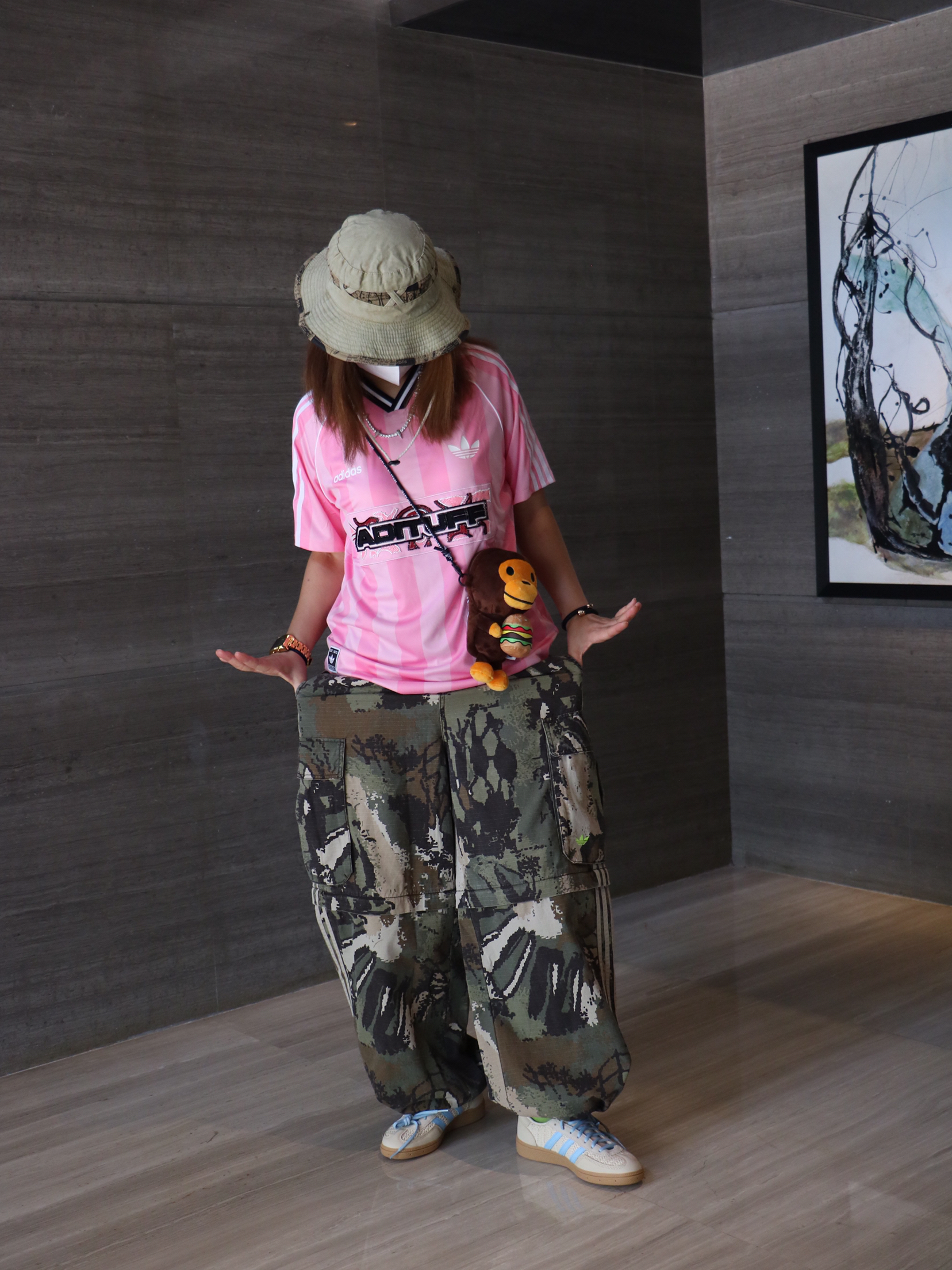 夏日休闲出游穿搭分享 上衣: 阿迪达斯 字母 印花logo长袖T恤 下装:迷彩直筒多口袋休闲裤 鞋子:阿迪达斯 薄底鞋